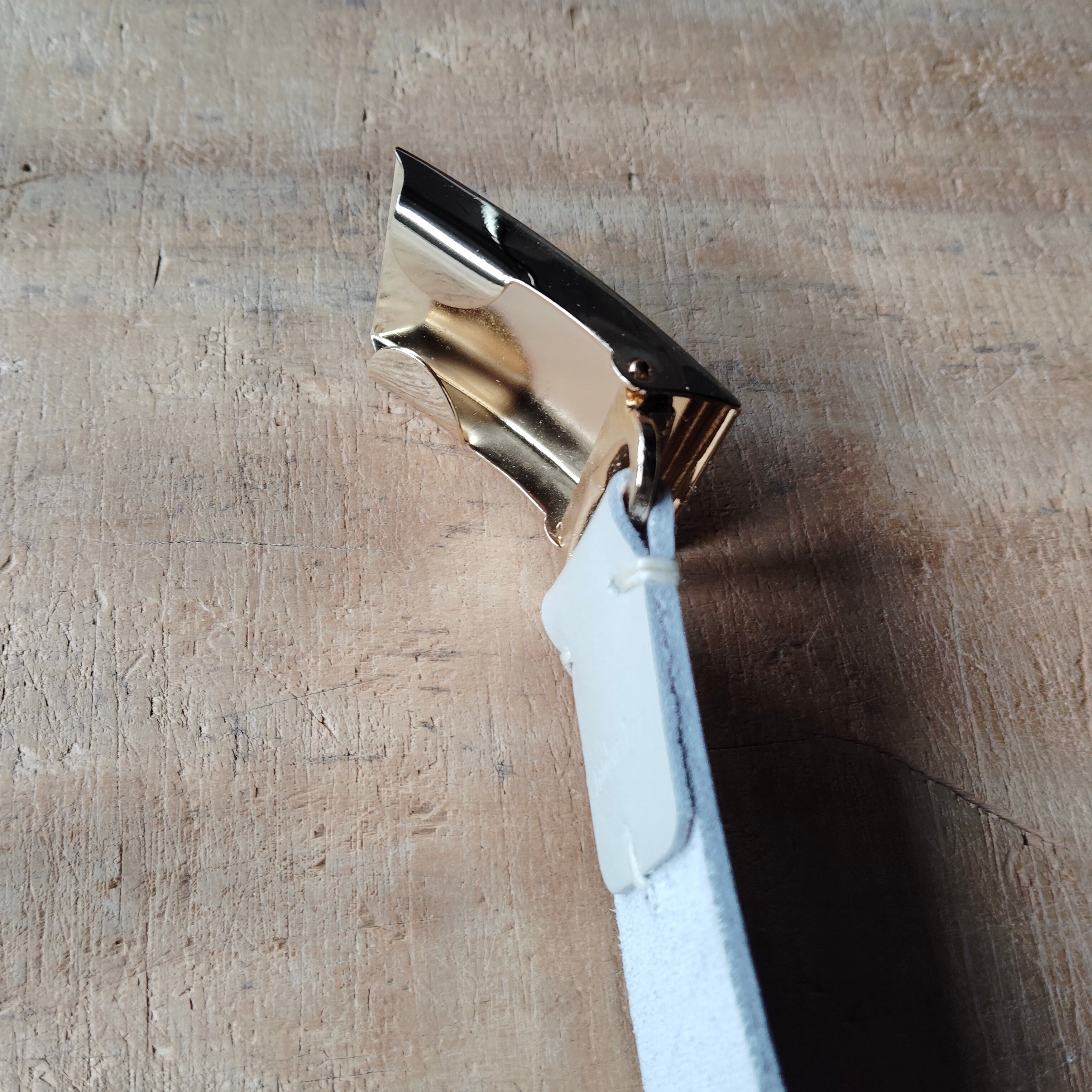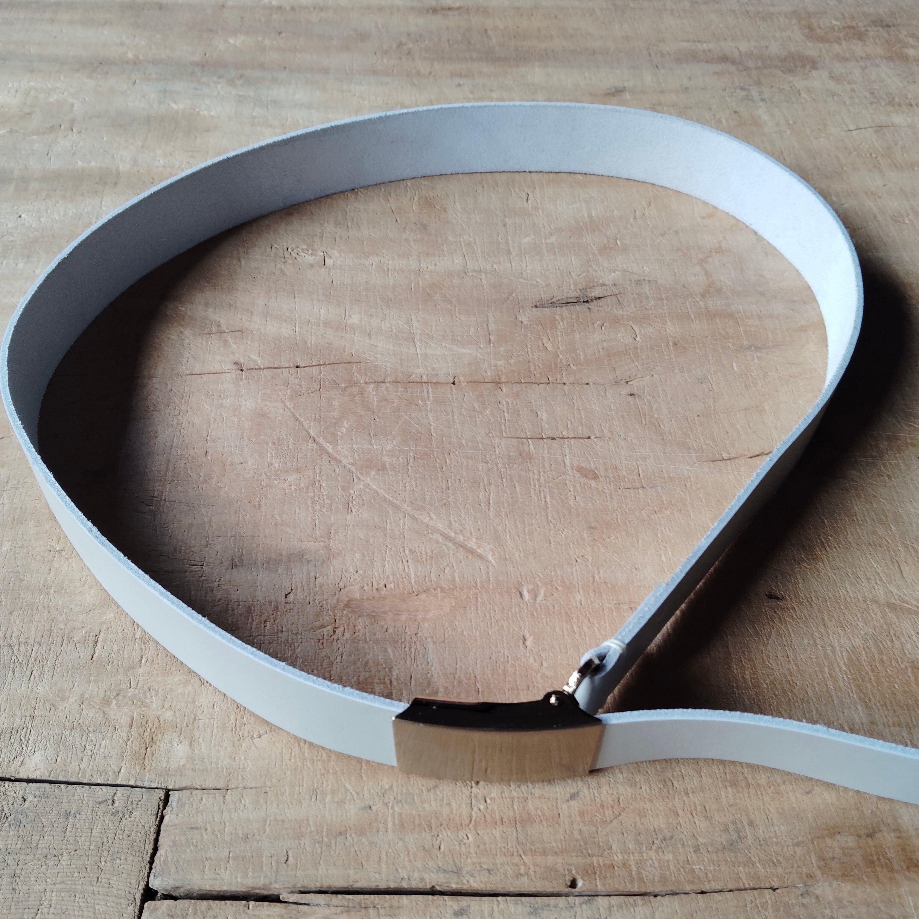 ライトグレーの革とホワイトゴールドメッキの全面にだけヘアライン加工を施したバックルの取り合わせが洗練されていて、とてもいい感じです。