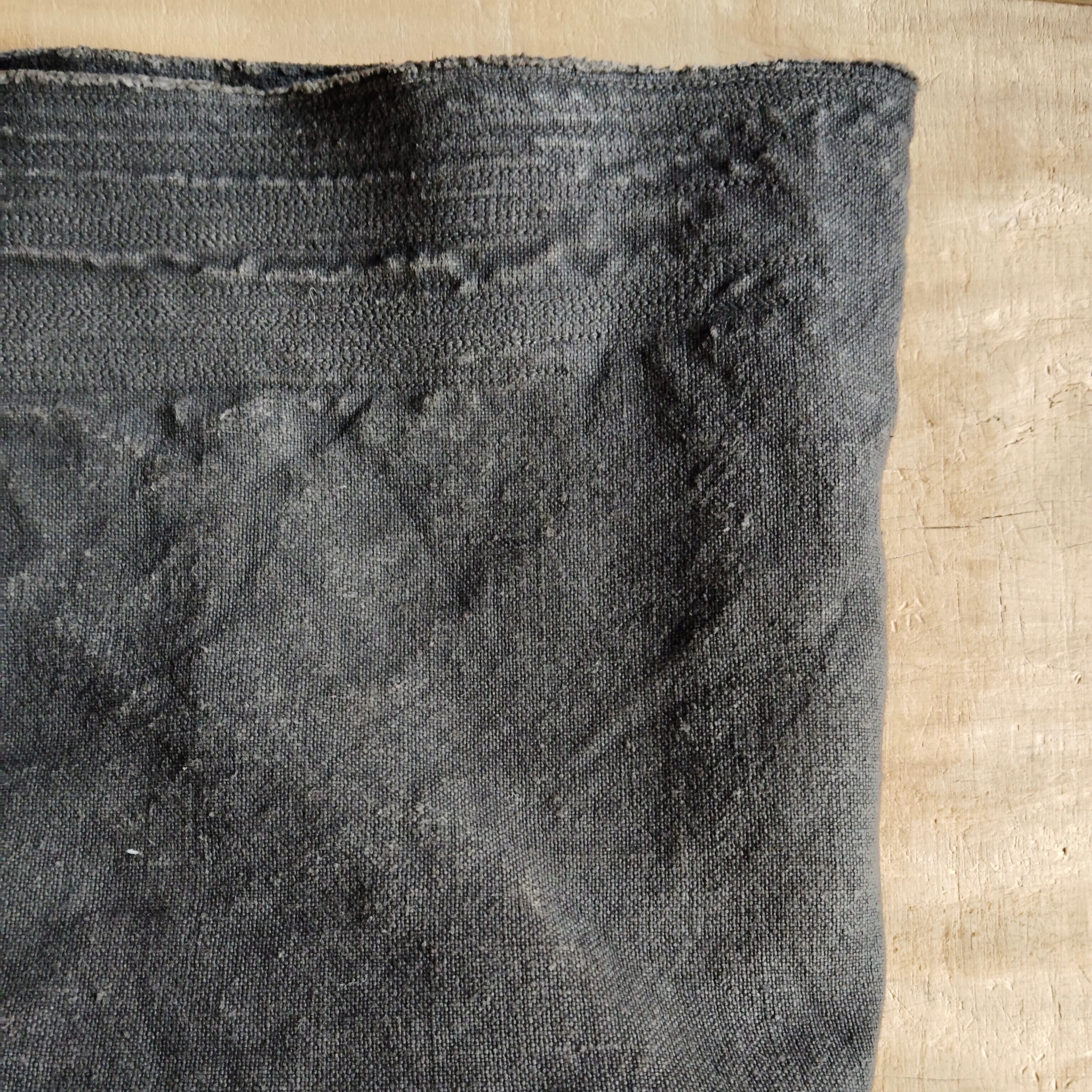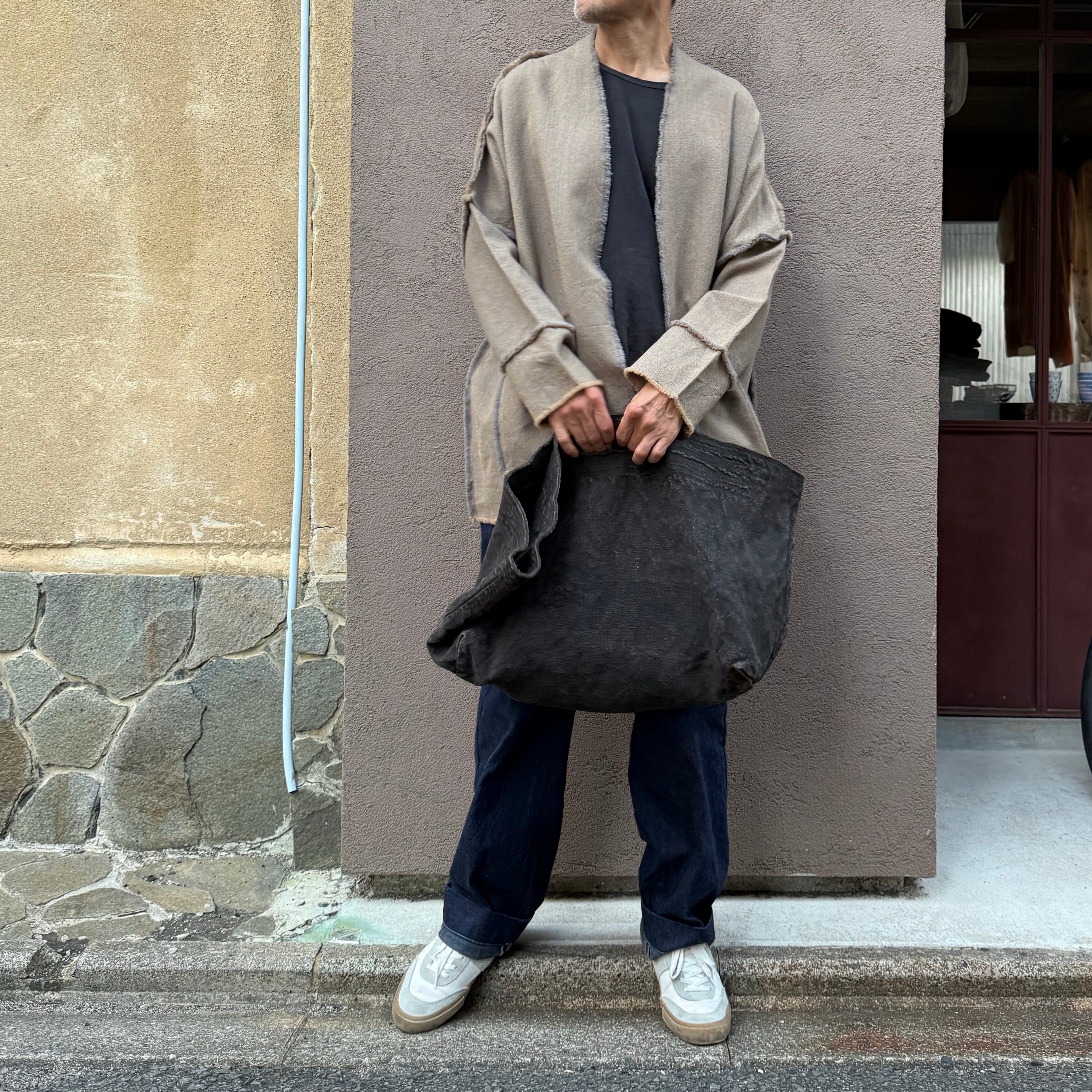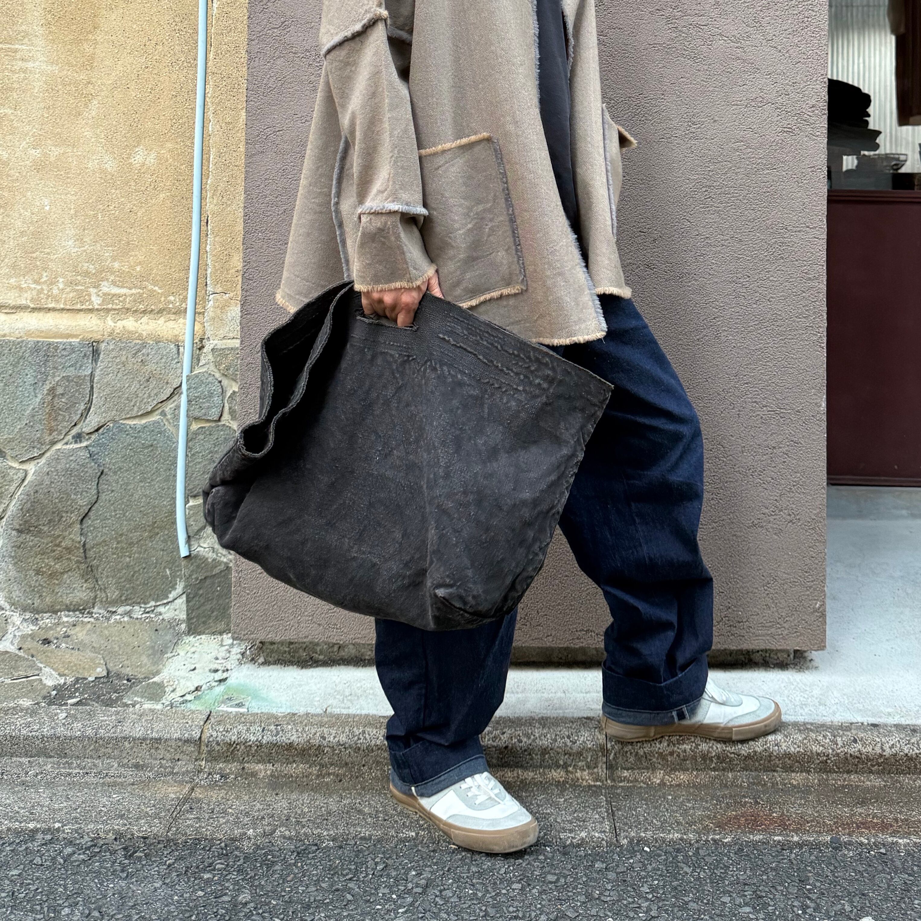 リネン100%の生地にベンガラ染めでブラックに濃く仕上げた布をダブル使いでがっしりとした重厚感をもち、丈夫さを持ったバッグ。