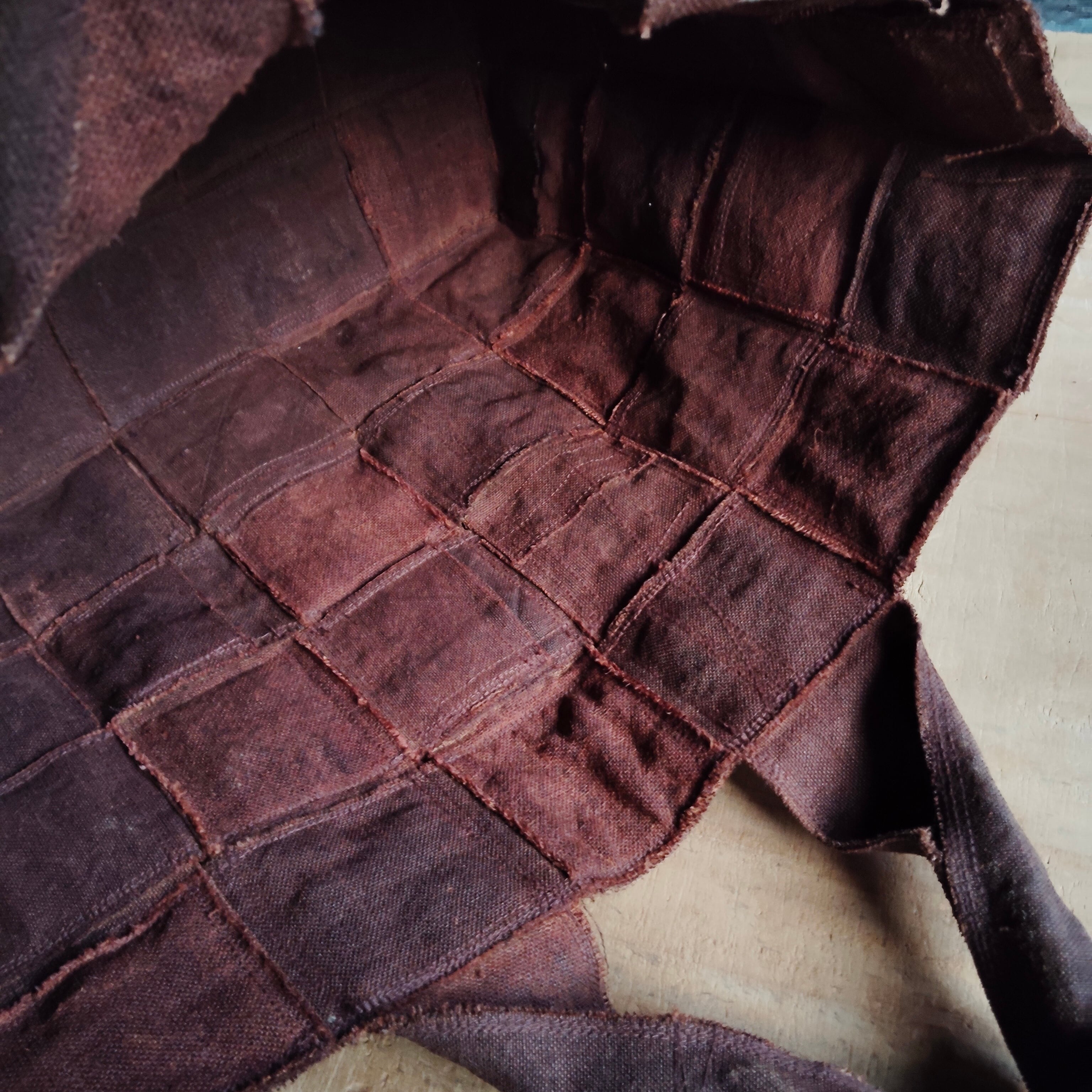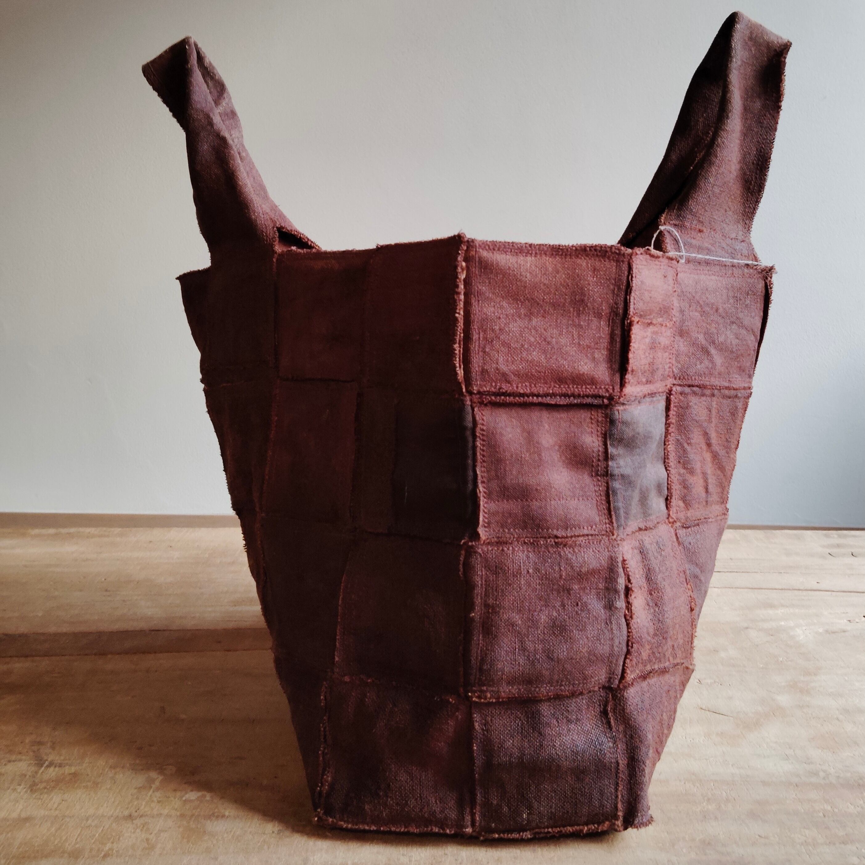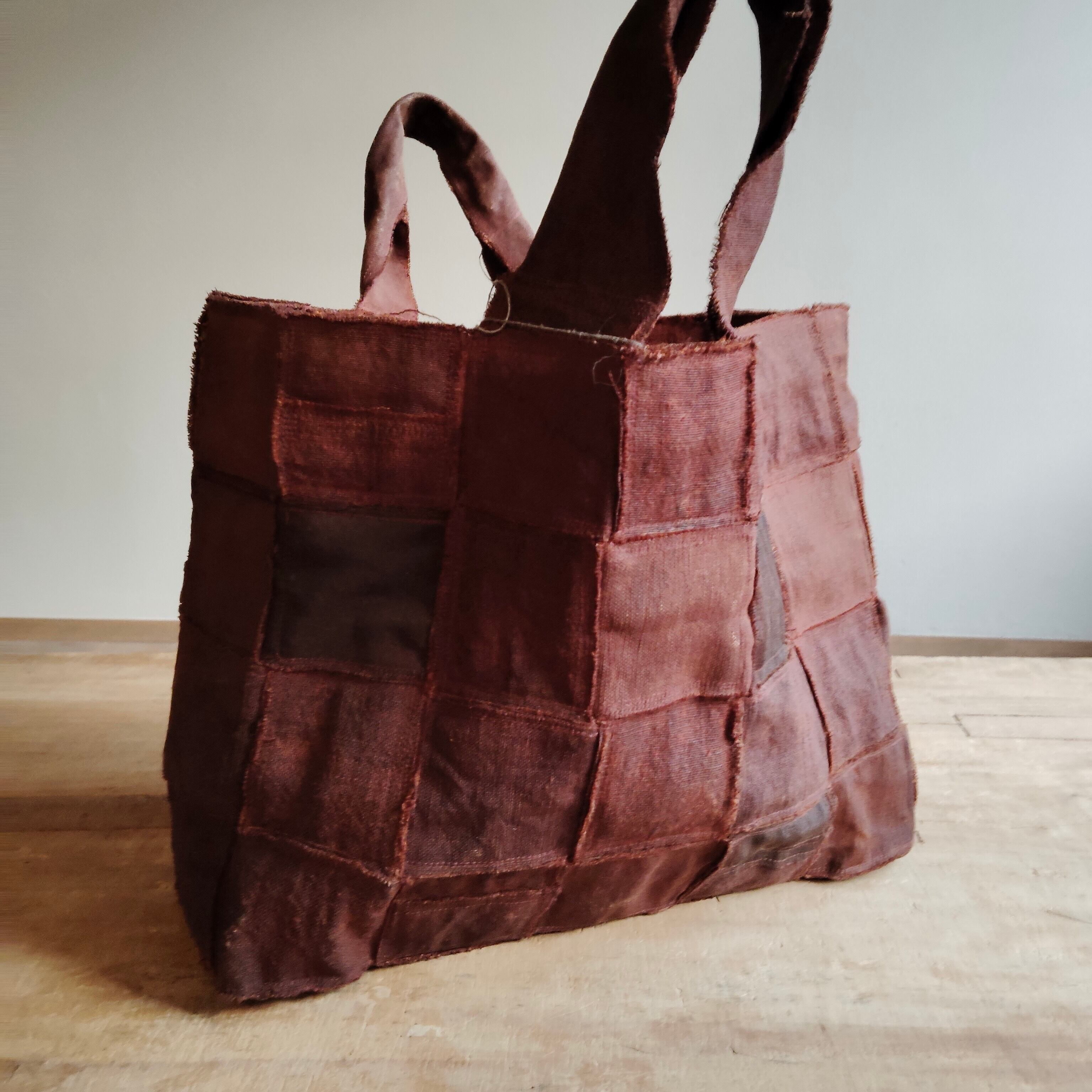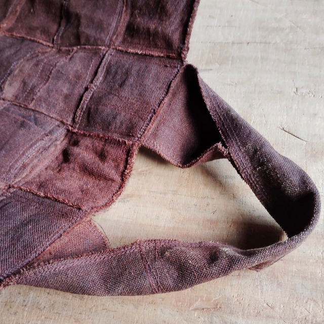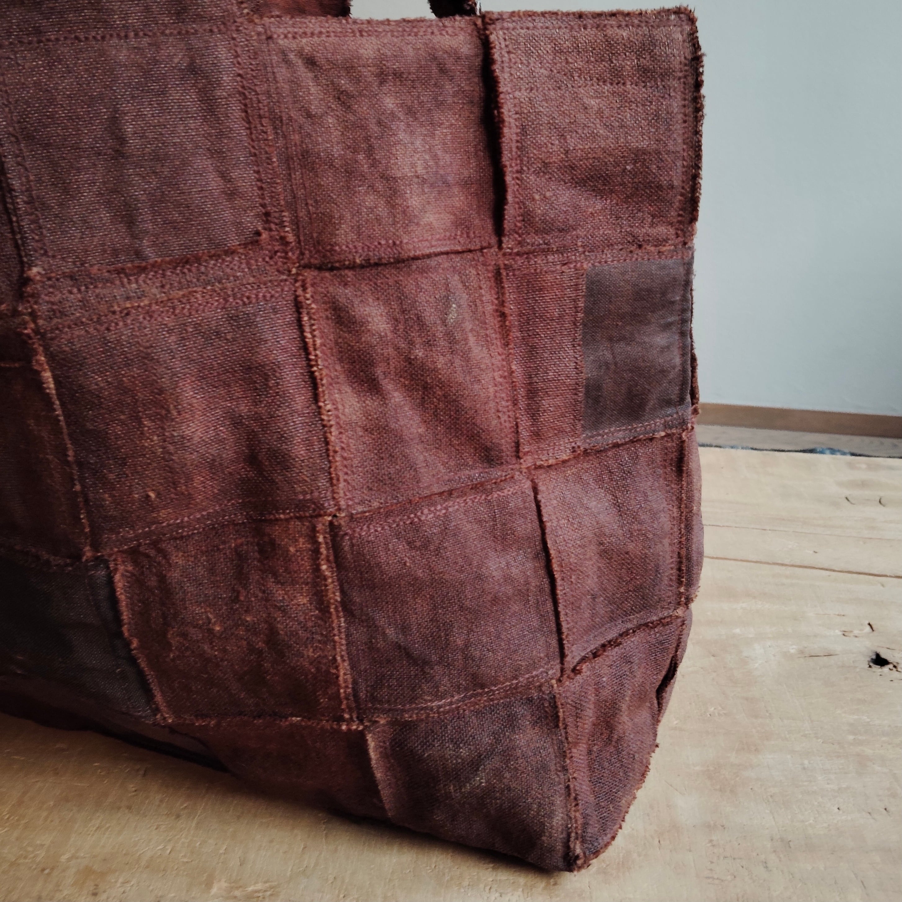 リネン100%の生地にベンガラ染めでブラウンに濃く仕上げた布を帯状にし、それを編み込み無用して格子柄を表現したバッグです。生地使いがダブルでがっしりとした重厚感をもち、独特な存在感を放ちます。