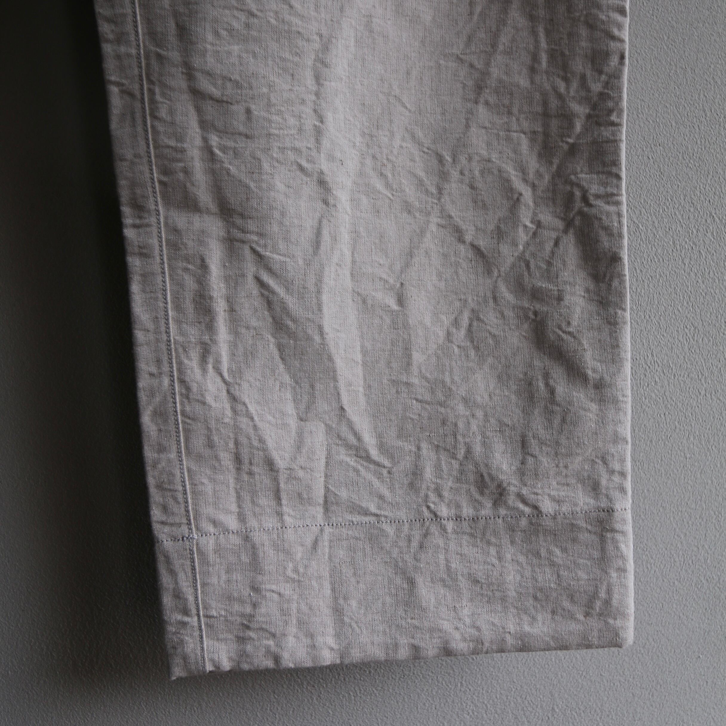 しっかりとした丈感のあるワイドストレートのパンツです。20番手の太めのステッチを使用し、ベルトループを太めに設定し、裾の見返しを大きくとることで、無骨な印象を与えています。後ろにはパッチポケットではなく、片玉縁ポケットを採用し、腰紐には京都・宇治で製紐されたオリジナルの紐を使用しています。
