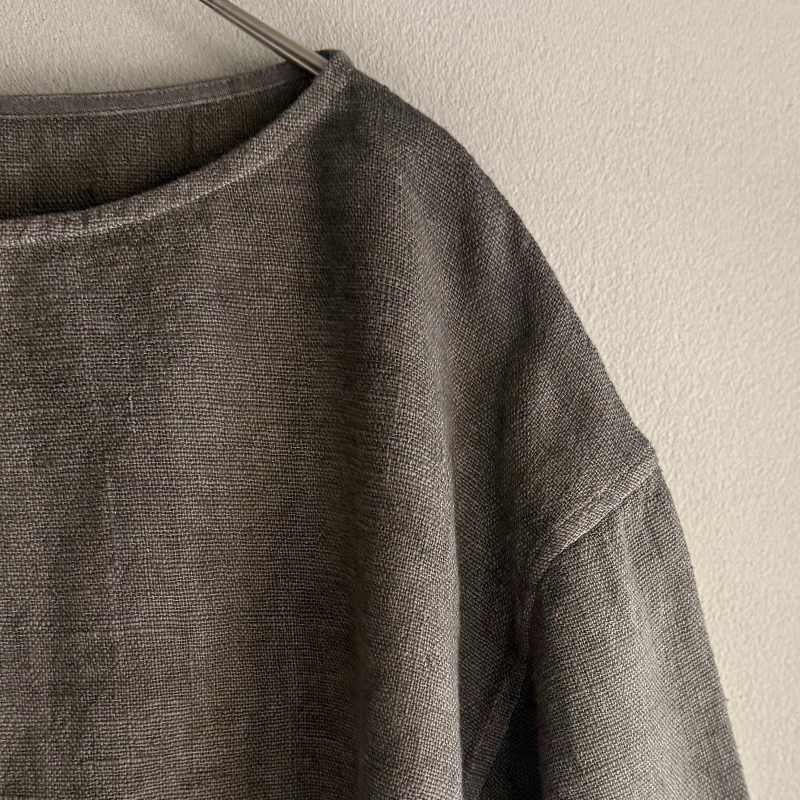 肌なじみの良い生地をそのまま使用し、プルオーバーとしてTシャツのように気軽に着用していただけるデザインです。ワイドシルエットのため身体と空間が空くことで、生地感と相成って多くの方に快適に感じていただけます。袖口はカフス仕様になっており、そのまま折り返して着用することができます。また、カフスのスリット部分には放射状に補強STがあり、耐久性にも配慮されています。