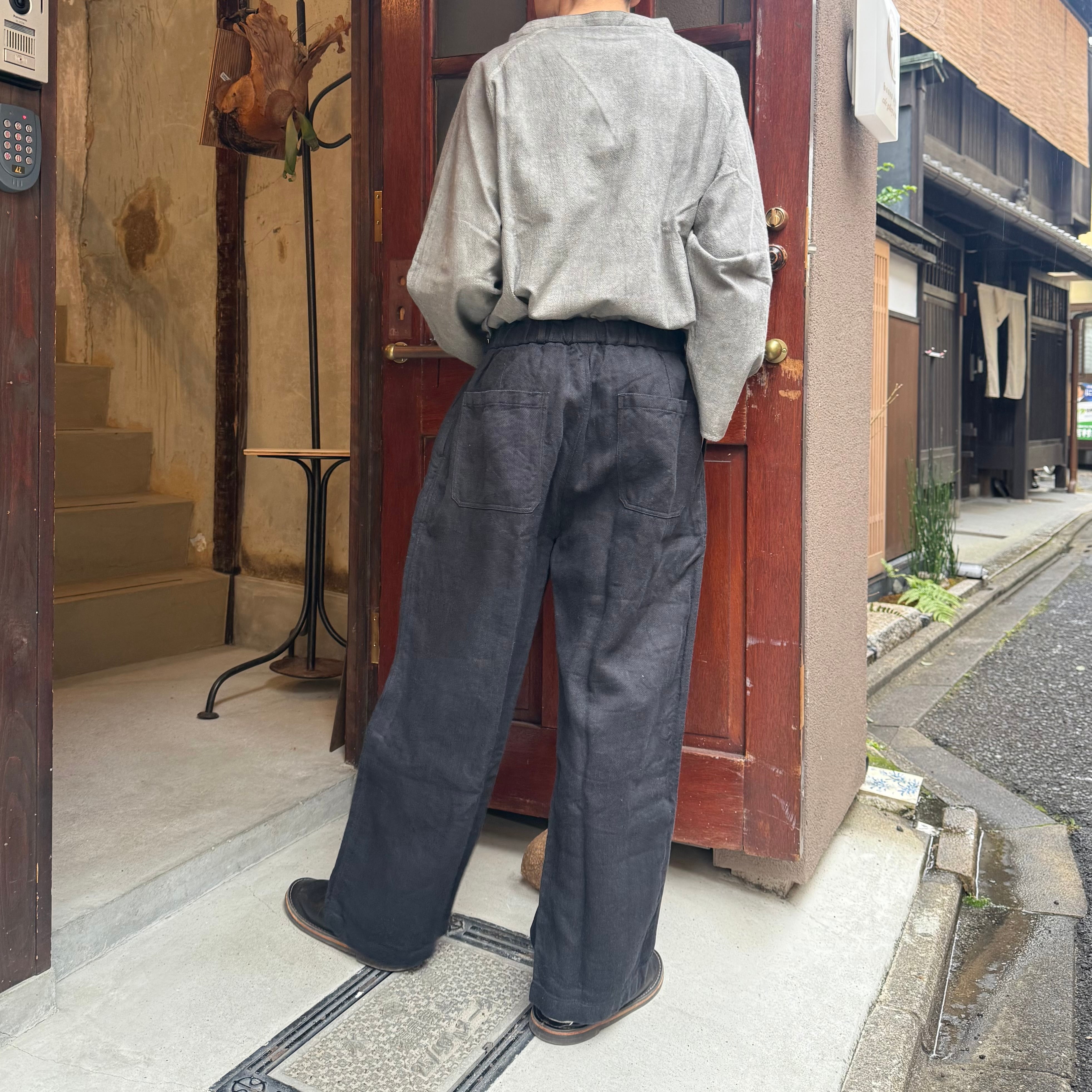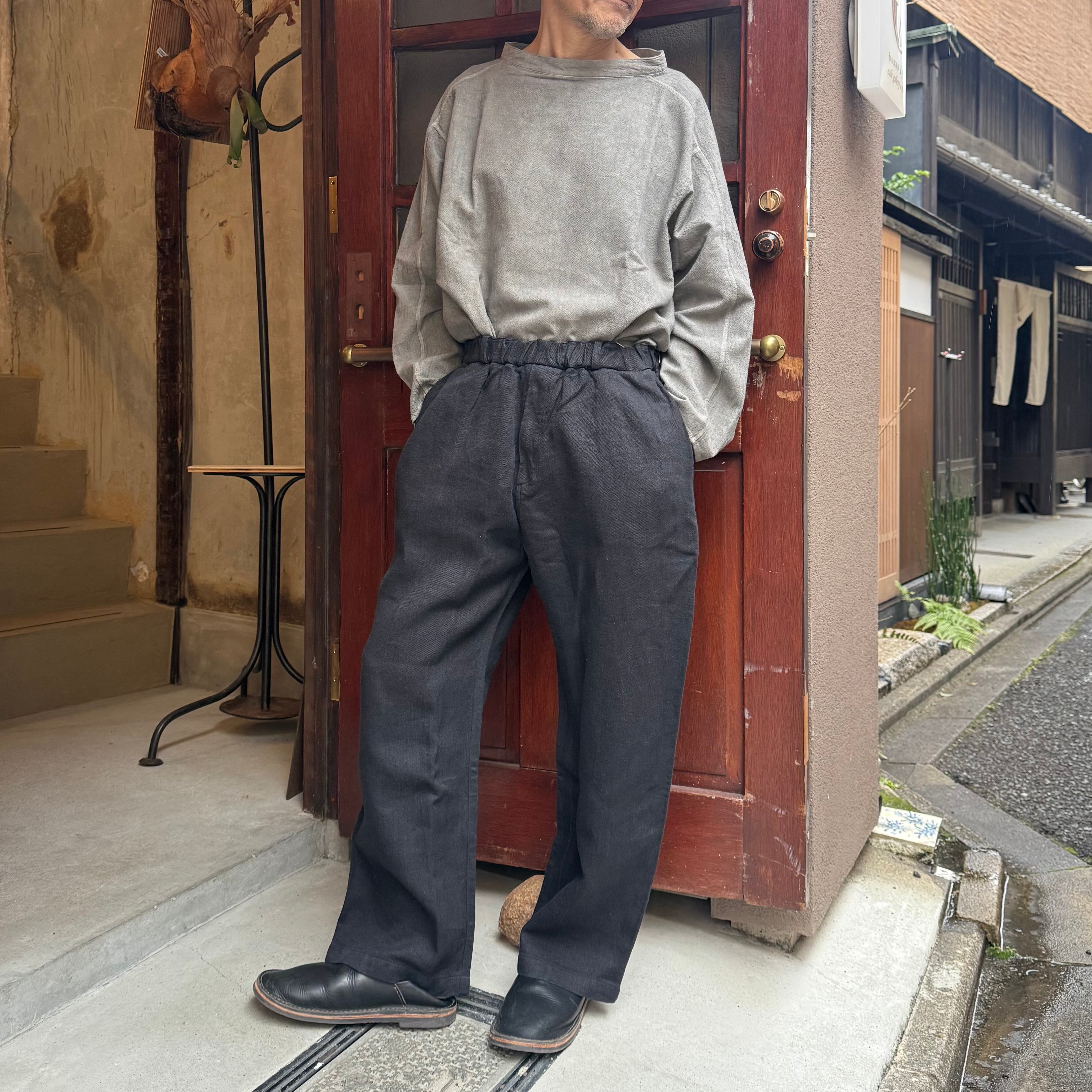 ウエストゴムと内側のオーガニックコットンの紐で、ベルトを用いなくても着用が可能ですが、ベルトループが付いていますのでお好みで使い分けいただけます。パターンはPT-69をベースに、裾幅を太くしたストレートシルエットとし、後ろポケットも若干大きくしています。