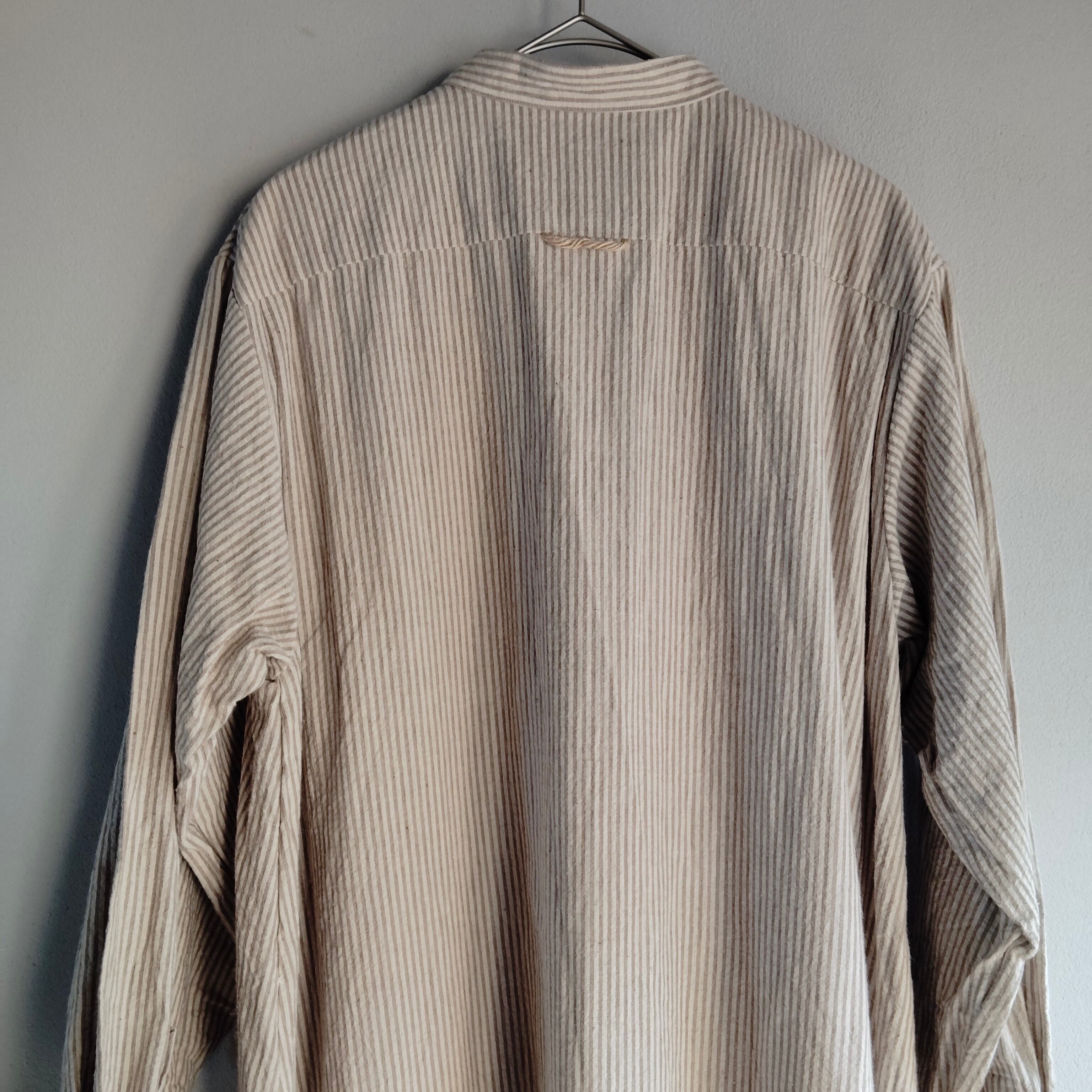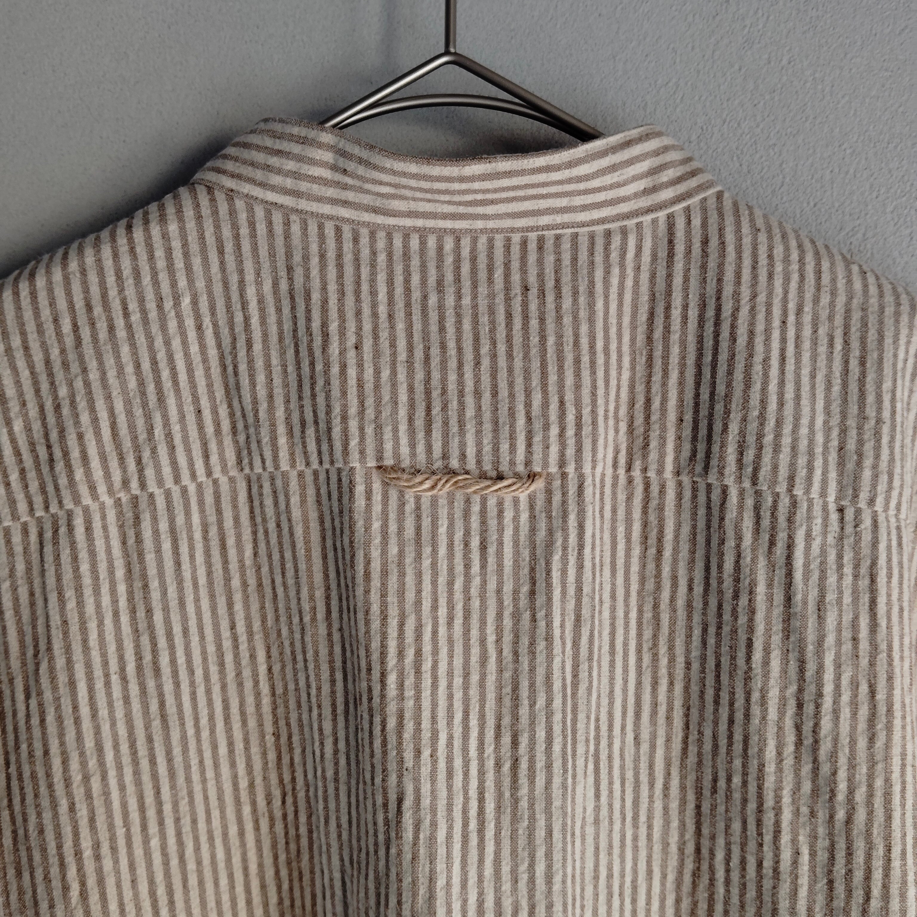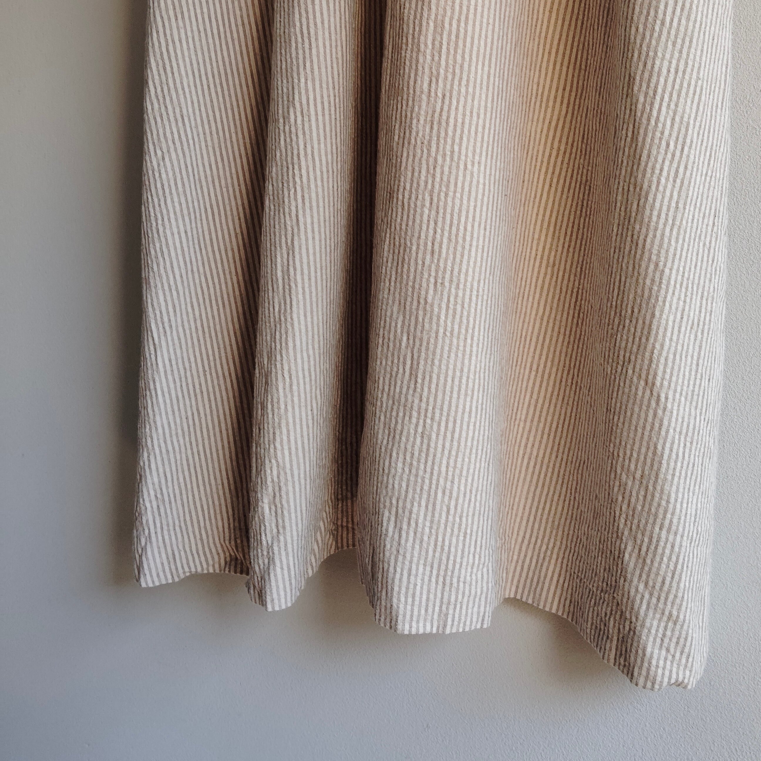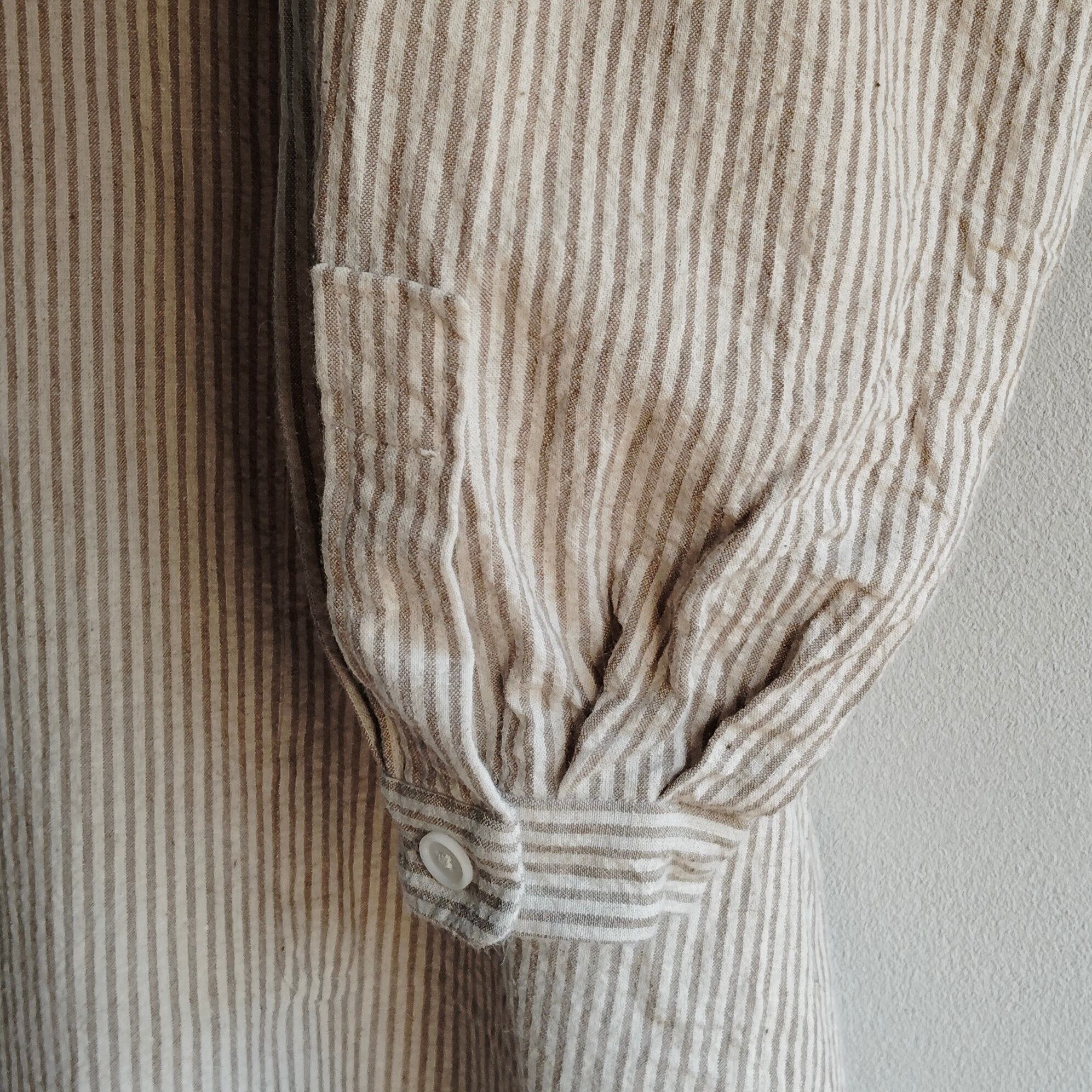 さらりとした肌触りのコットンリネンの生地はブラウン基調のピンストライプに織り上げられ、洗いざらしたしわ感も表情豊かです。