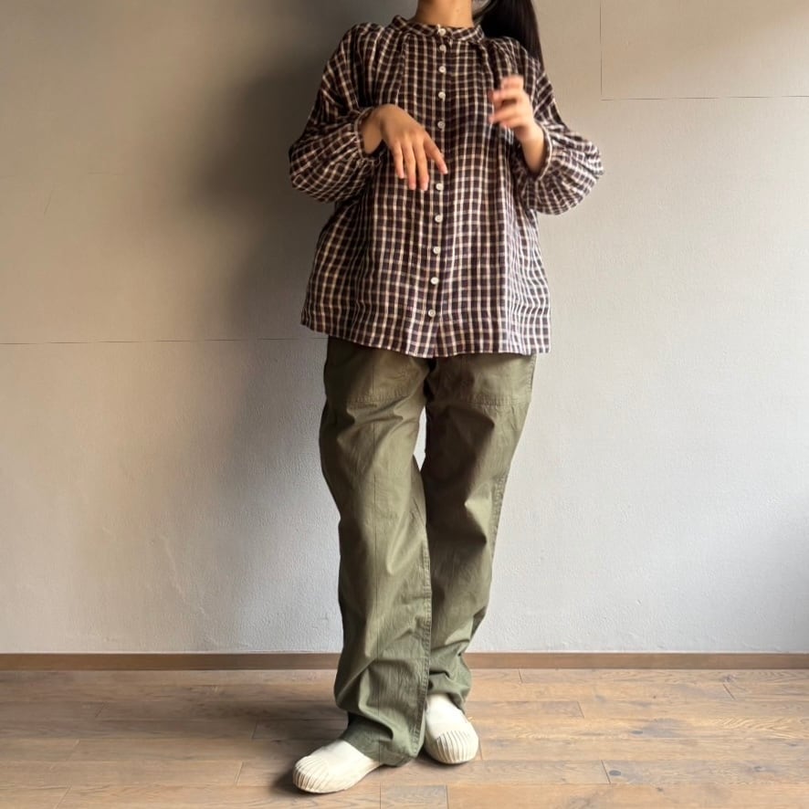 さらっとして肌触りのよいコットンポプリン。腰からウエストまでをすっきりと、そして股部分にはガゼットが付き、マチをたっぷりと足の運動領域を確保した、すっきりとつつ動きやすいユーティリティパンツ。