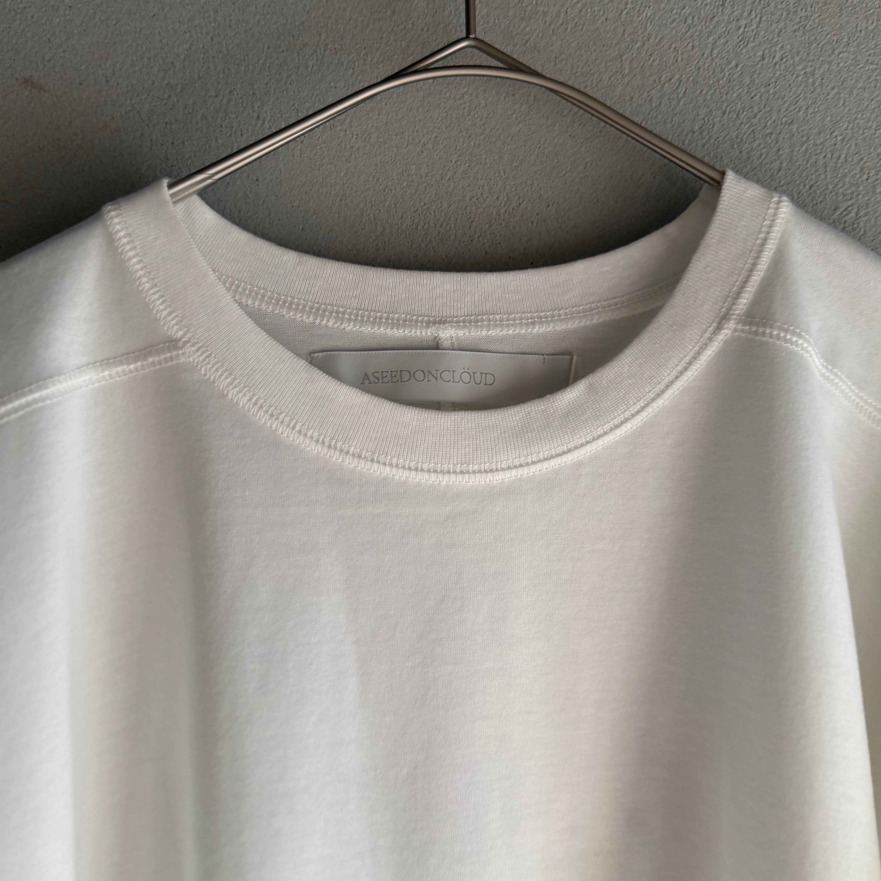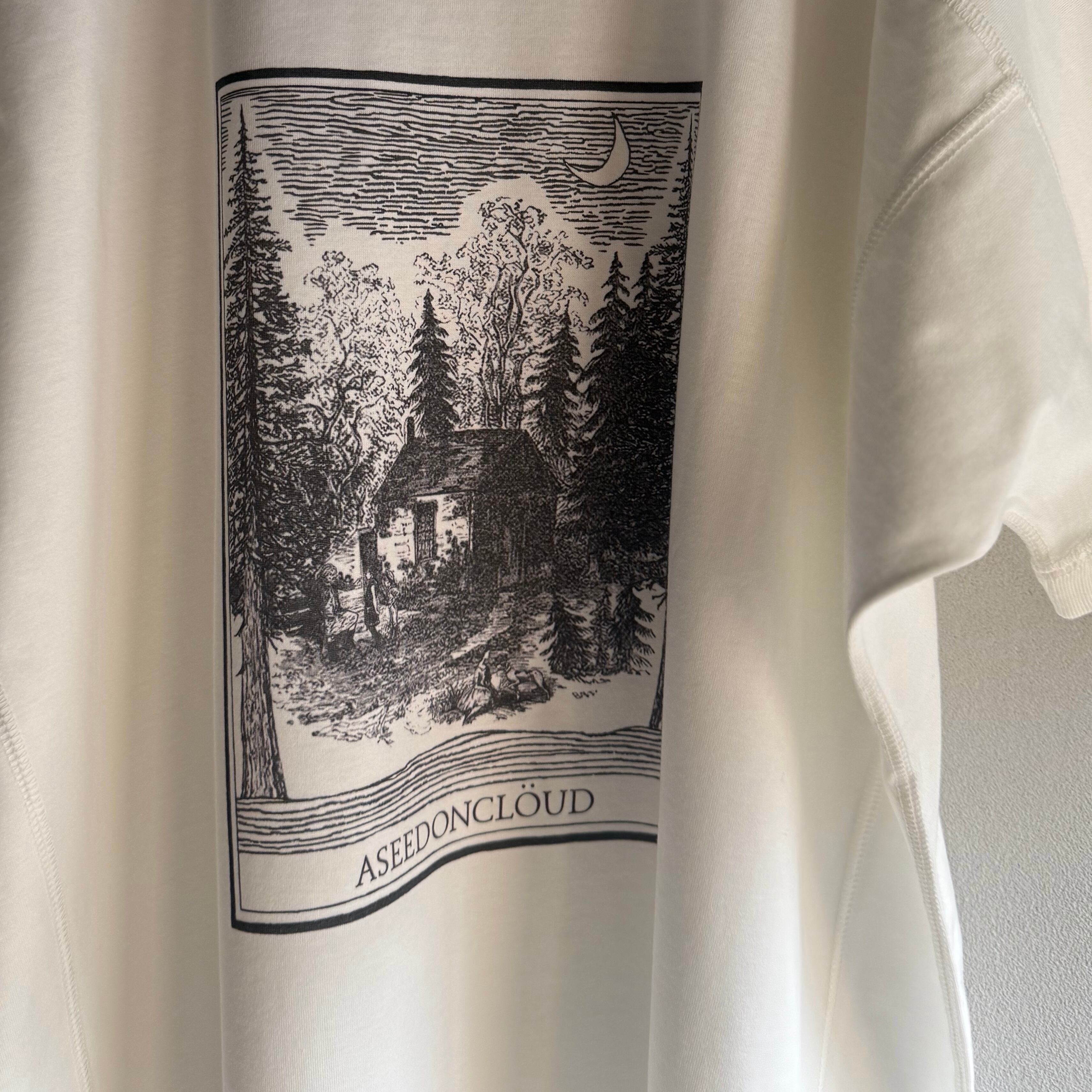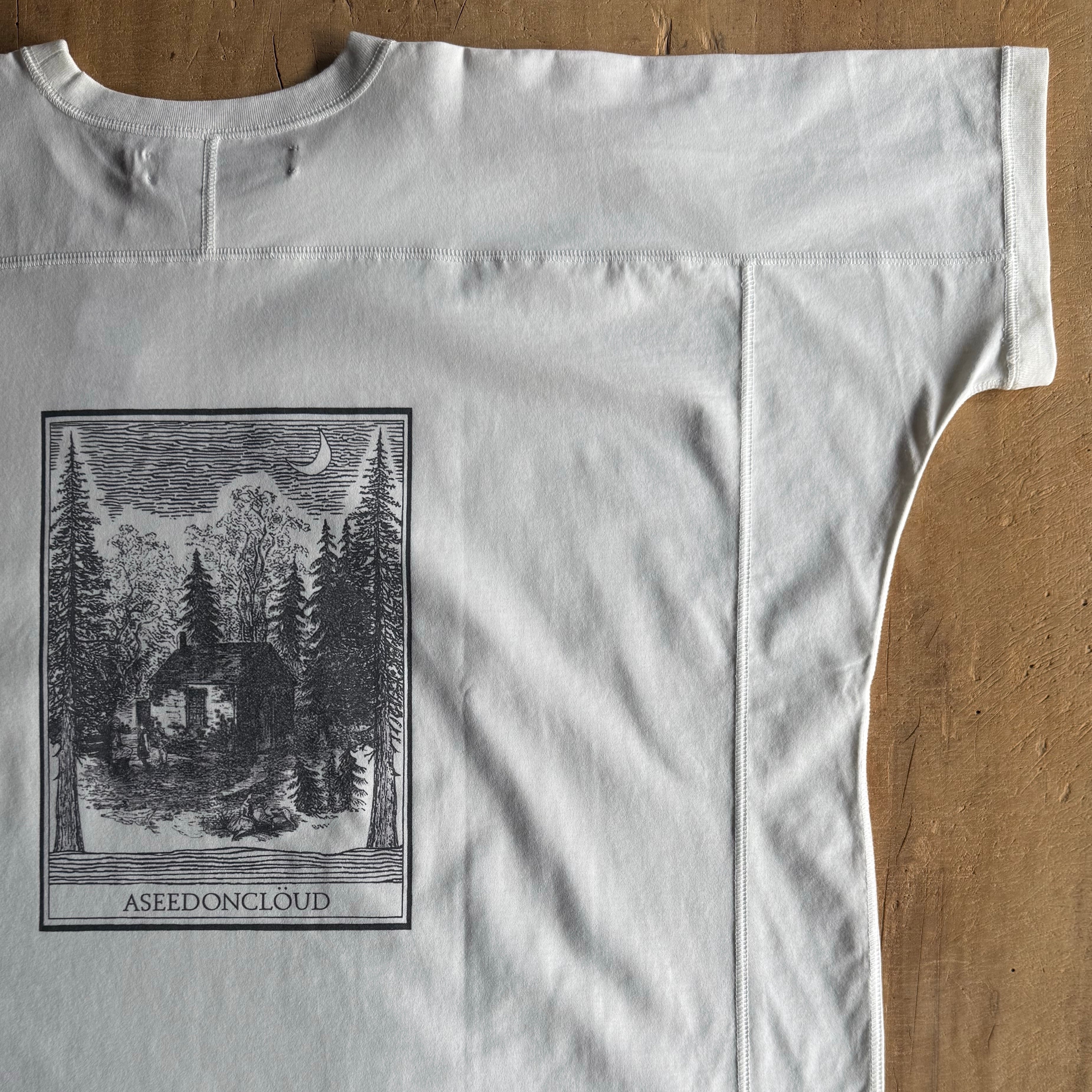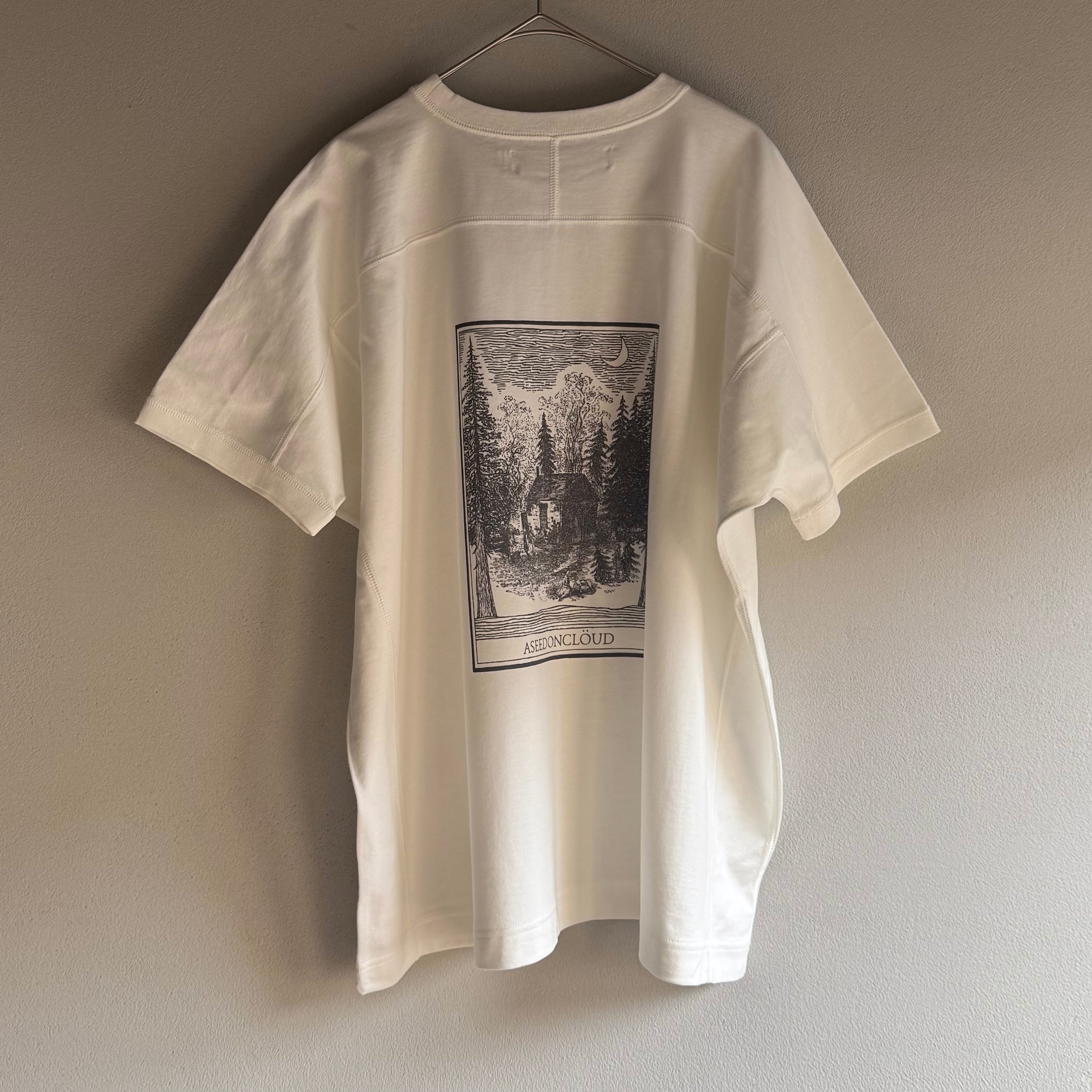 ここ数年、夏の暑さが厳しい中で、アシードンクラウドらしい T シャツを作りたいというところからスタ ートしたアイテム。平置きだと独特な T 字型になっていて、着るとゆったりとした着心地の良いシルエッ トになっています。ベースが同じカットソーに刺繍やプリントを施して、計 4 種類の T シャツを作りまし た。