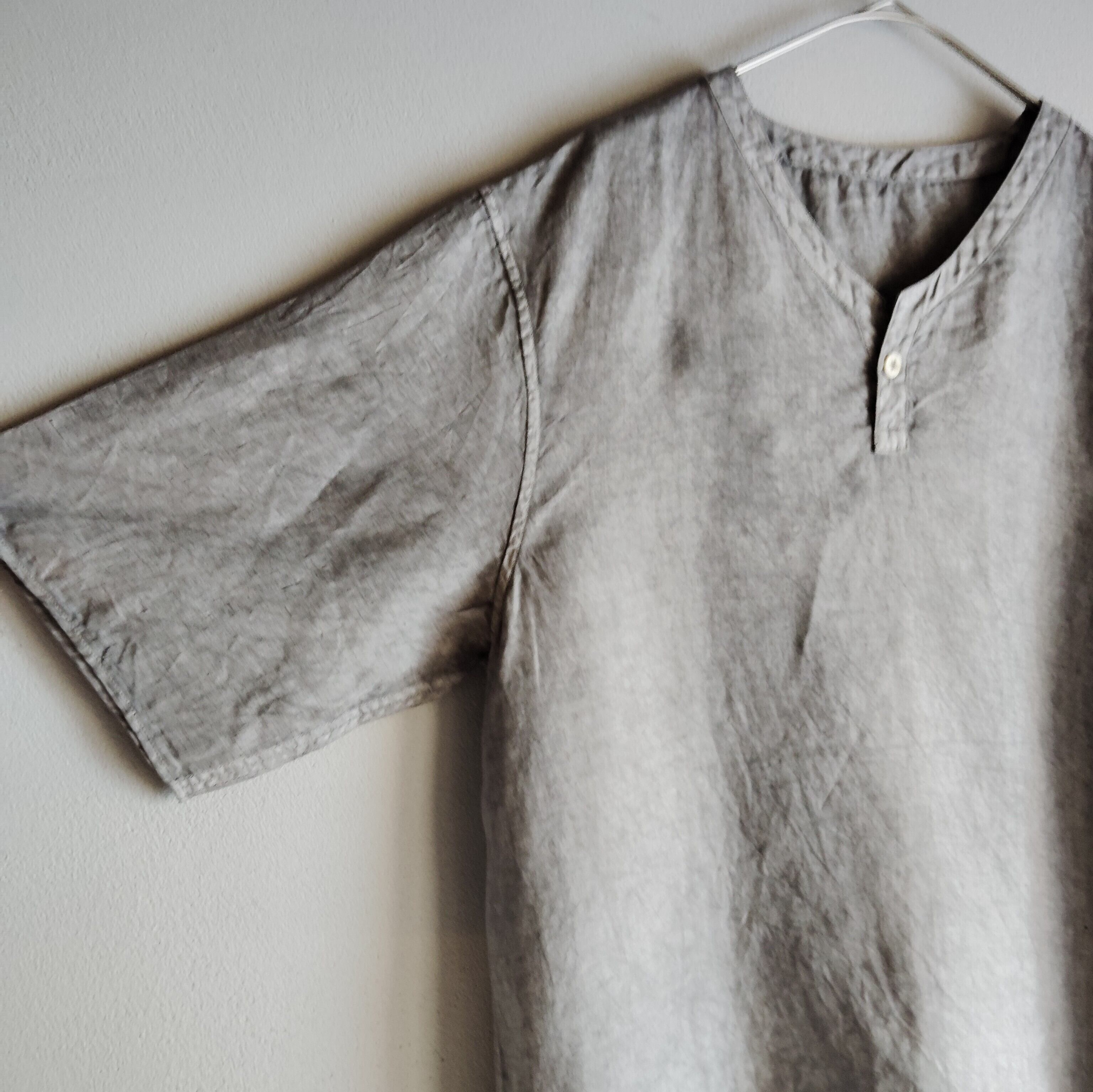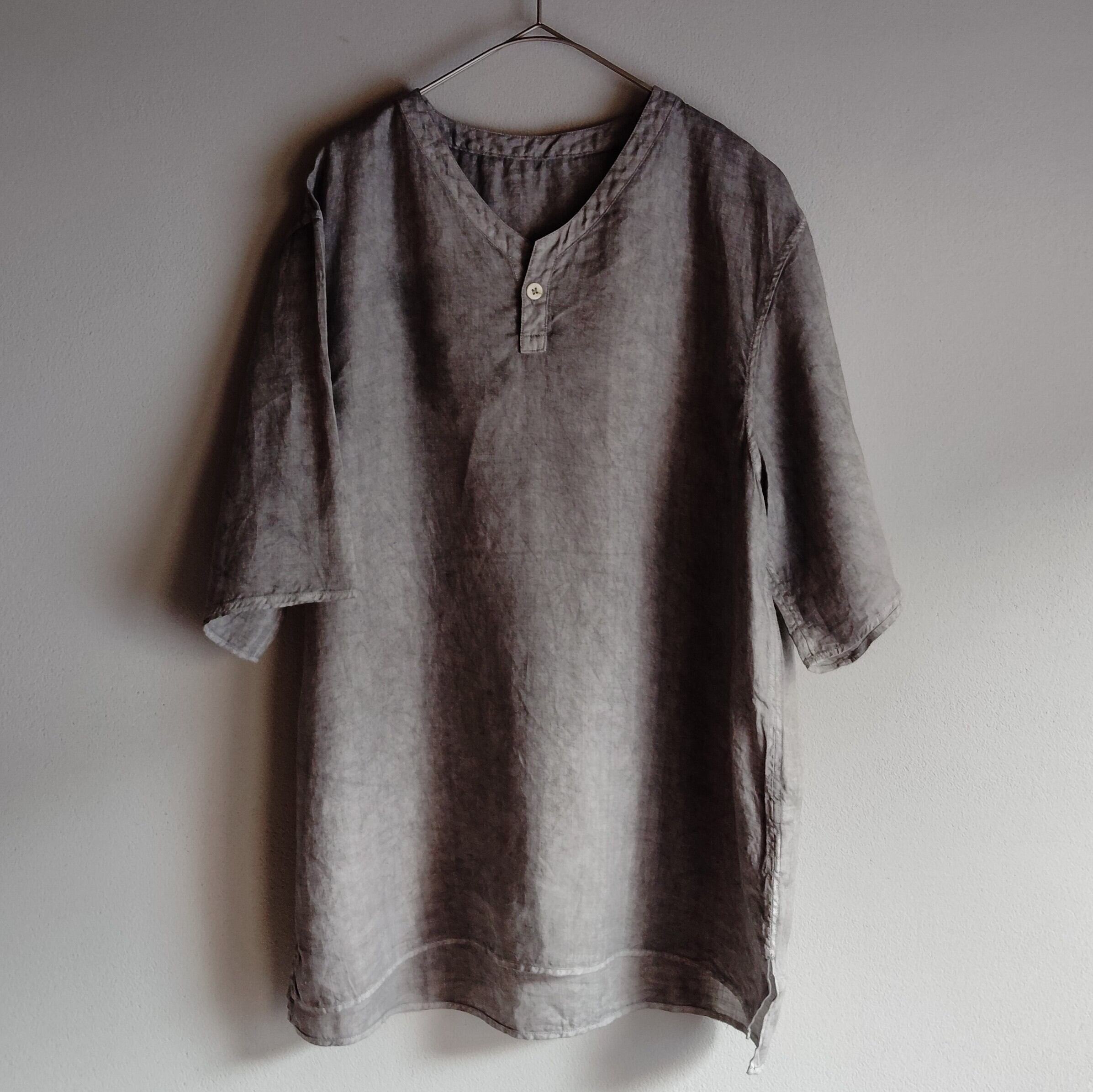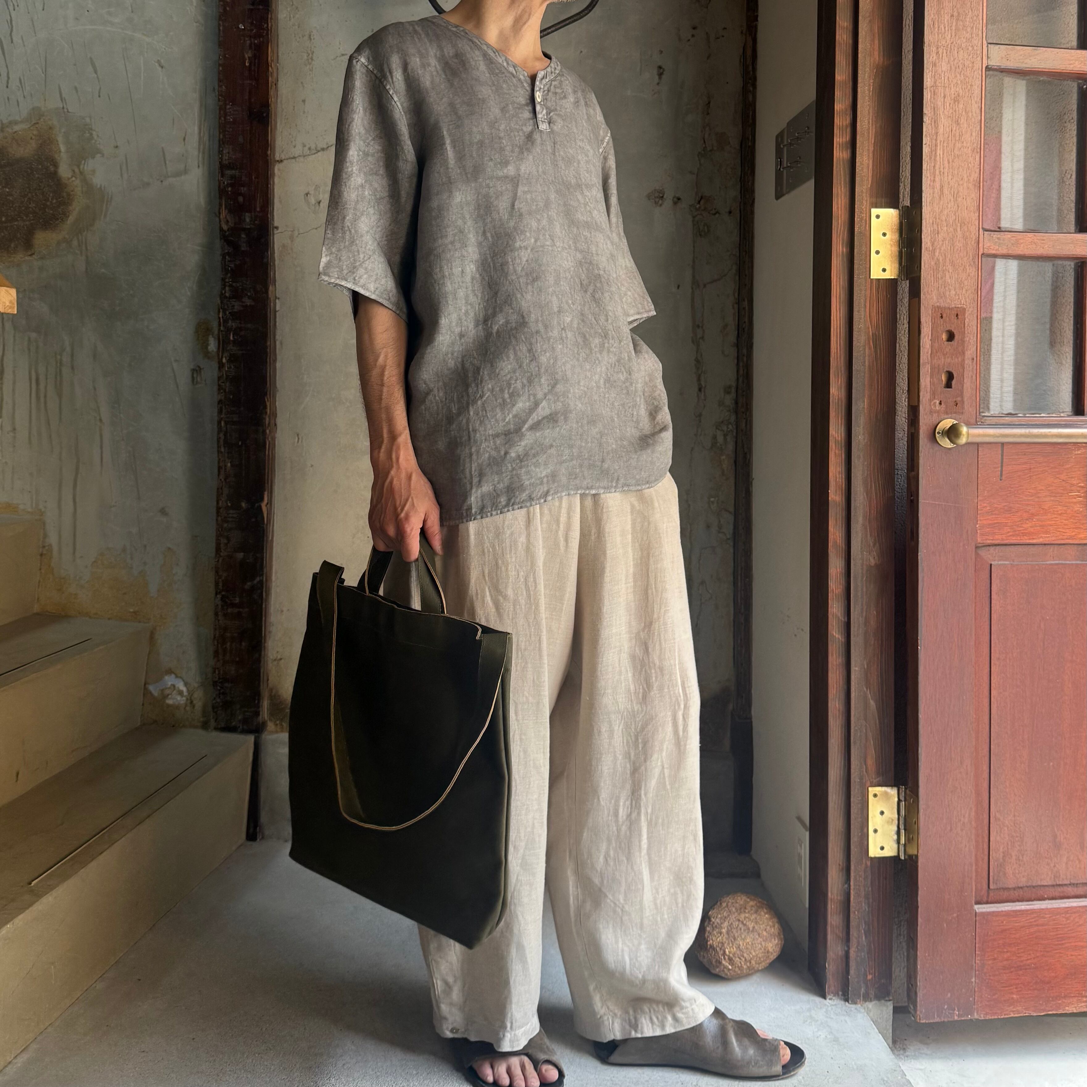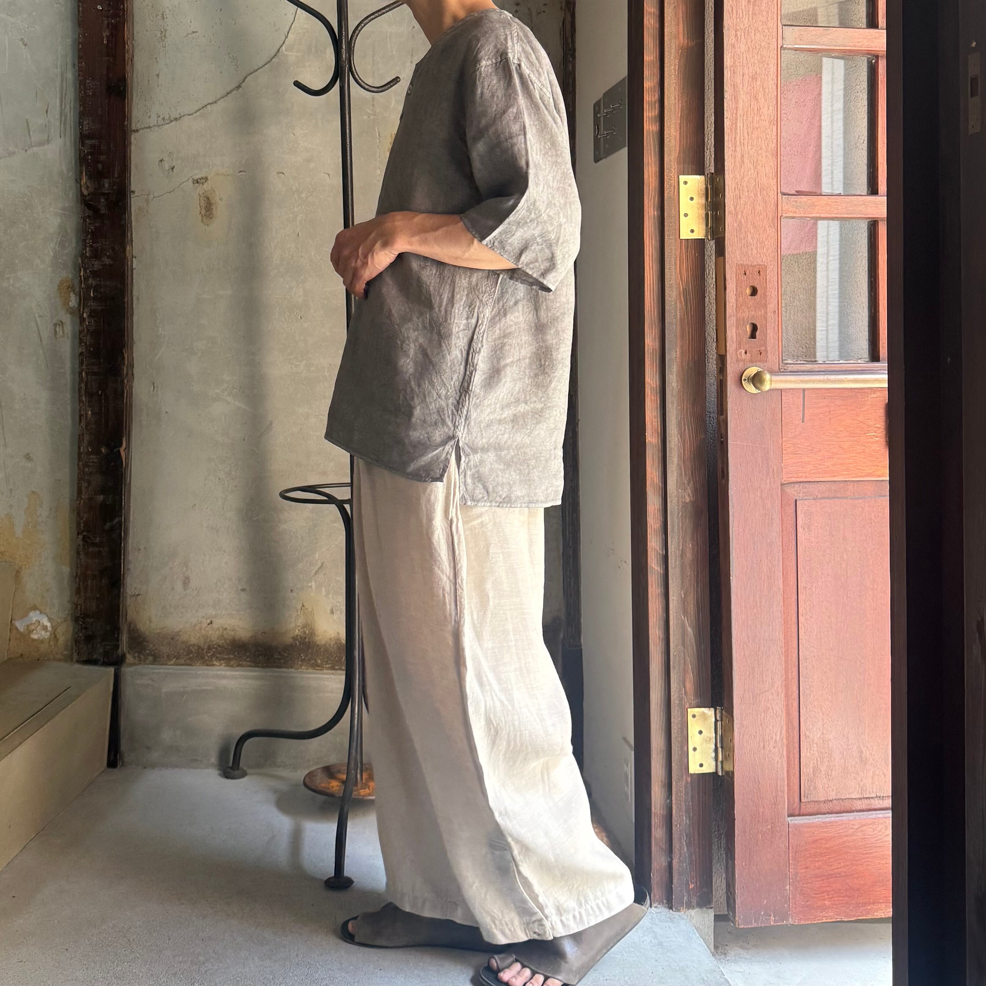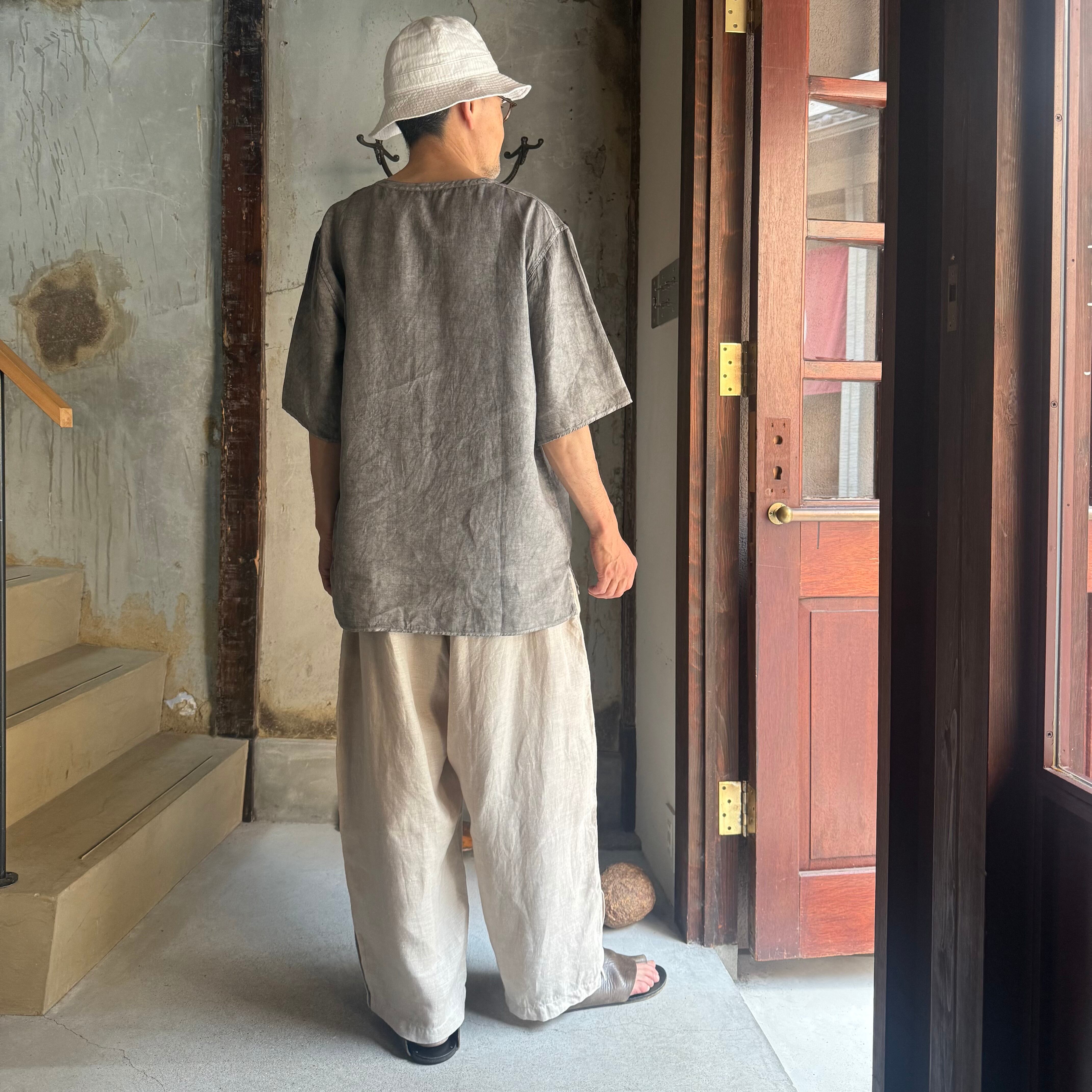 大麻100%の糸を経糸、緯糸に使用しています。大麻は強靭な繊維ですが、経年変化で肌に徐々に馴染んでゆき、麻から綿のような質感の変化が楽しめます。大麻の特性であるひんやりとした触感は洗濯を繰り返しても継続し、真夏でも快適に着用が可能です。 オーバーサイズのプルオーバーで、身体と生地の空間を多くとることで着ていないかのような解放感があります。V字にしたヘンリーネックに、あえて1つボタンにする事でシンプルなデザインが特徴です。肩にいせ込みを入れる事で肩周りの運動量を確保しています。又、ゆったりとしたシルエットの為、着脱がしやすいのも特徴的です。インド製のラクダの骨のボタンを用いて手縫いで付けています。