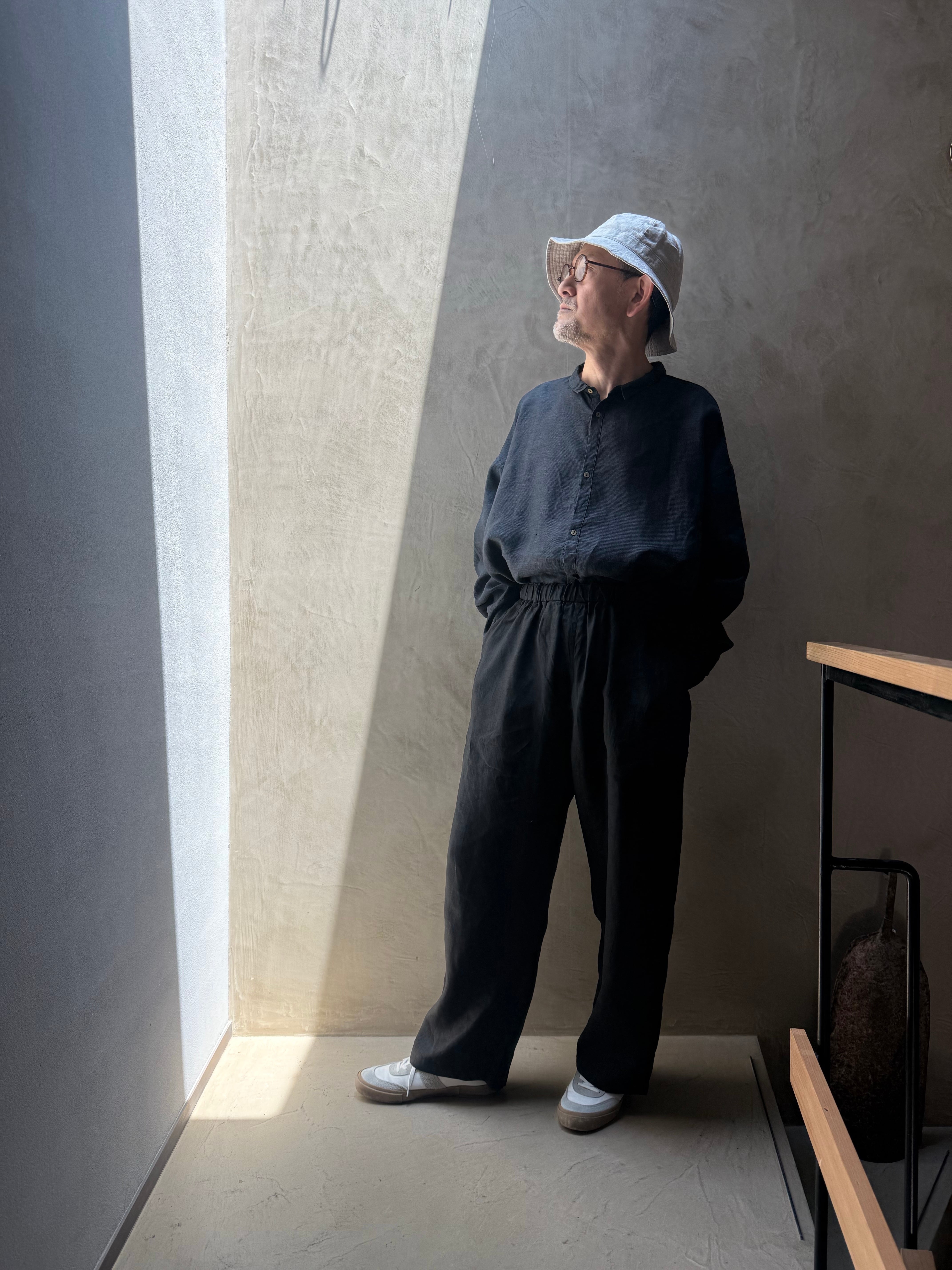 経糸に細番手のリネンを用い、緯糸には同じく細番手のリネンとヘンプを交互に打ち込んだ凹凸のある織地を採用しています。織り密度を落とすことで風を通し、暑い時期にも適した通気性を確保しつつ、リネンとヘンプの自然なハリ感により冬以外のシーズンで快適に着ることができます。染色を施すとリネンとヘンプの染まり付きの差が織り柄を際立たせ、生地の表情が一層豊かに引き立ちます。