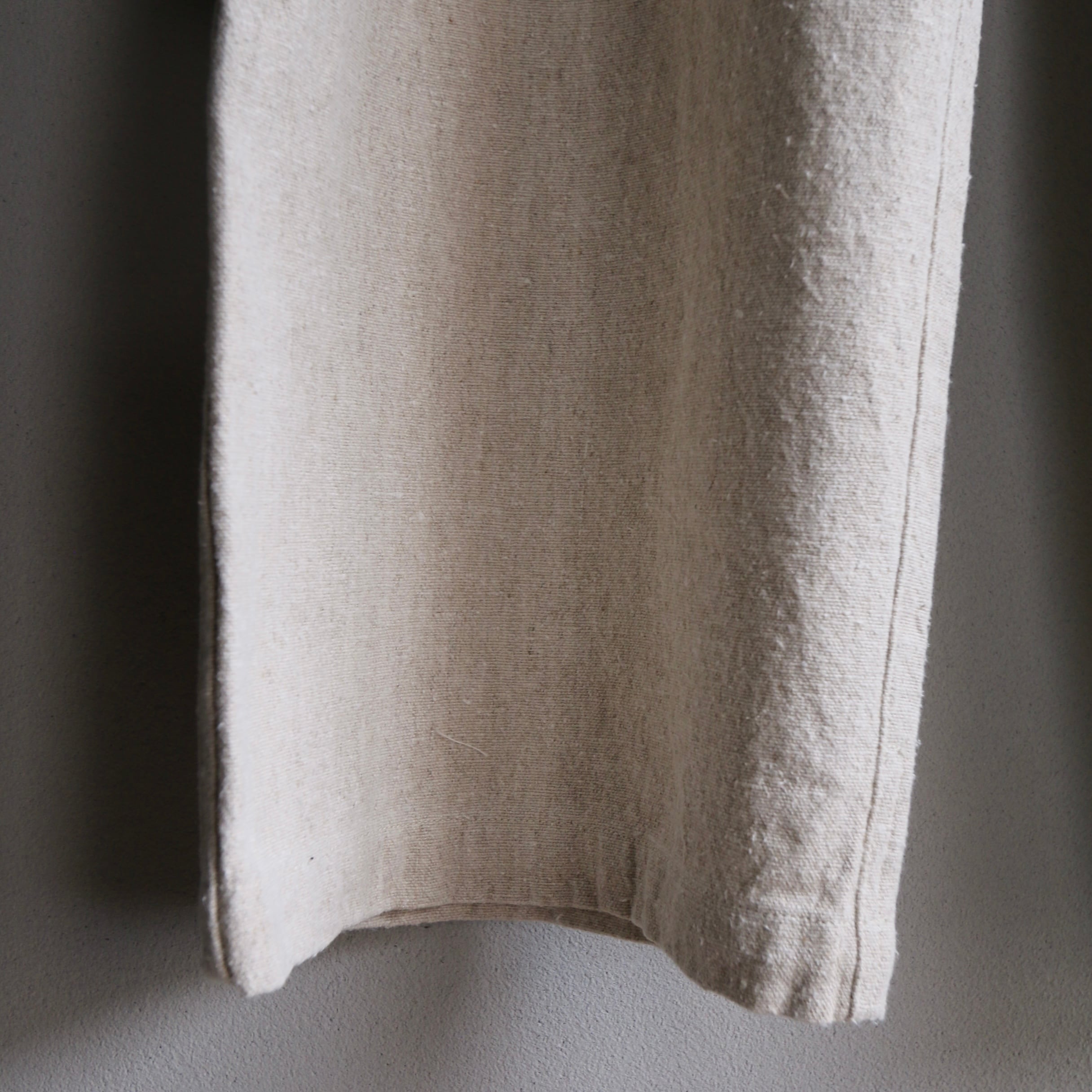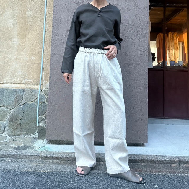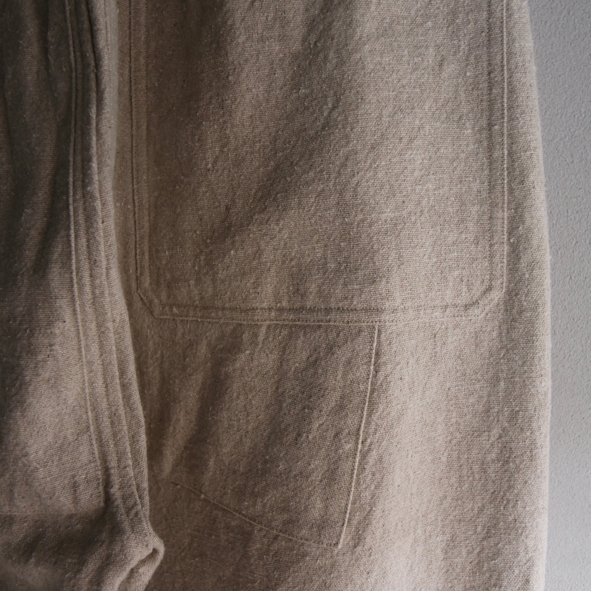 定番のストレートシルエットパンツは、程よいゆとり感と適度な丈感、広すぎない裾幅が特徴です。緯糸に絹を交織しているため、擦れやすいヒップから内股にかけて当て布を縫い付けて補強し、耐久性を高めています。ウエストはゴム仕様で内側の紐によりベルトなしでも快適に着用可能。ベルトループも備えているため、ベルトを併用すれば、重い物を入れてもポケットを安定して使えます。