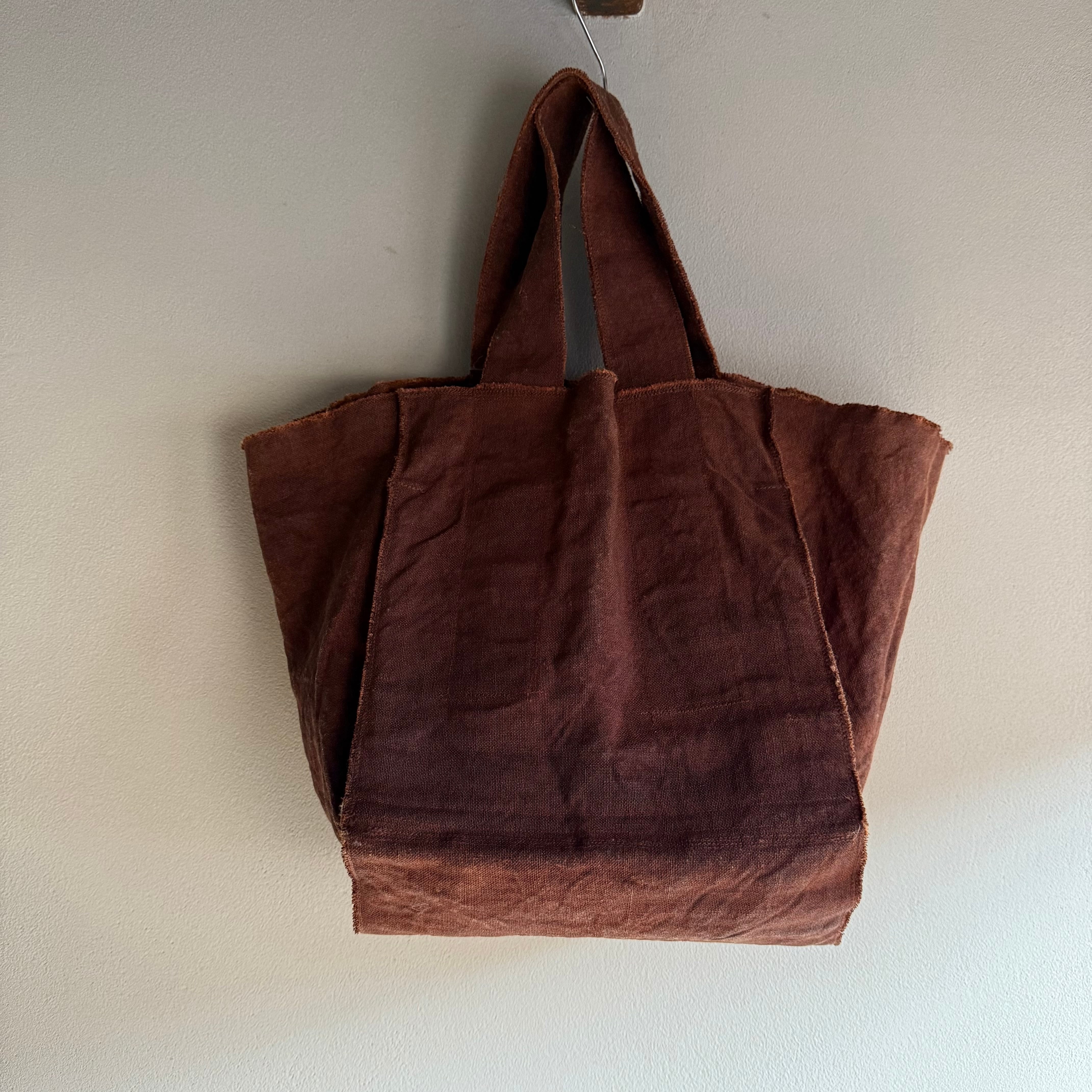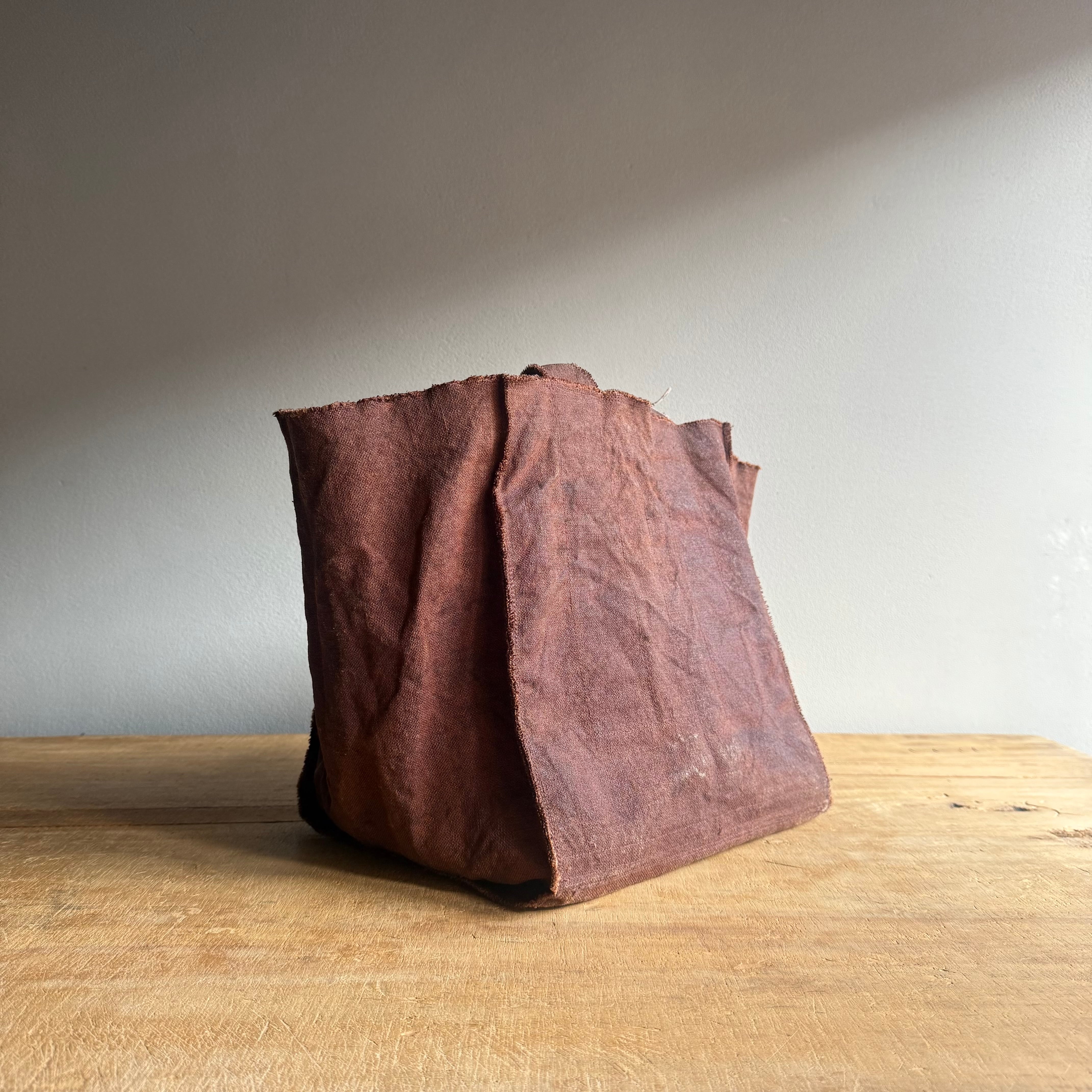 リネン100%の生地に柿渋染めでダークブラウンに濃く仕上げた布をダブル使いでがっしりとした重厚感をもち、抜群の丈夫さを持ったバッグ。