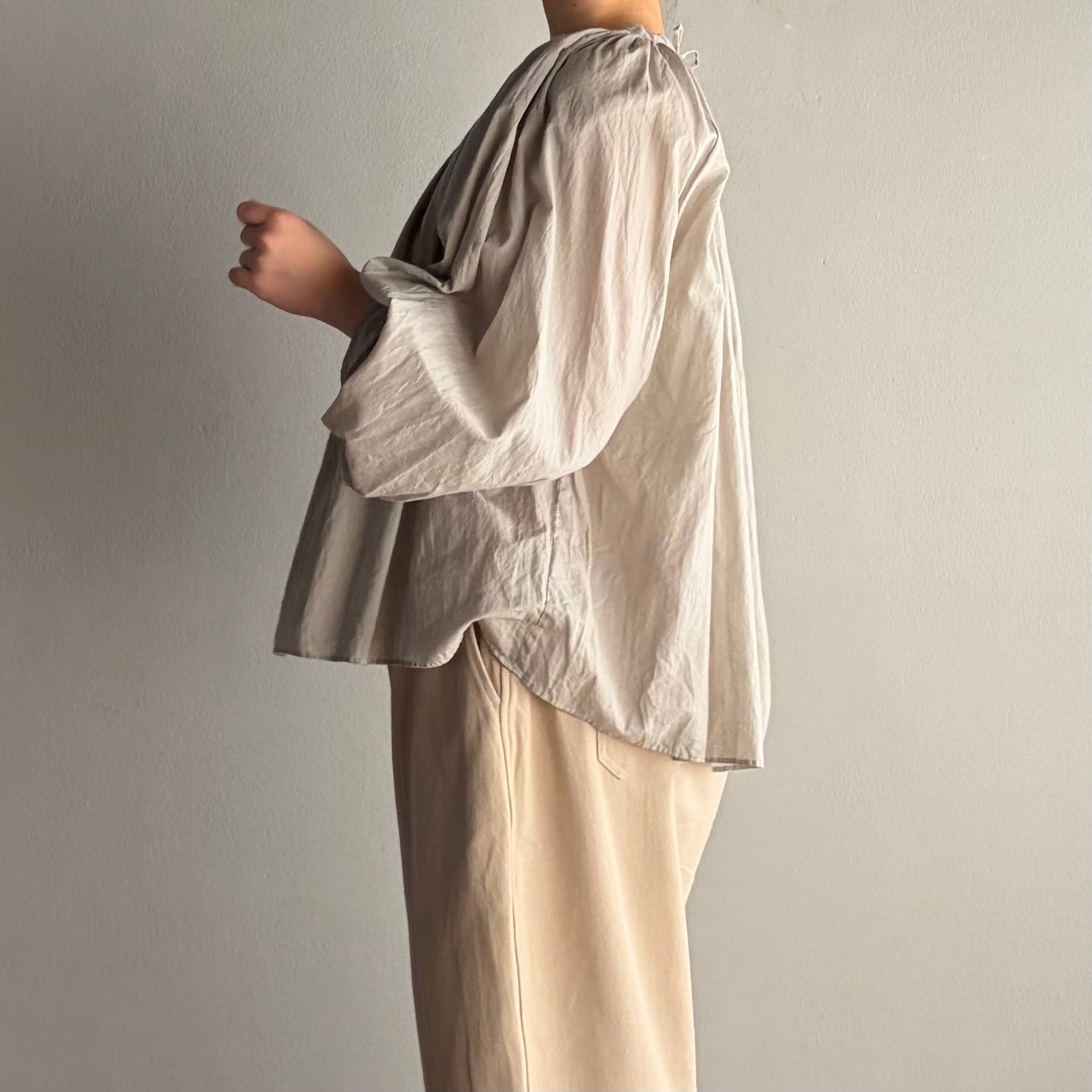 こちらはコットンのローン生地を使い、ガーメントダイエットによる染めによって、落ち着きのある、上品なグレーに染め上げた一品です。