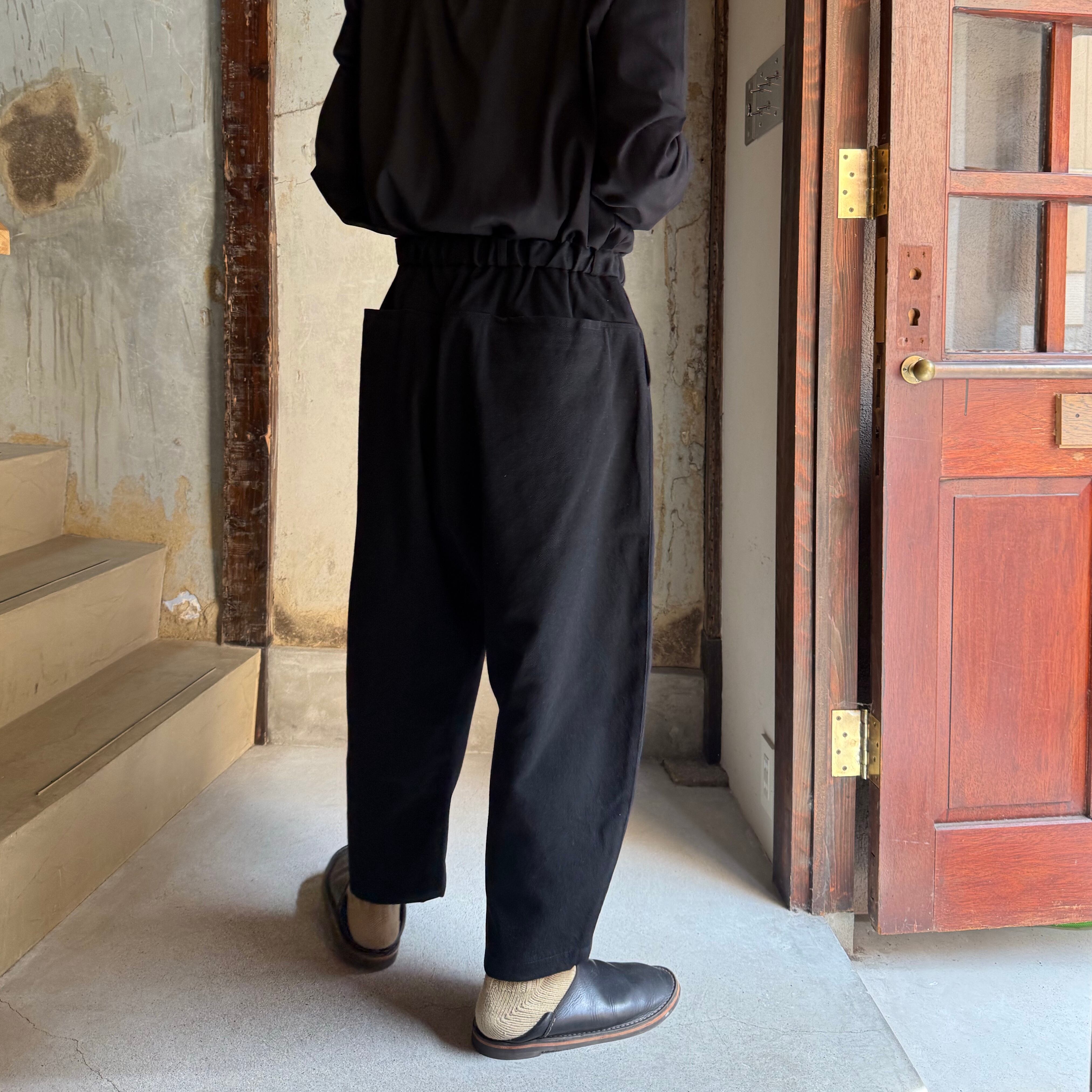 パターンはもんぺやたっつけを参考にしたMITTANの定番的なシルエットのパンツです。股上は深いものの、運動量を確保しているので動きやすいのが特徴で、膝から裾にかけて入っている急なテーパードは、ロールアップによって調整が可能です。機能性を備えながらもシンプルなデザインの為、体型を問わず好みのサイズ感を選んでいただけます。後ろポケットは、切り替えを利用した仕様になっています。
