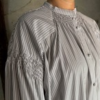 首元と袖元に細かなタックを寄せて、包みボタンをなど繊細なディテールと