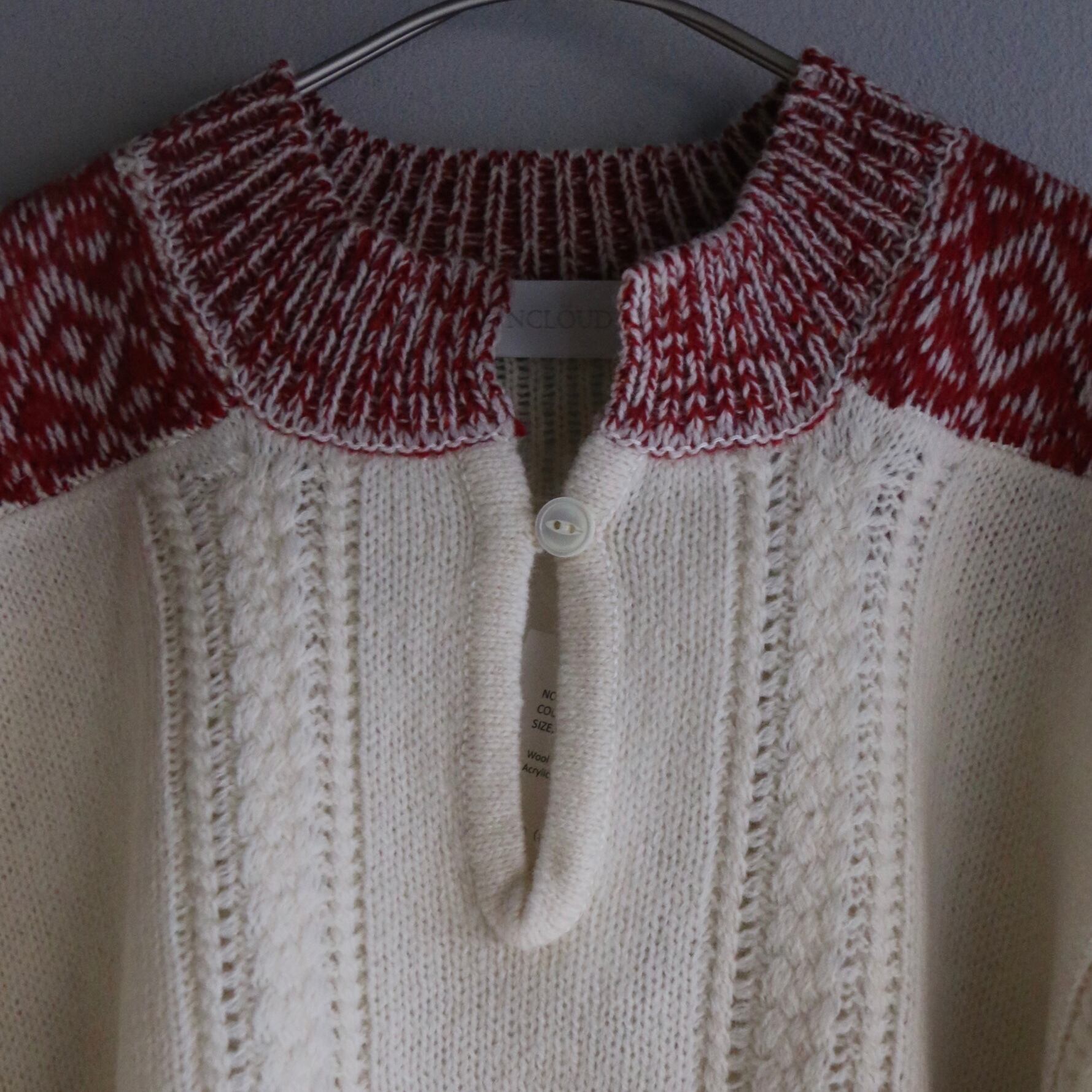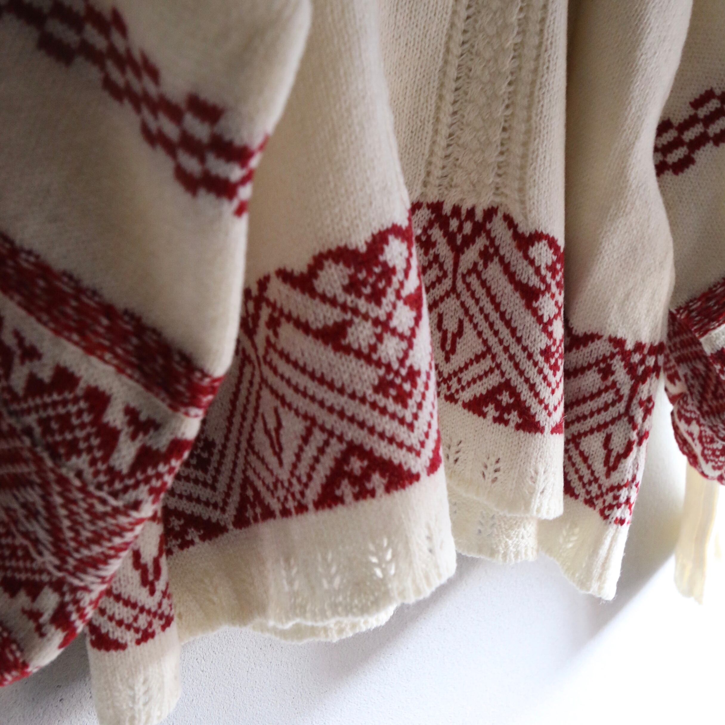 繊細な編み柄とoff whiteに落ち着きのある赤の柄がとても上品な色バランスです。