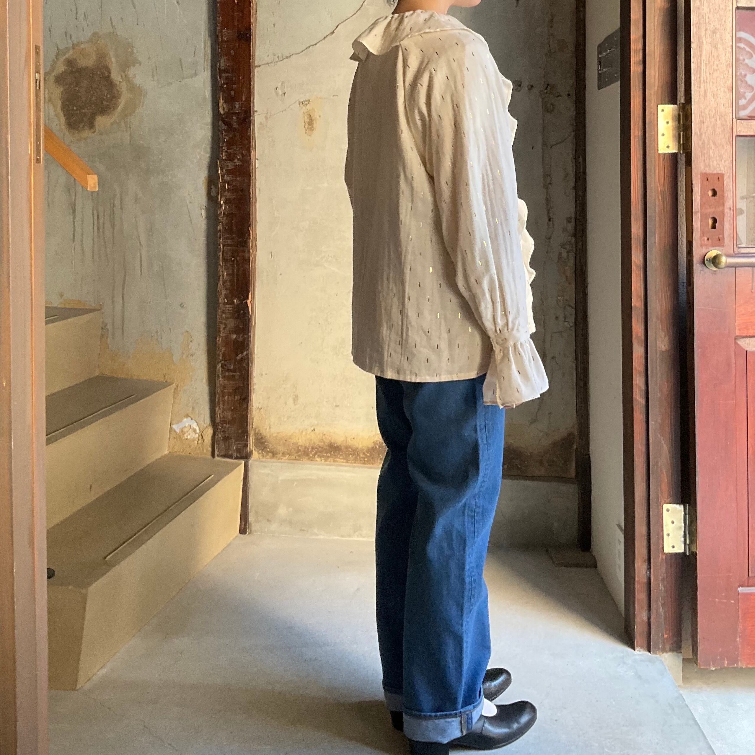 襟から前縦にかけて、また袖にもフリルをあしらったブラウス。