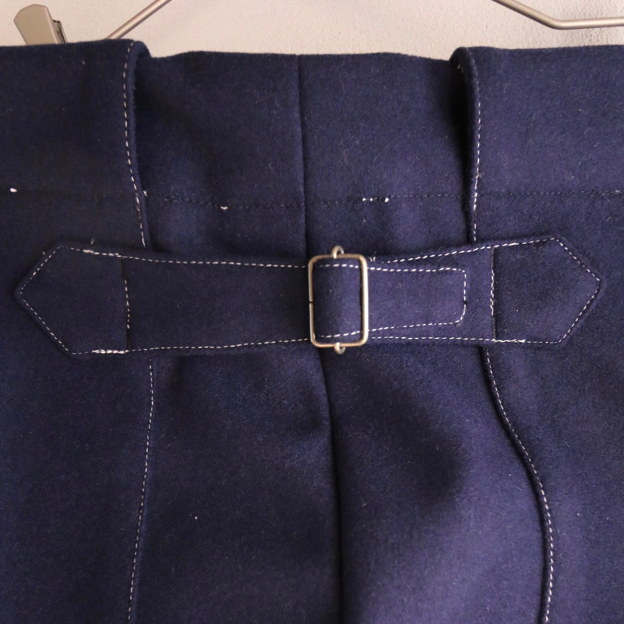デザイナー玉井健太郎さんが磨き上げたシルエットは膝から下に膨らみを持たせた、やや低めの重心を感じさせるシルエット。個性的でありながら、横からも後ろからも不思議と均整のとれたシェイプがとても美しいです。後ろは大きなポケットがワーク感を演出すると同時に、作業ツールなどをストンと入れていただけるような斜めの入れ口と深さをとった形が機能的です。後ろの腰骨のあたりにあるバックルでウエストサイズをアジャストする事でフィット感を調整することができ、より安定感のある履き心地になります。