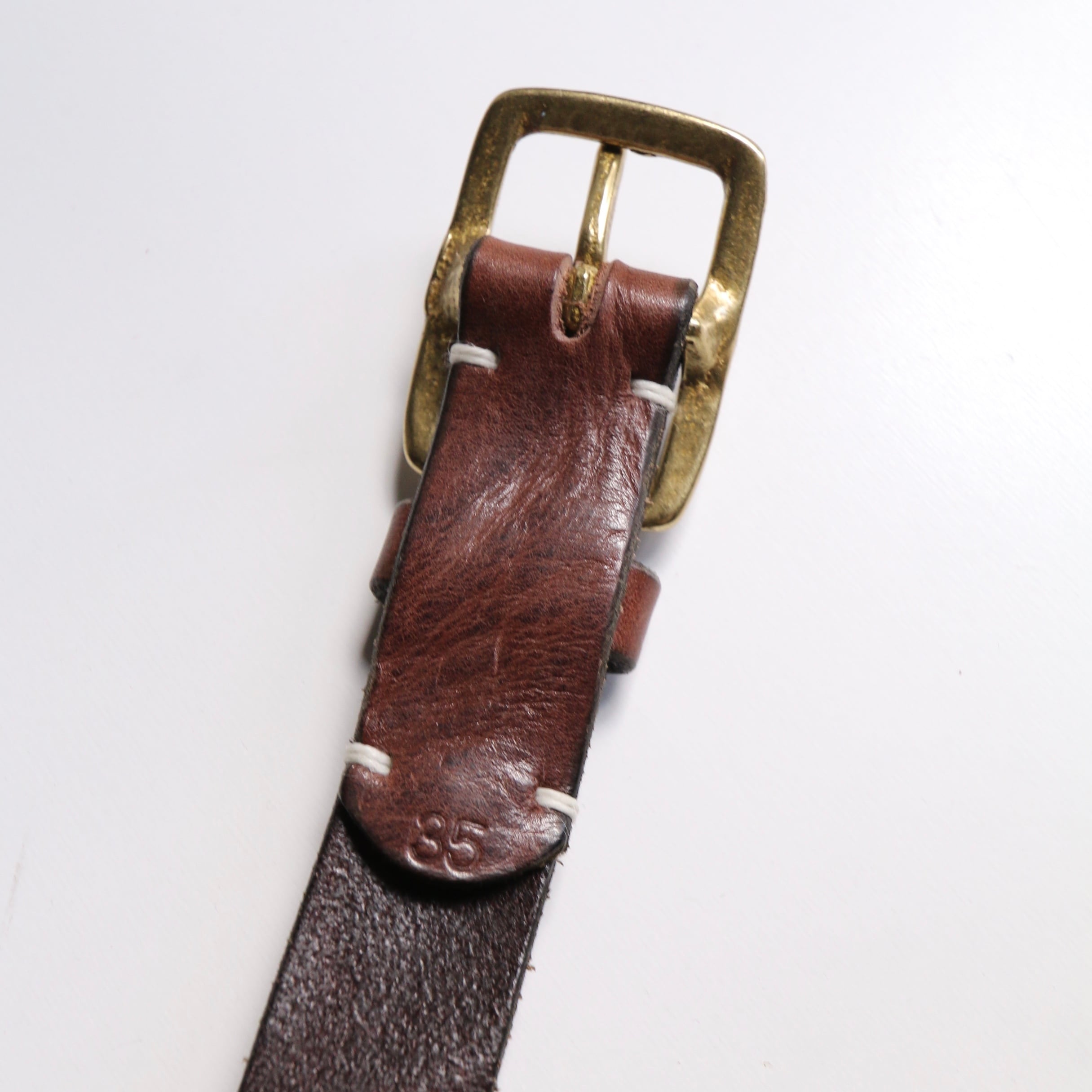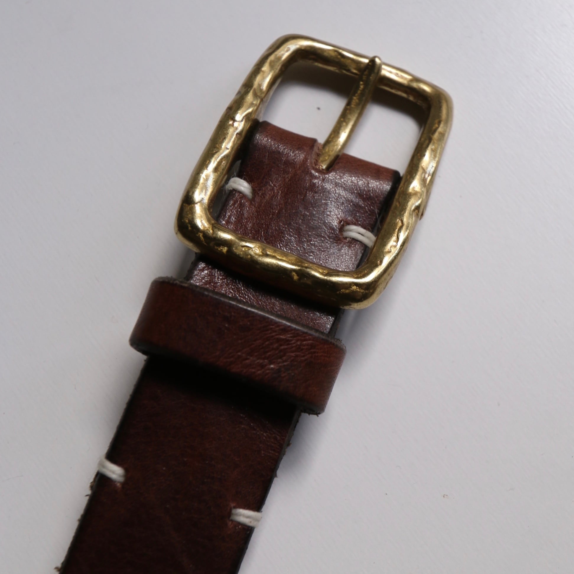 真鍮の味わいのあるバックル。厚みのあるしっかりとしたレザー。ウエスト最小74㎝から最大97㎝と幅のあるワンサイズのサイズ感。存在感のあるボトムス、デニムのコーデなどにぴったりの長くお使いいただけるベルトです。