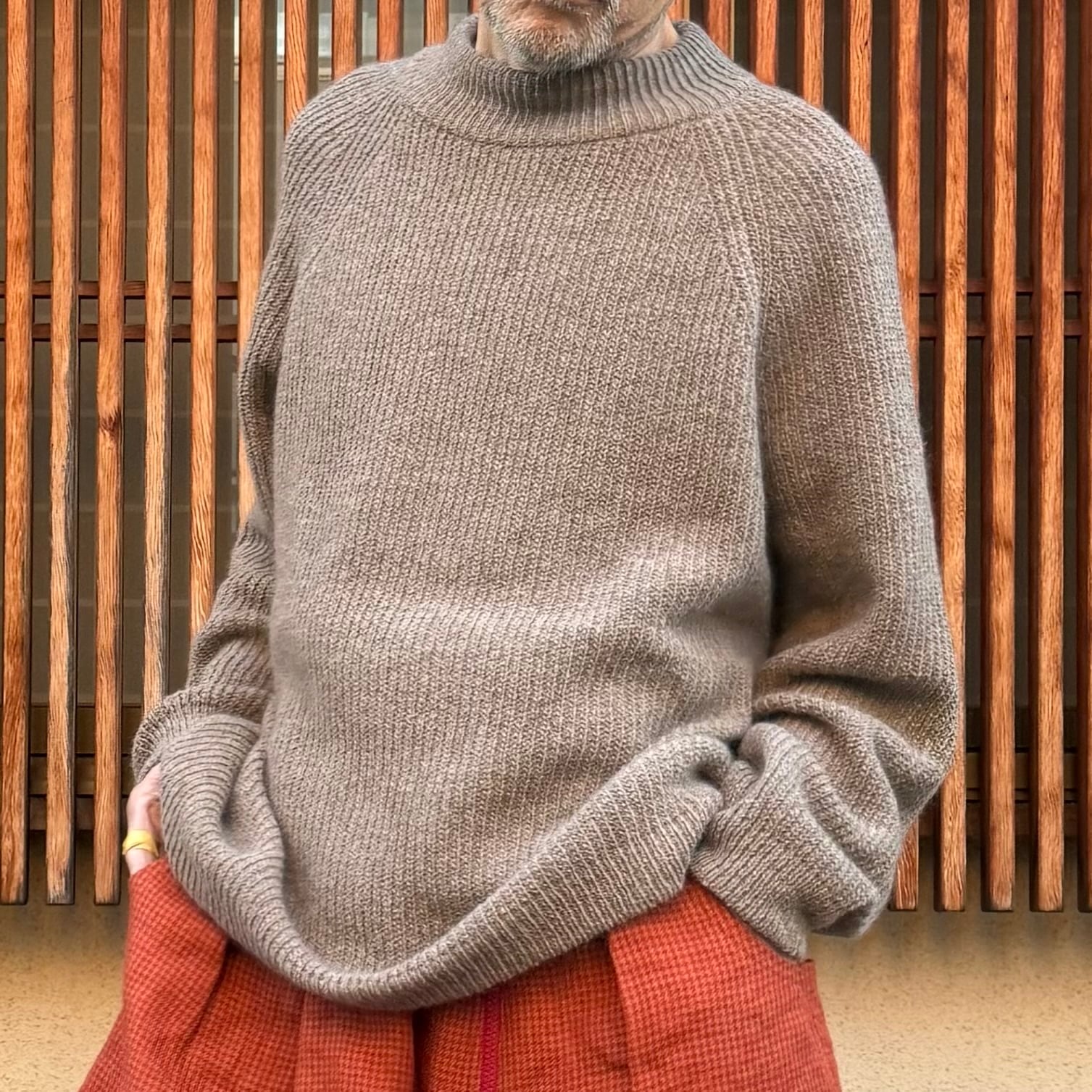 畦編み特有の立体的なボリュームを活かした、身幅にゆとりをもたせたシルエットです。インナーとしてはもちろん、アウターとして中に厚手のレイヤリングをしても窮屈さを感じさせず、秋冬の着こなしに柔軟に対応します。日常の道具としての機能性を意識しています。