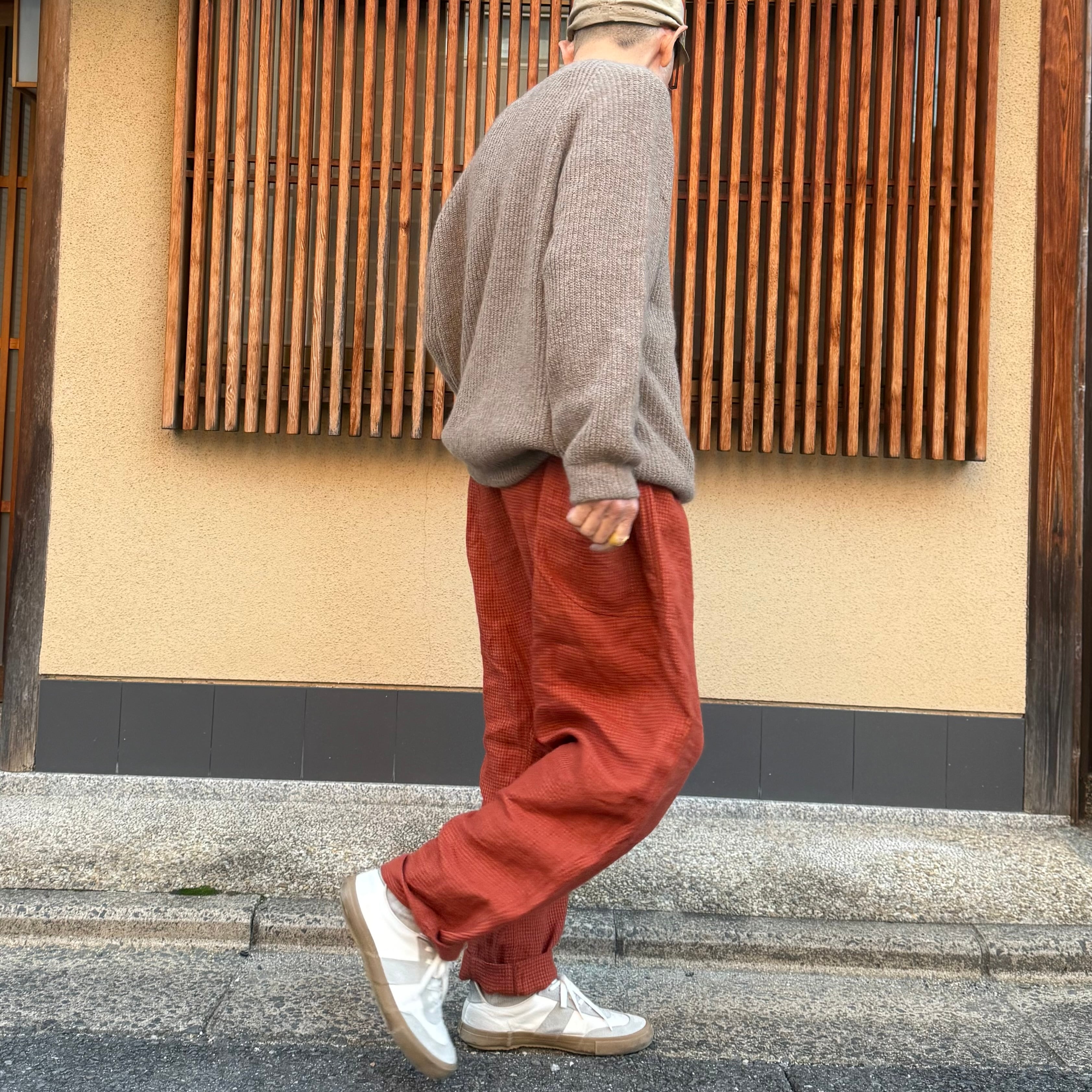 通常はニットでなく絨毯のような織物に使用される糸を使用しています。あえて選別をしすぎないことで生まれた粗野な素材の表情と繊維感を残した無染色のカシミヤの糸を使用し、リブ部分を除いて全体を畦編みで仕上げています。糸には比較的撚り回数も入っているので、全体的に落ち感も表現されています。