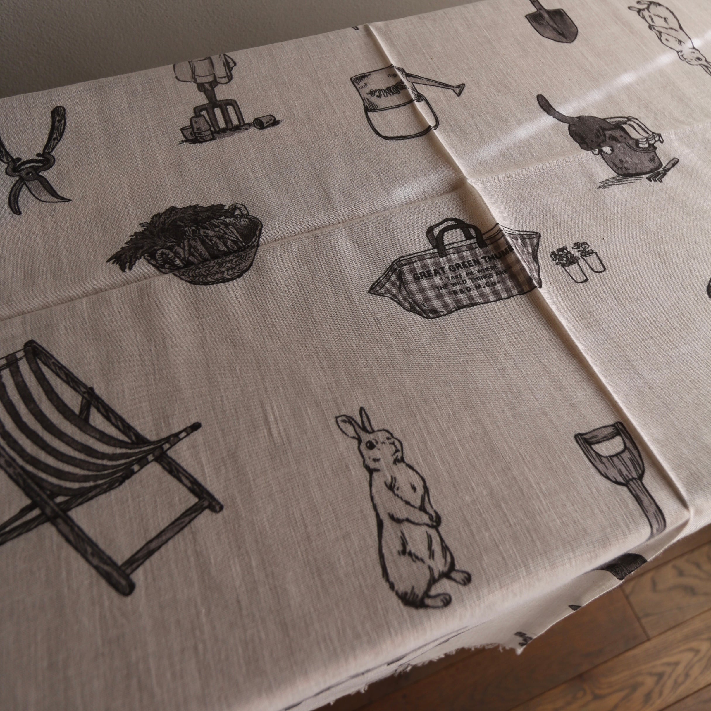 園芸の道具や、庭の生き物たちが魅力的なタッチのイラストで描かれています。