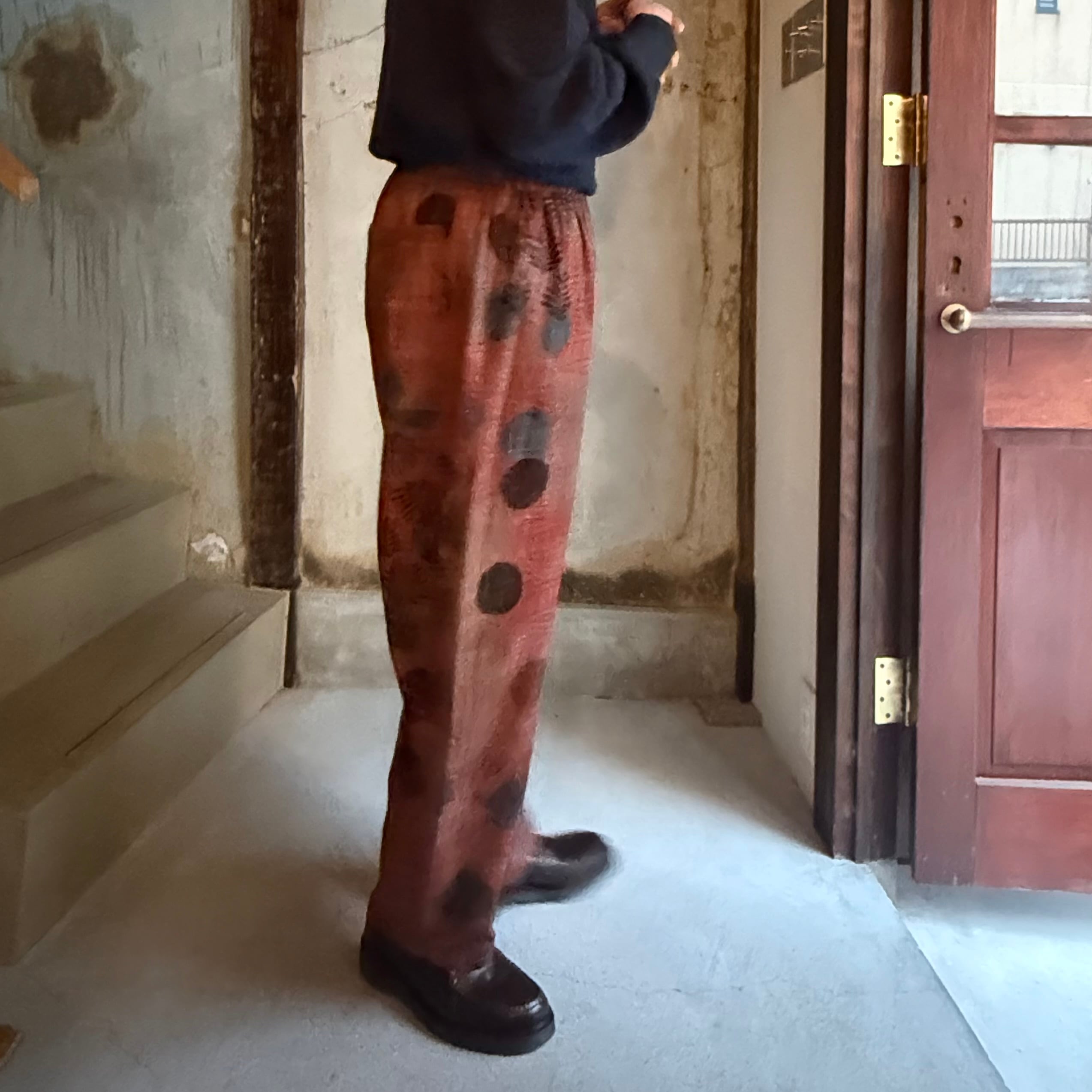 ウエストはゴムと紐で調整できます。腰とわたりにゆとりがあり、裾にかけてゆるやかなテーパードがかかっています。レッドをベースにグリーンやブラウンの色の重ねがきれいです。