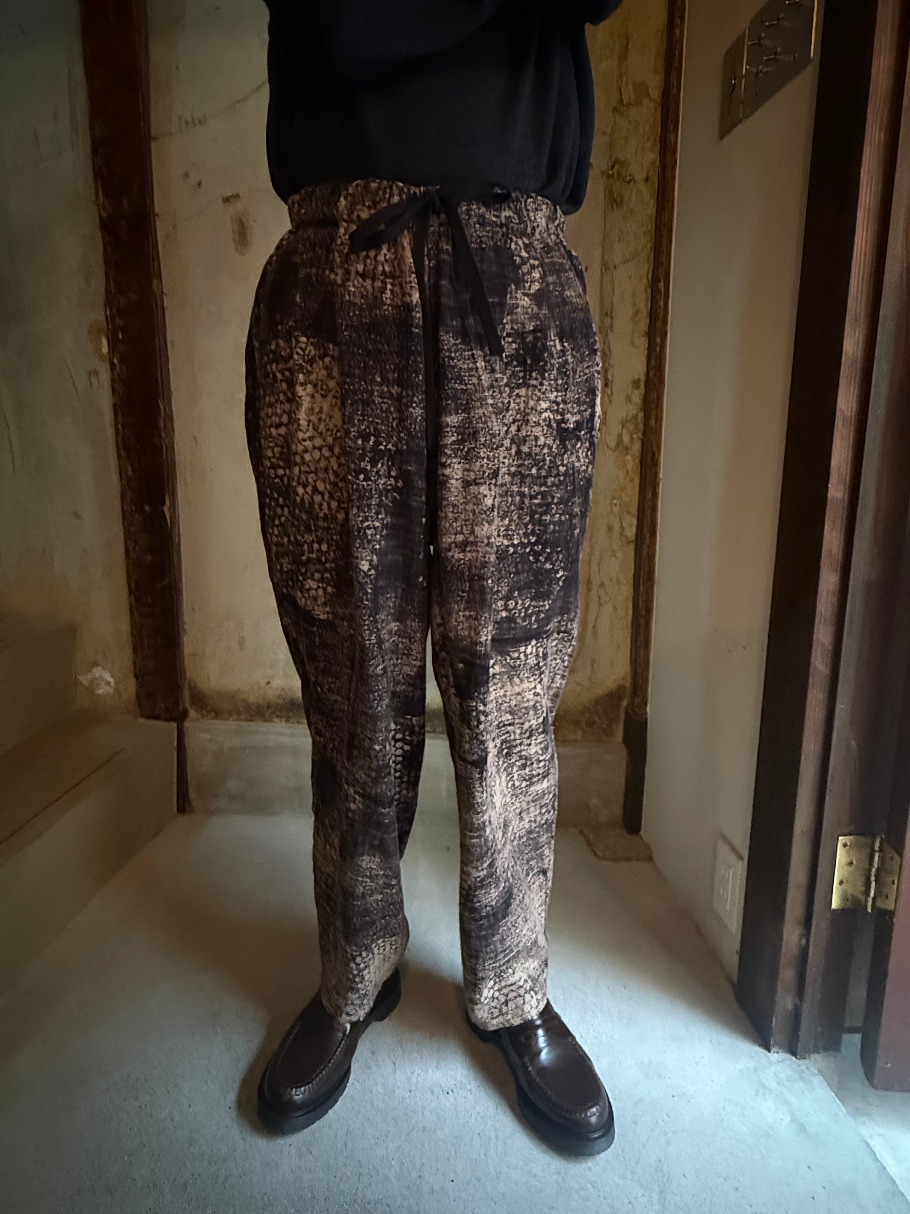 鉄媒染のブラウンをベースにした多様な形の柄が表情豊かなパンツです。
