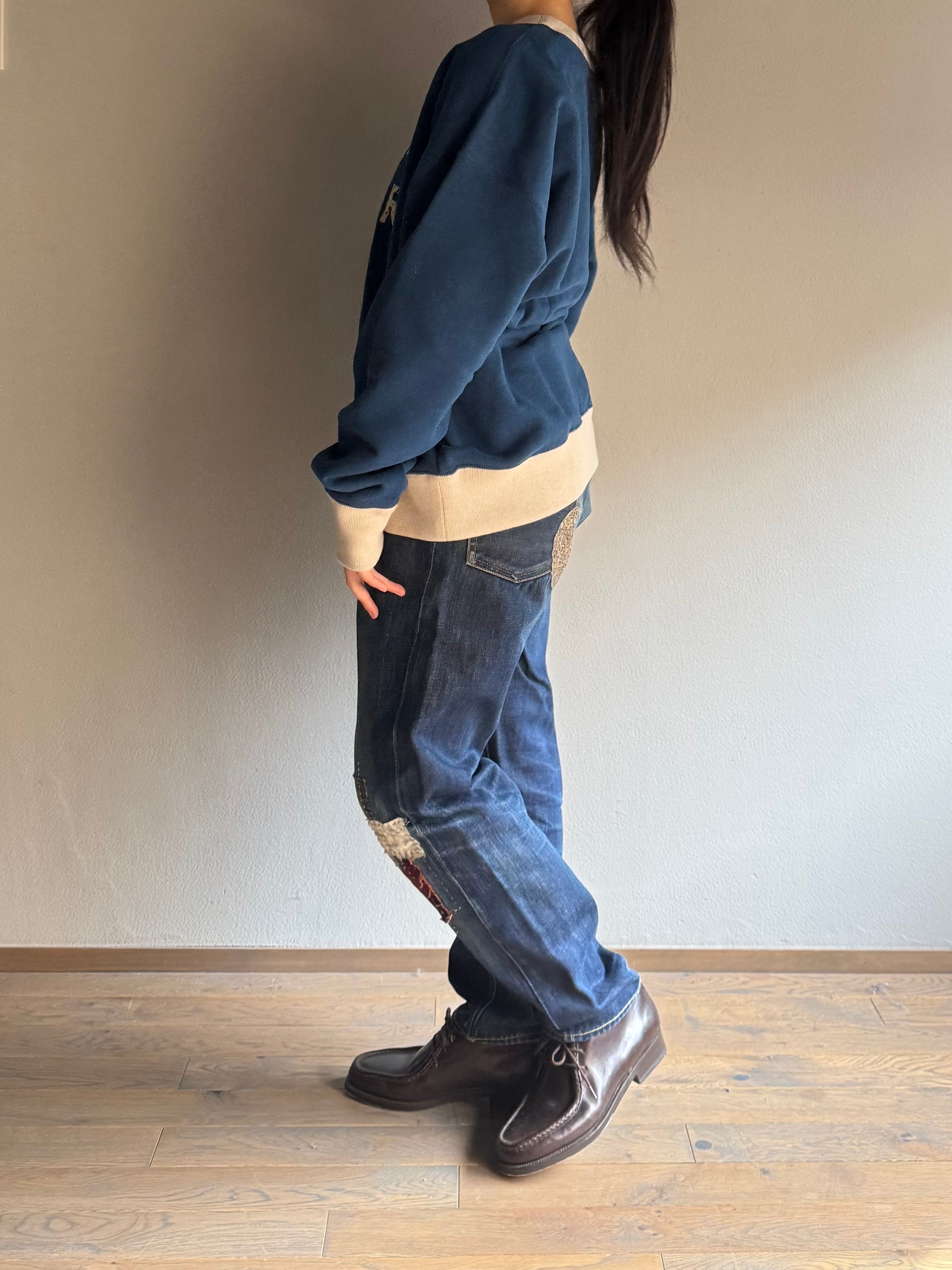 大胆なパッチワークでありながら、計算された絶妙なバランス。手縫いステッチの温もりとエッジの効いたデザインが共存する、オンリーワンのデニムです。