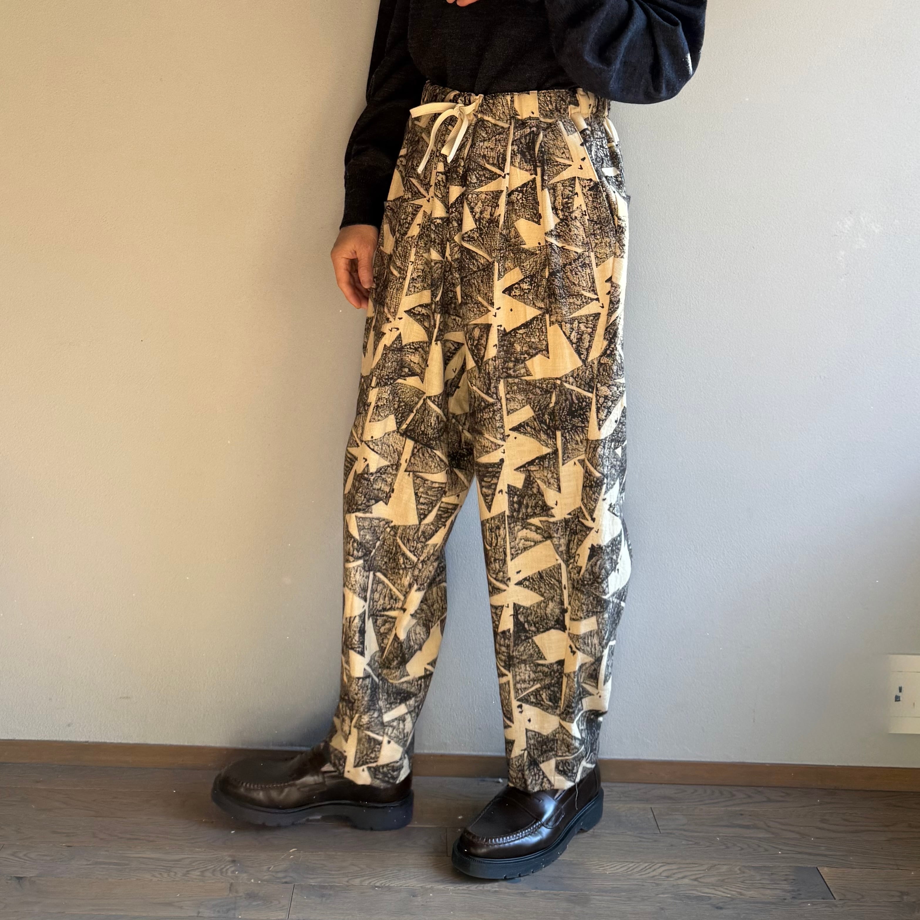 生成りをベースに、三角形が折り重なるようにプリントされた柄が楽しい雰囲気のパンツです。