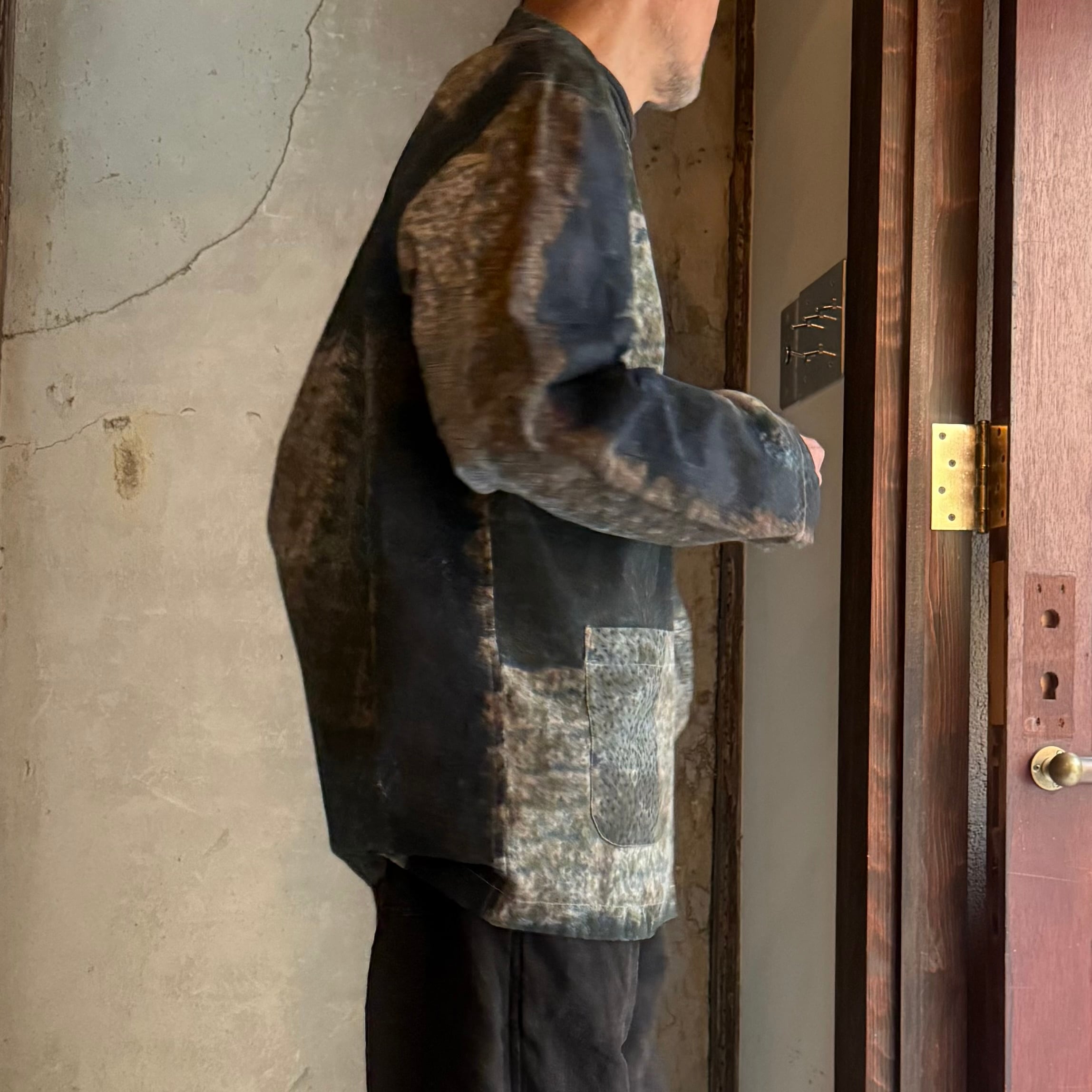 unfabricのunisexジャケット。コットン100%の軽い生地。しかし表面に折り重なった木斑プリントの下敷き布の模様がユニークで奥行きを感じさせてくれます。
