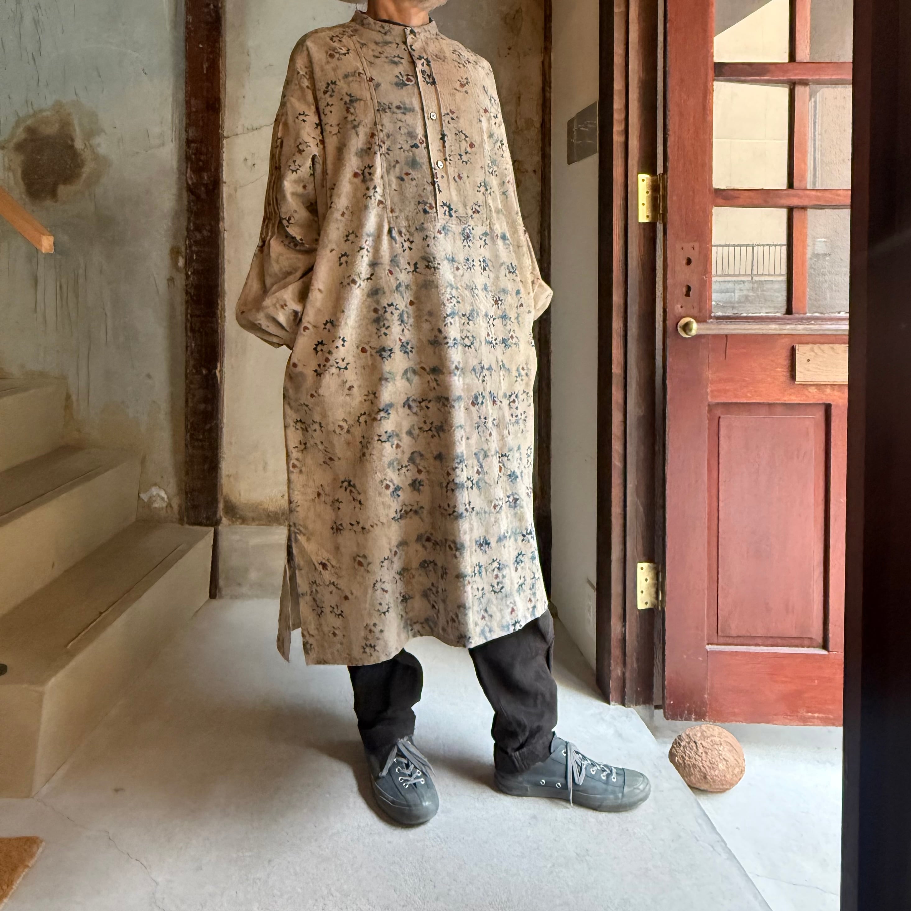 インドの伝統的な木版染めの下敷き布のロング丈シャツドレス。にじみや色むらが、静かで奥行きのある表情を生み出しています。