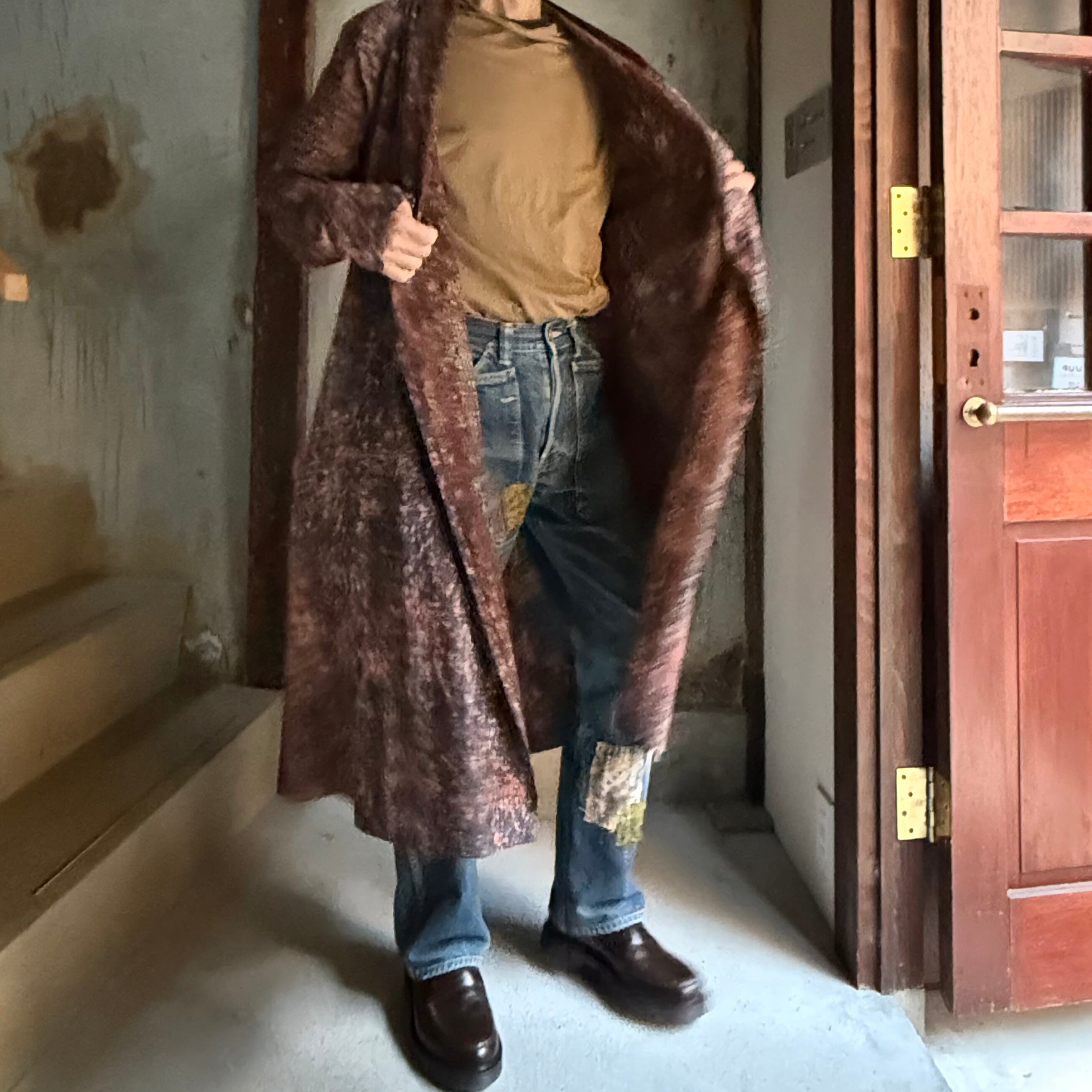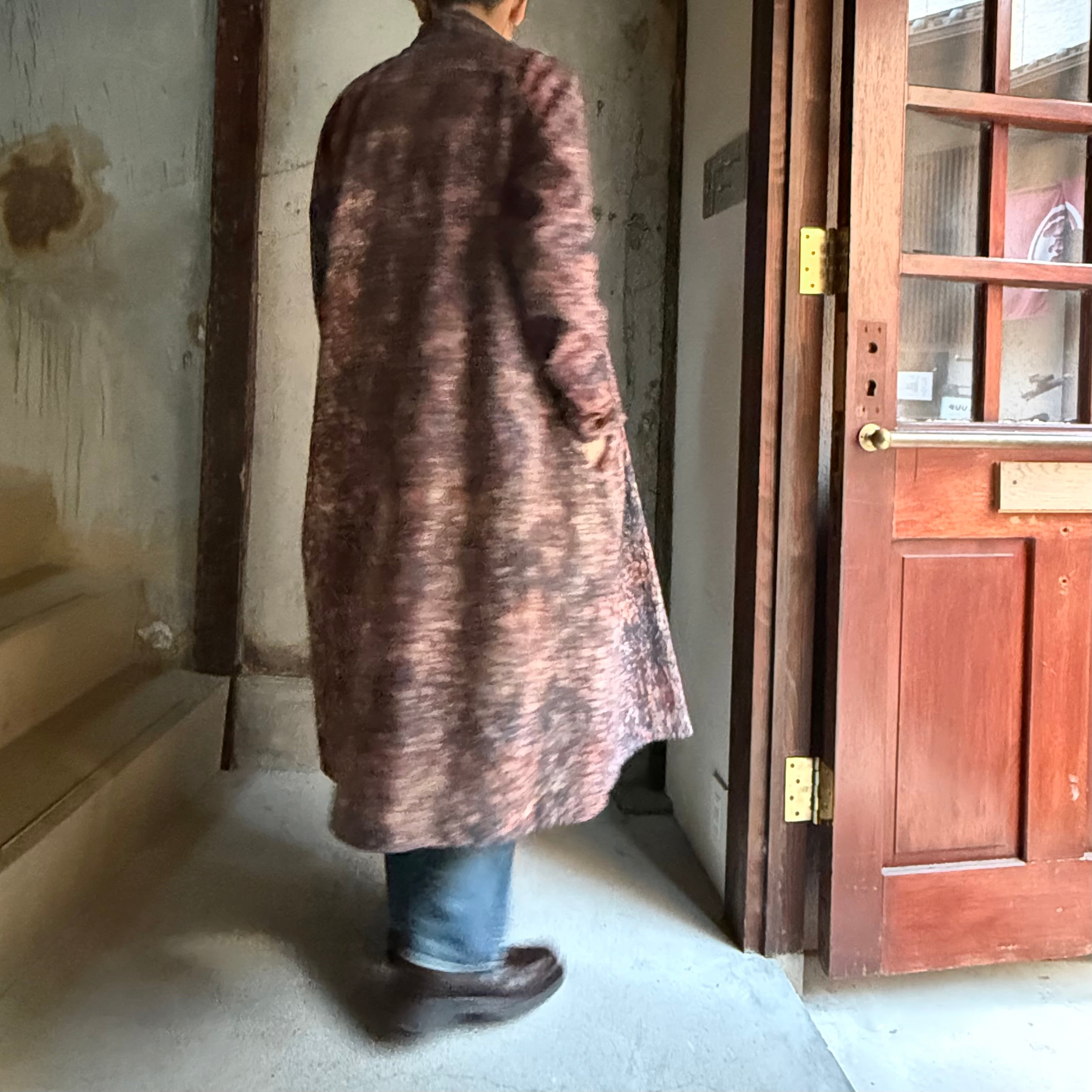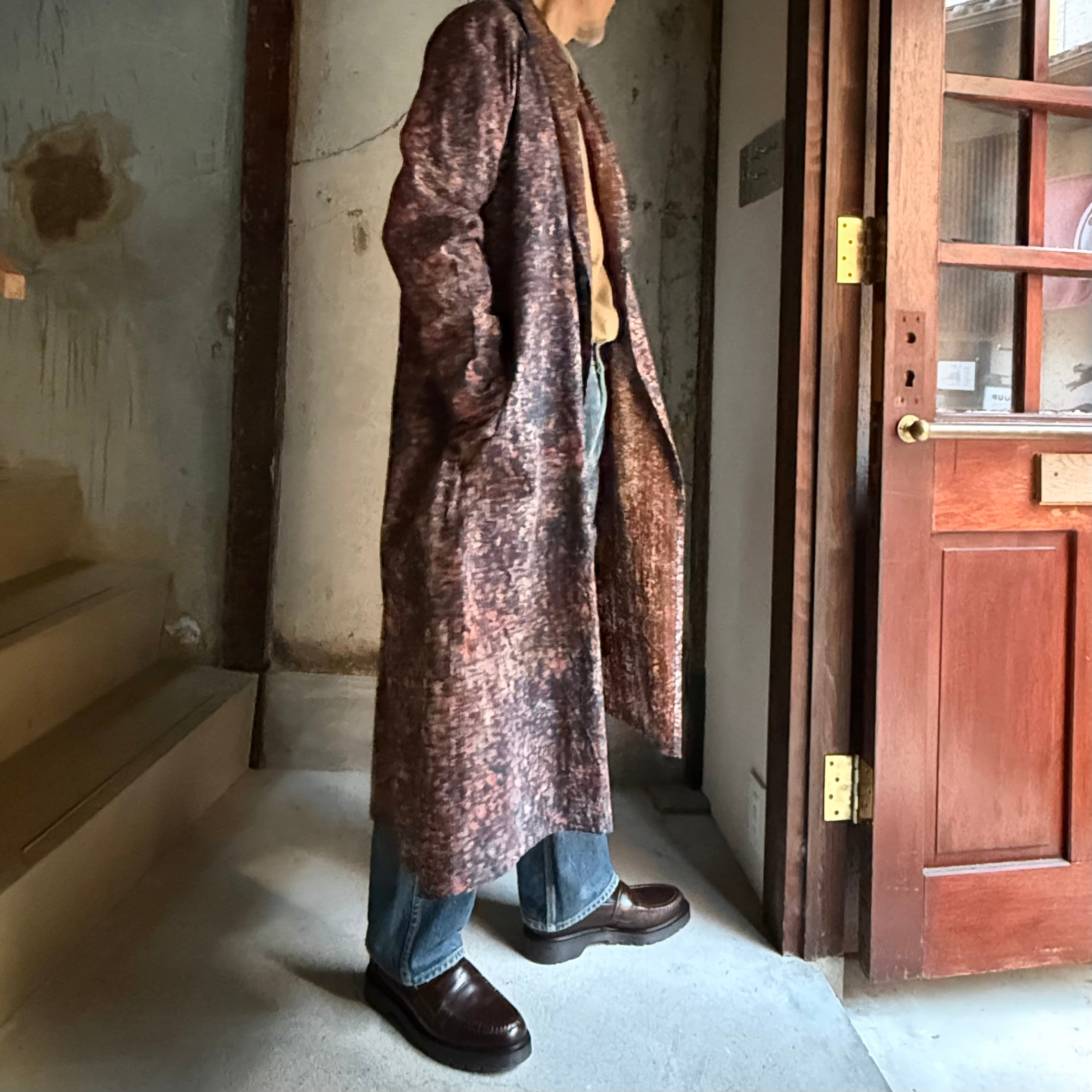 un fabric seriesのローブ。オープンフロントの羽織ドレスです。偶然のプリントの重なりが