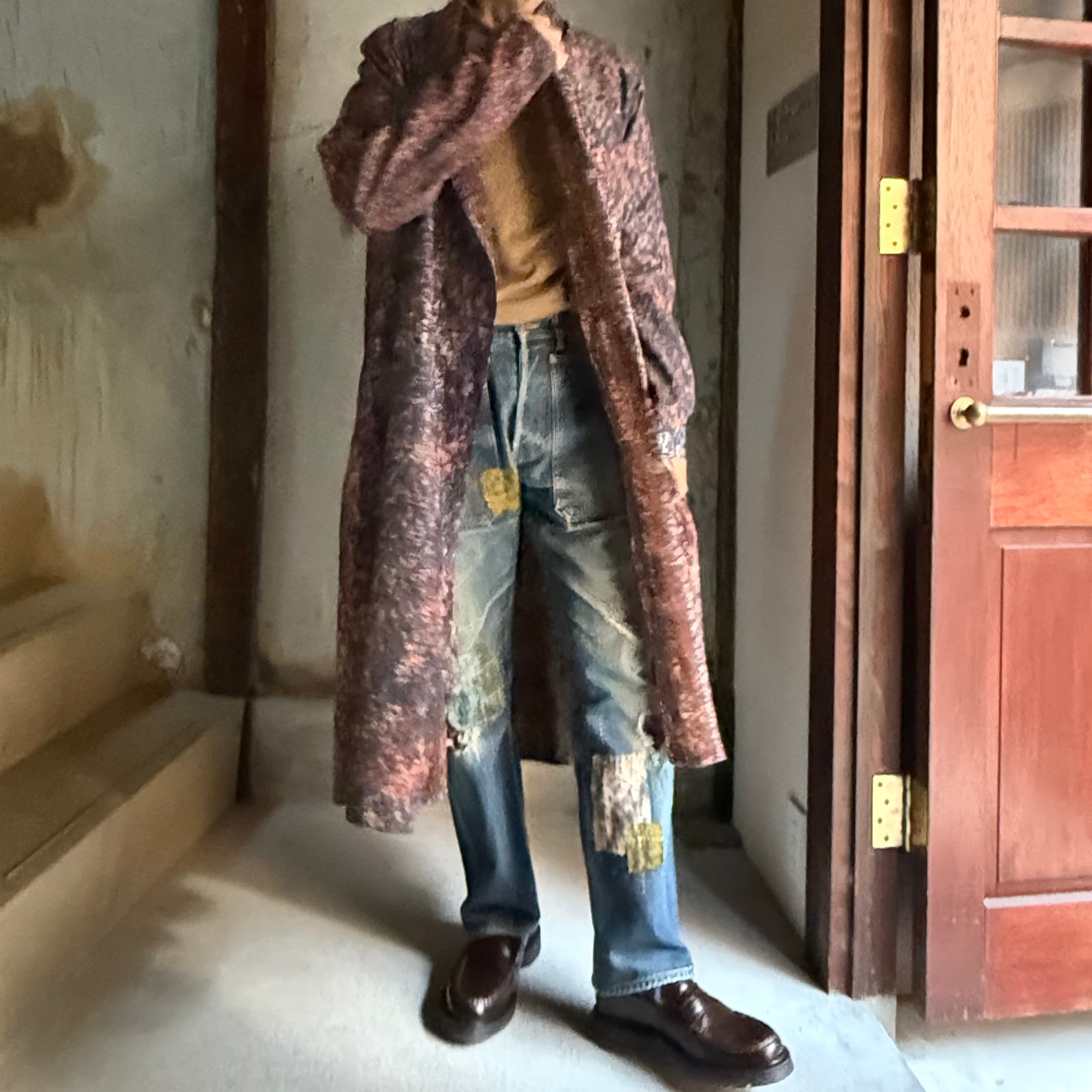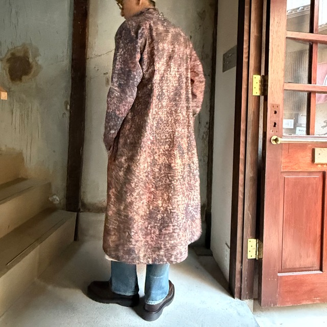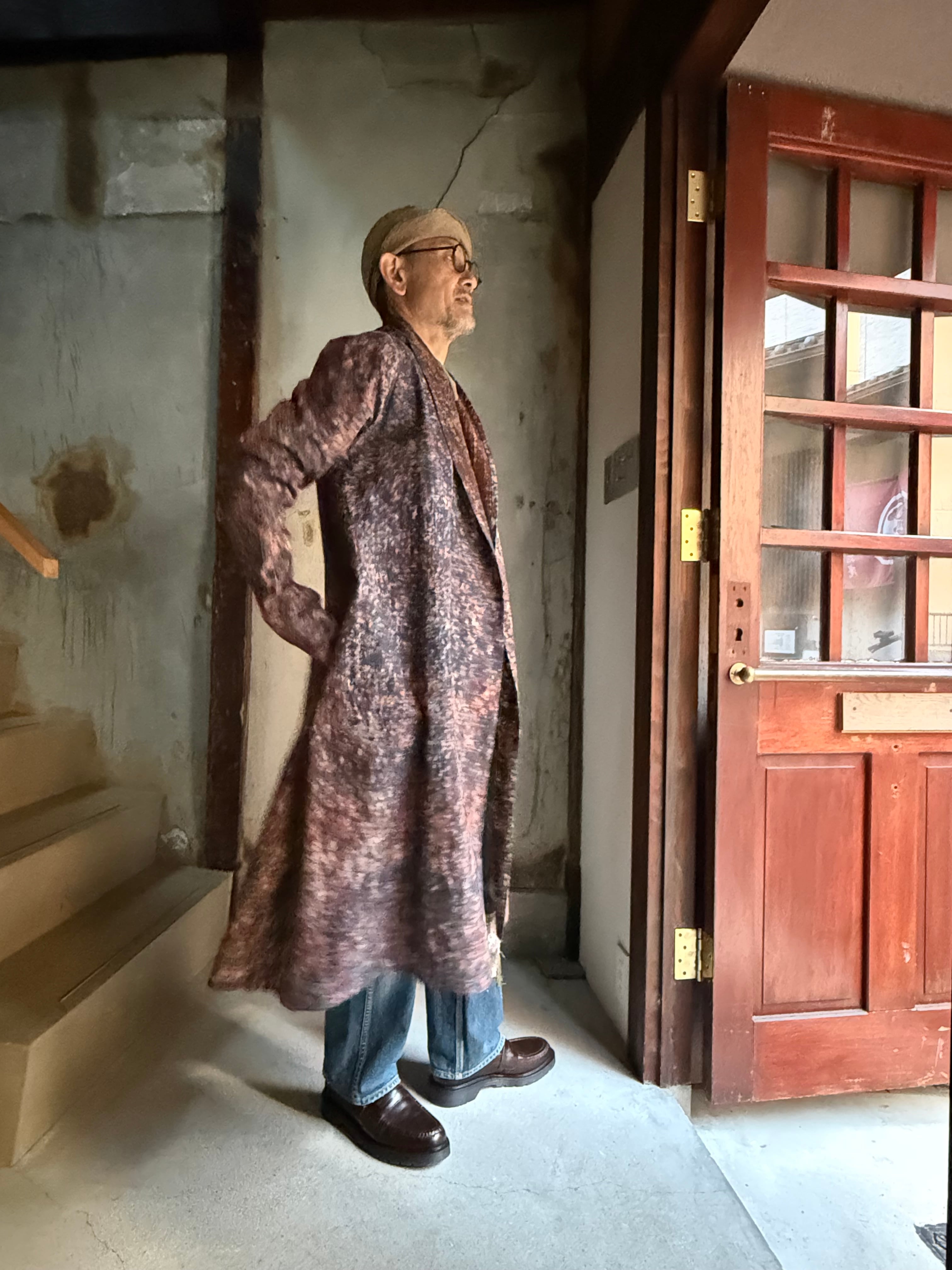 un fabric seriesのローブ。オープンフロントの羽織ドレスです。偶然のプリントの重なりが