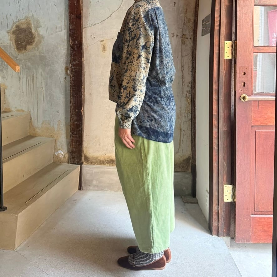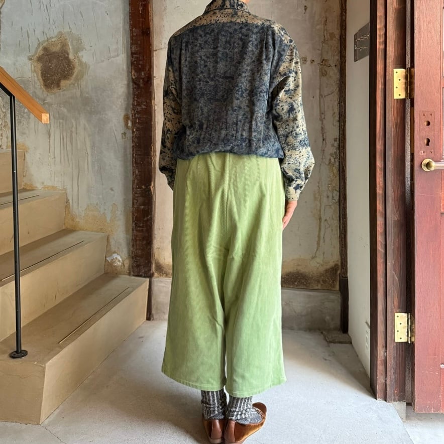 温かみのある中畝コットンコーデュロイを使用。爽やかさと落ち着きを兼ね備えたミントグリーンは、ダークトーンのコートやニットと相性抜群。ボトムスに取り入れるだけで、コーディネート全体がパッと明るく華やぎます。