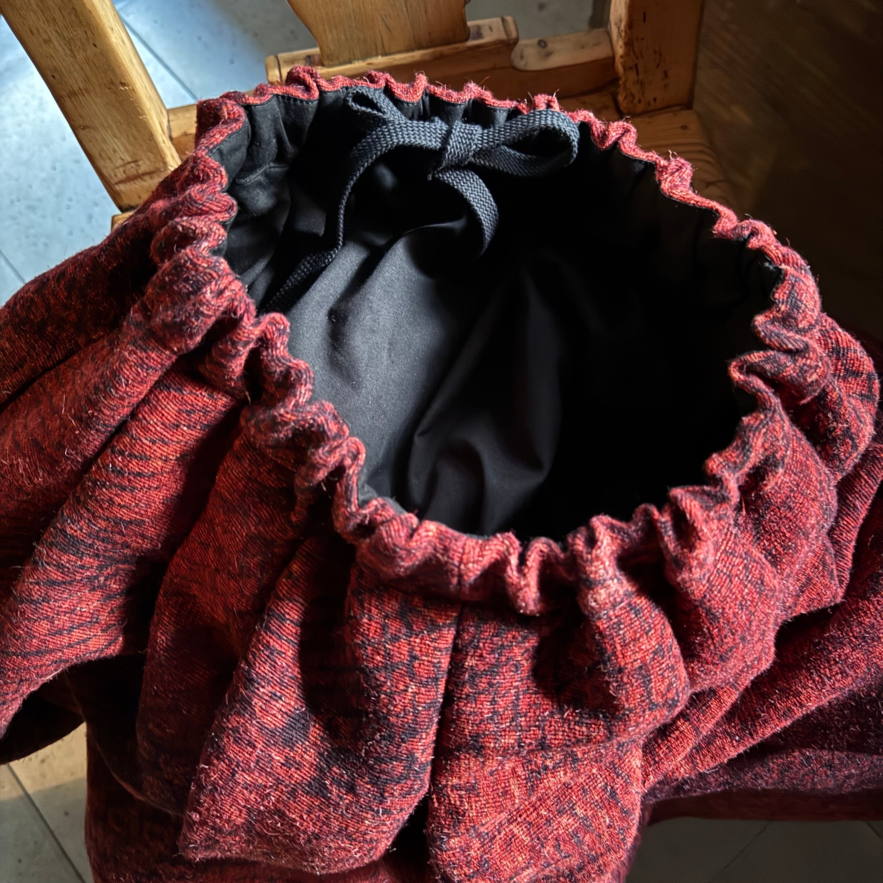 柔らかい織りの空気感を含んだ布で暖かいです。また黒地のインナーが付いています。ウェストはゴムと紐で調節いただけます。