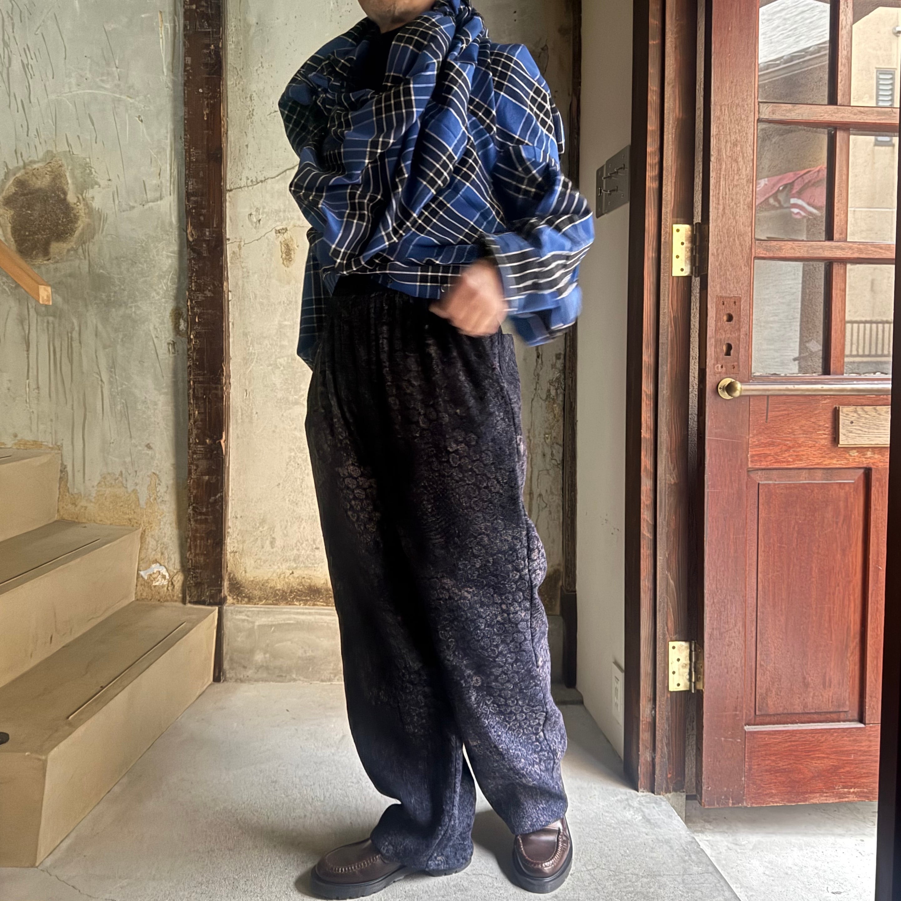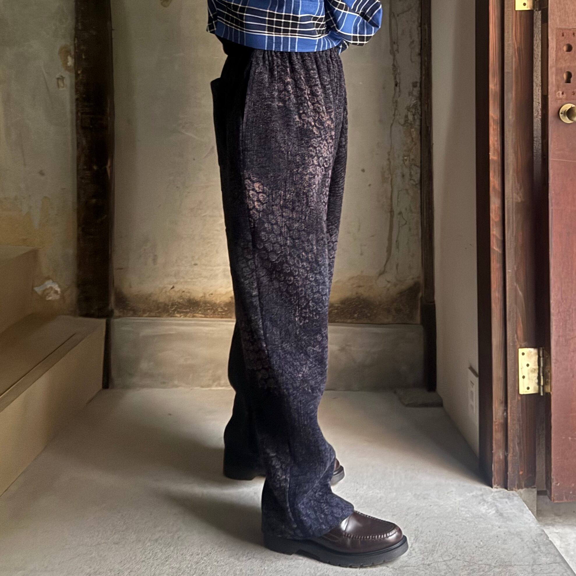 ウエストはゴムと紐で調整できます。腰とわたりにゆとりがあり、裾にかけてゆるやかなテーパードがかかっています。ネイビーをベースにベージュやブラックの色の重ねがきれいです。