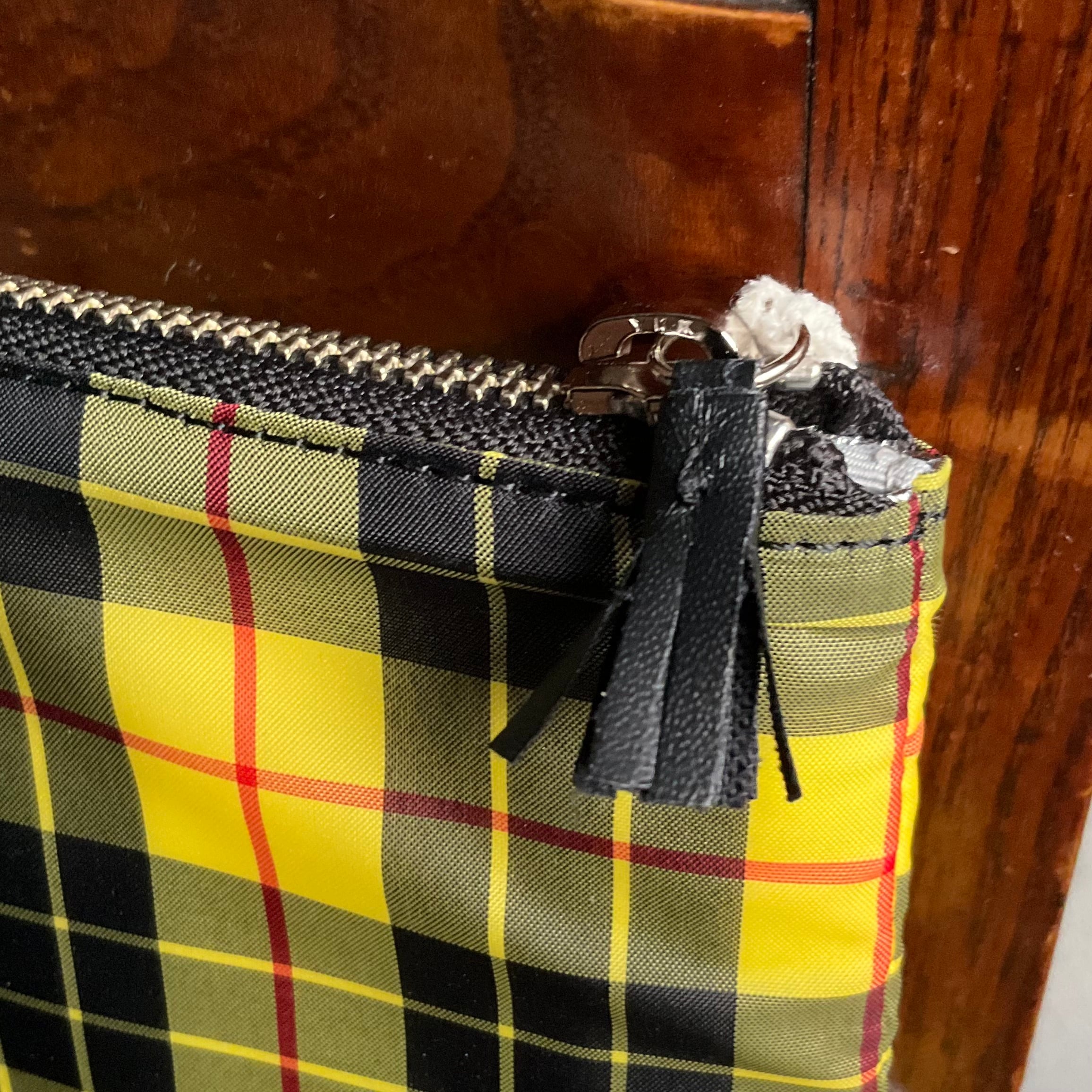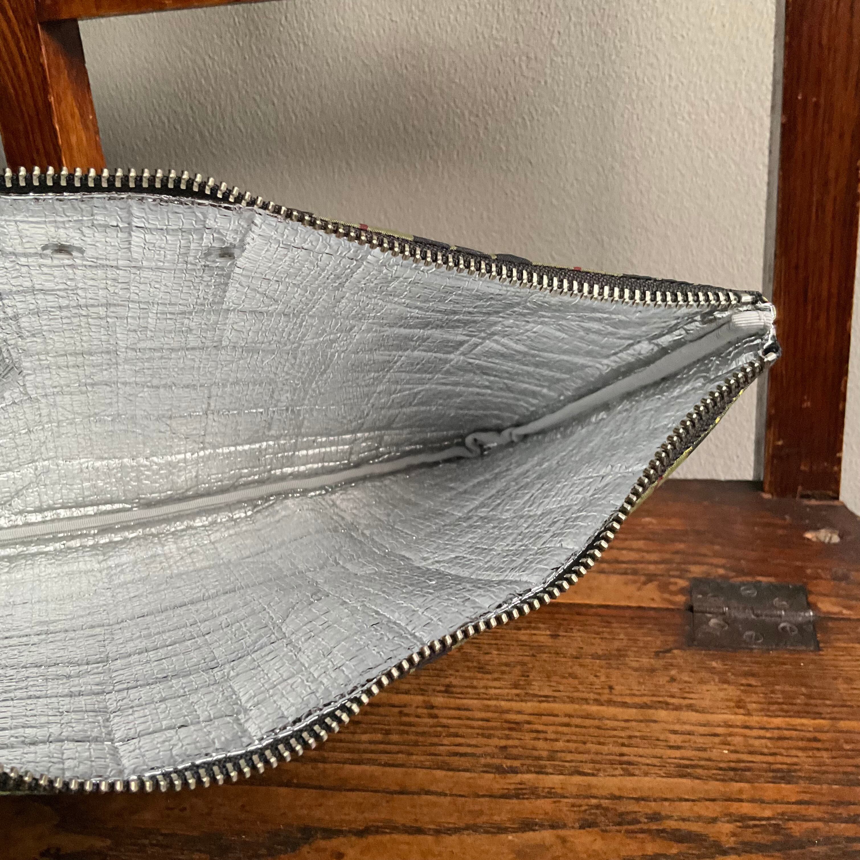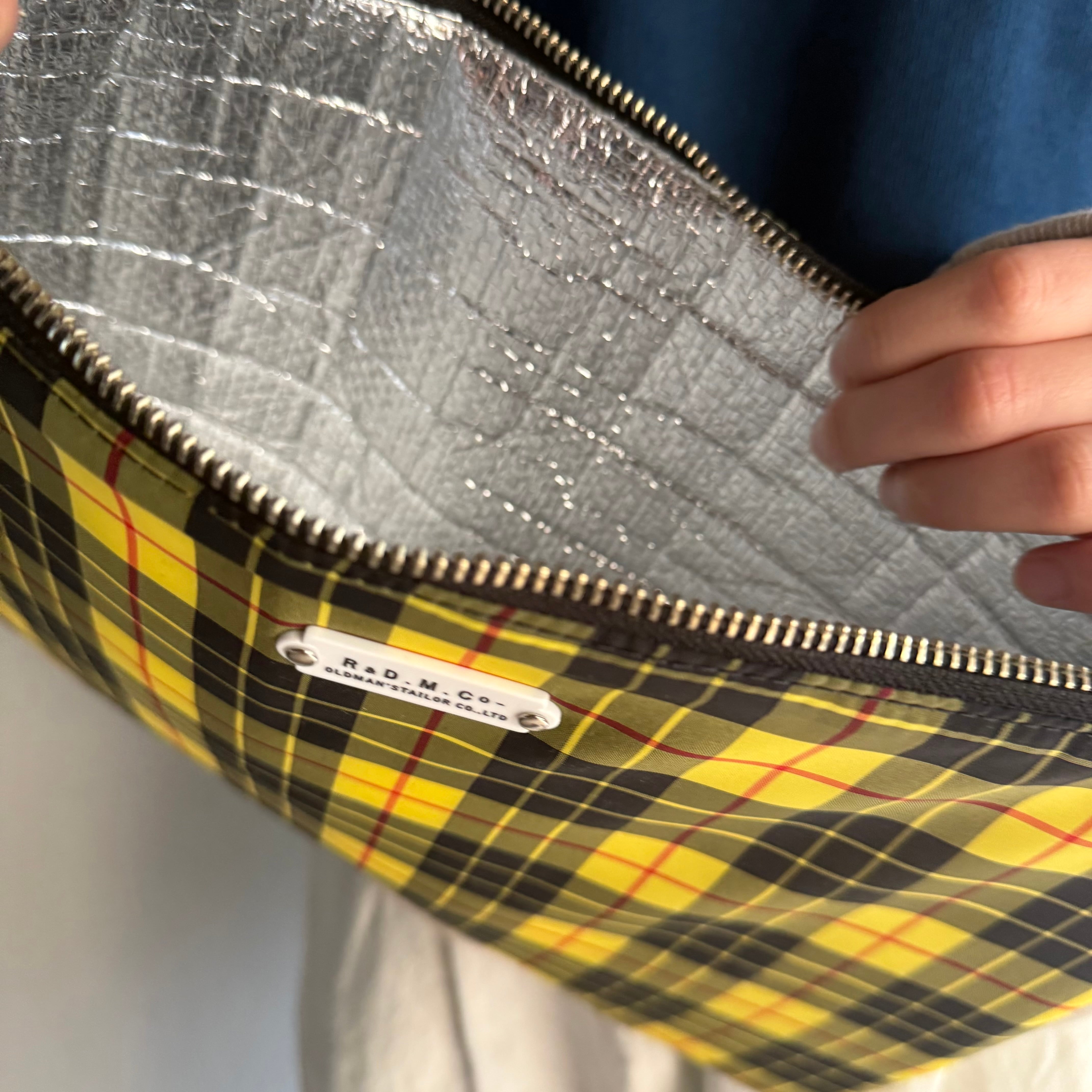 タータンチェック柄の表地はナイロン製、裏側はアルミニウムのクッション性のある素材で、保冷バッグでよく見るような質感。