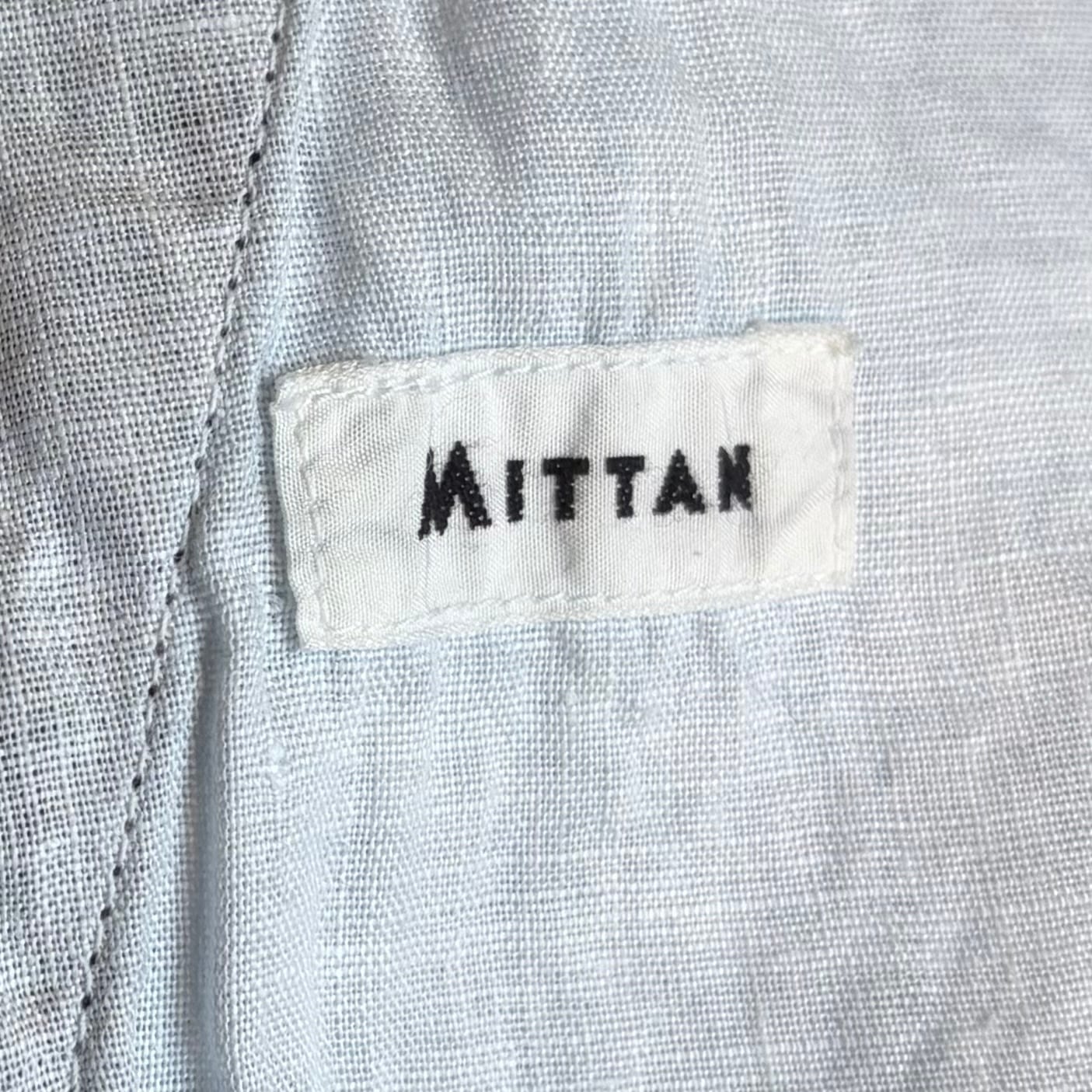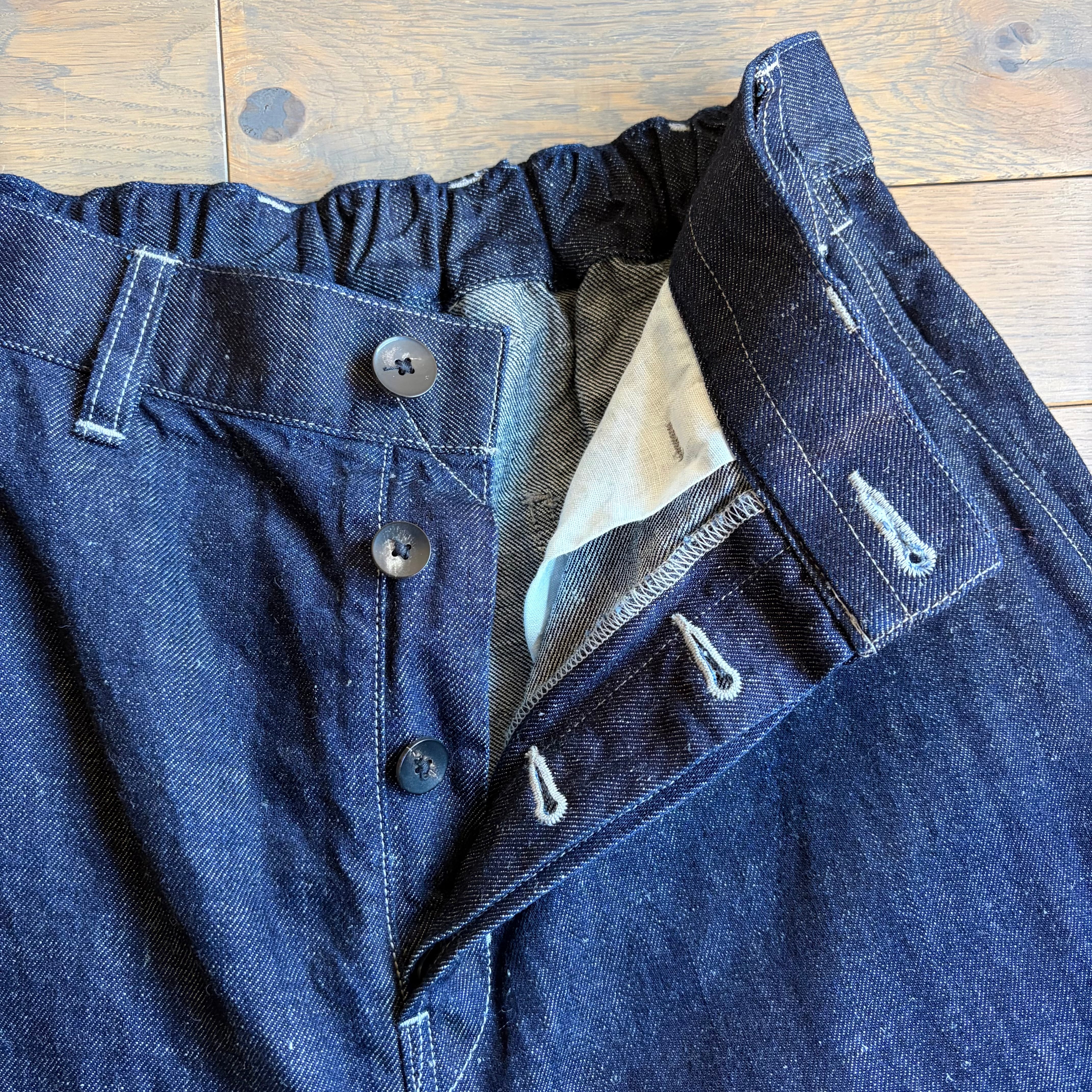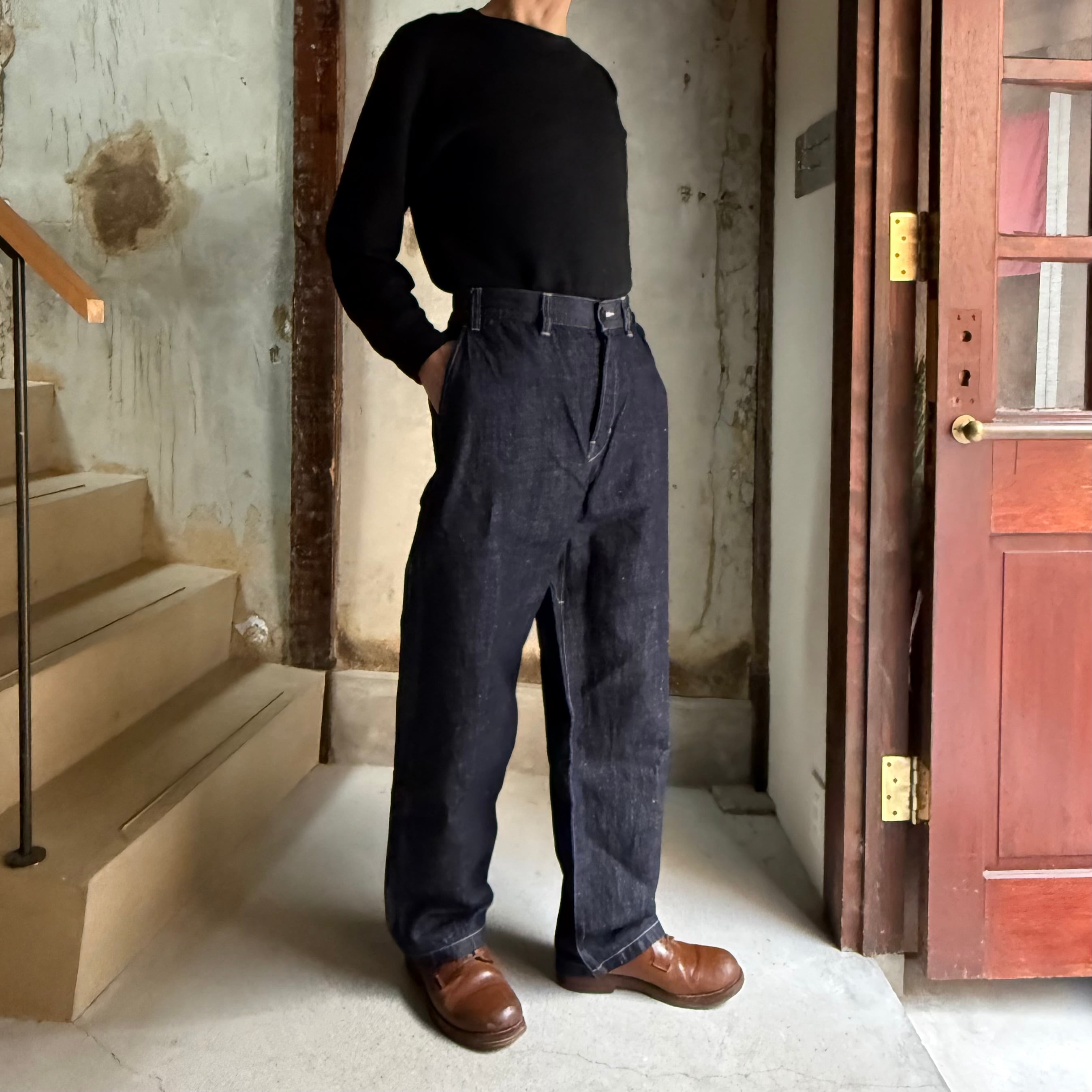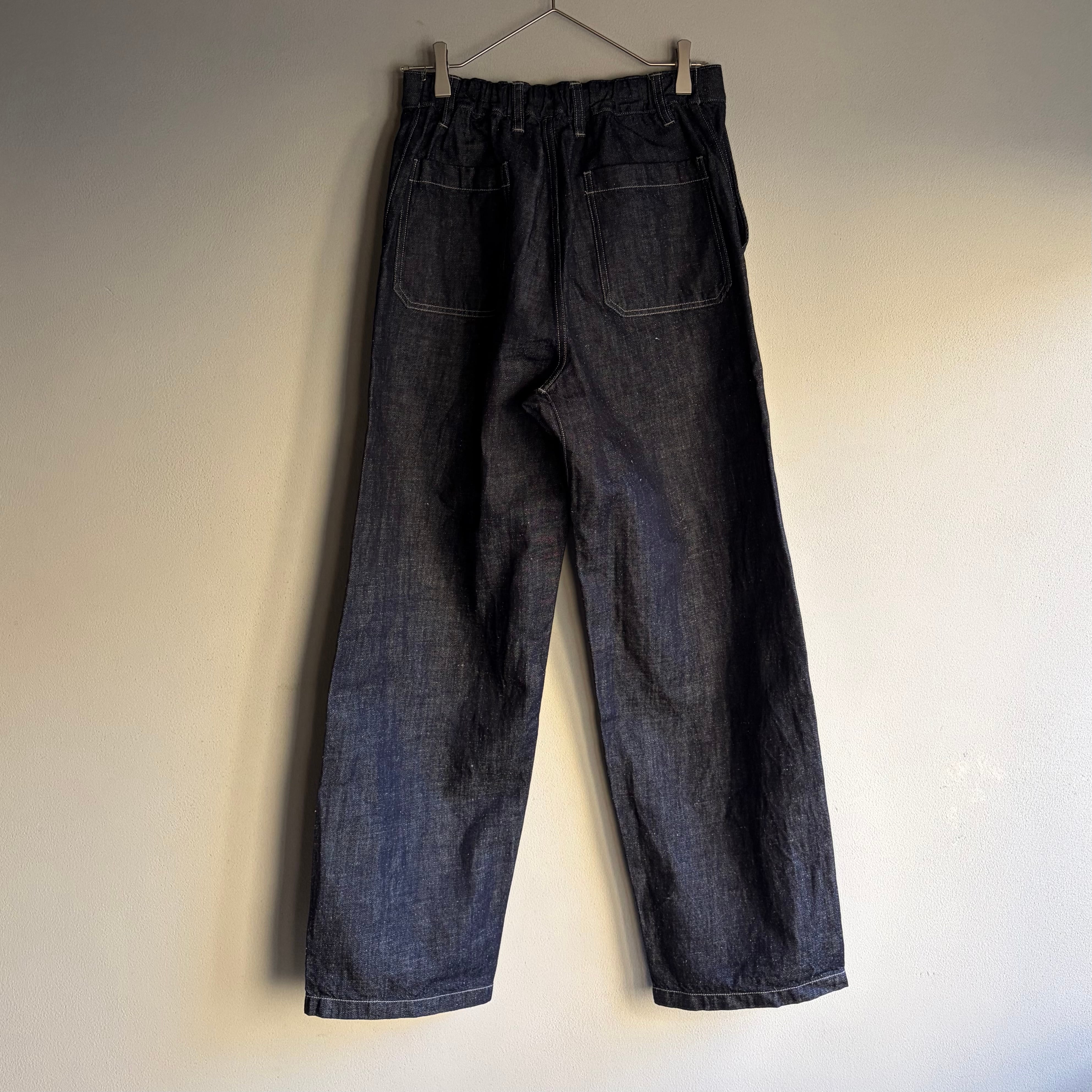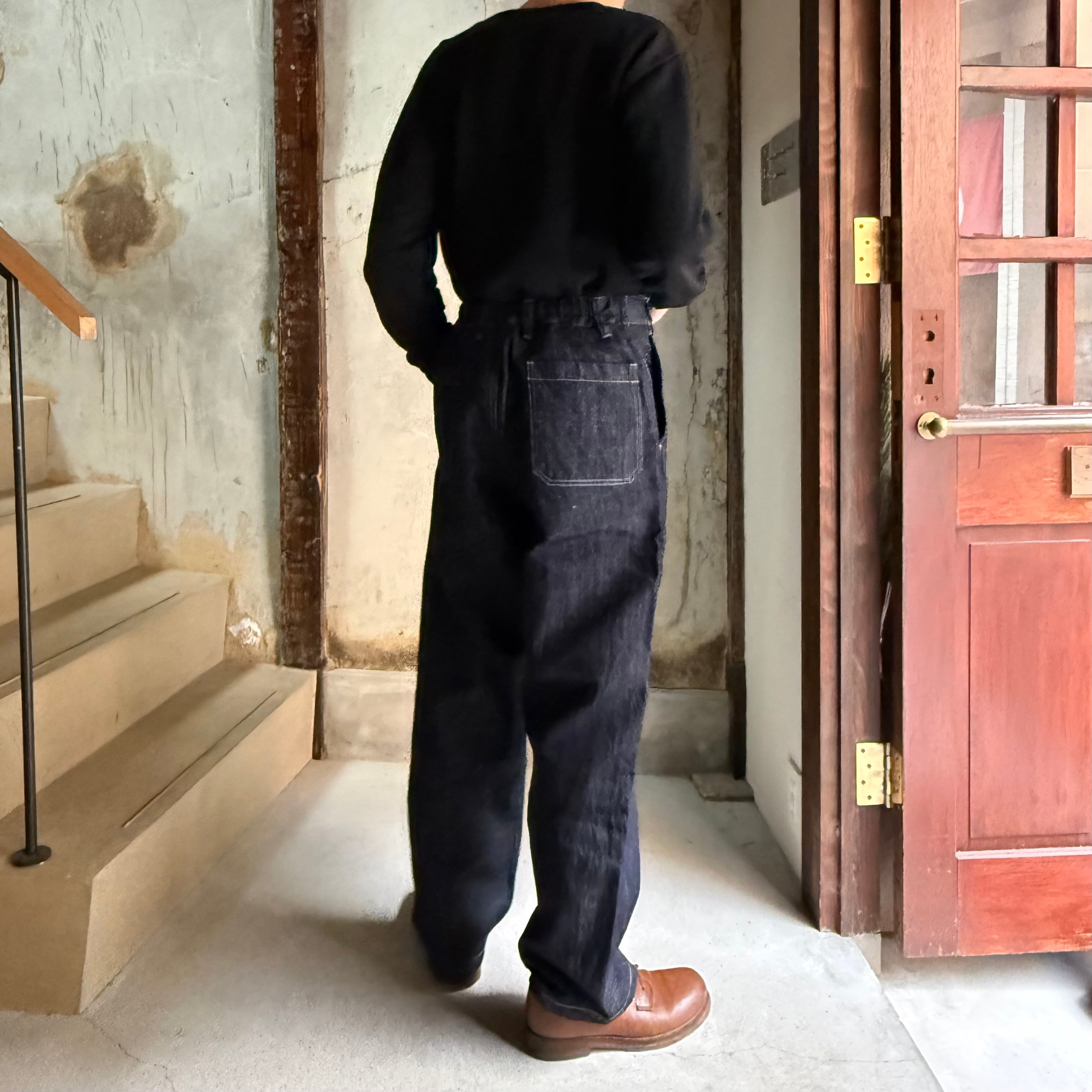 MITTANの定番シルエットを踏襲した、程よくワイドなシルエットのパンツです。ロールアップも可能で、季節を問わず着用できます。ワークウェアの文脈を踏まえながらも、既存のジーンズの形を踏襲せず、日常の道具として再定義しました。後ろウエストベルトには伸縮素材を配し、股下にはマチを設けることで可動域を確保しています。本体の脇と内股にはロックミシンを用い、生地への負担を軽減しながら修理のしやすさも考慮しています。ポケット布には大麻の残布を積極的に使用し、金属パーツを用いず水牛の角のボタンを採用しています。