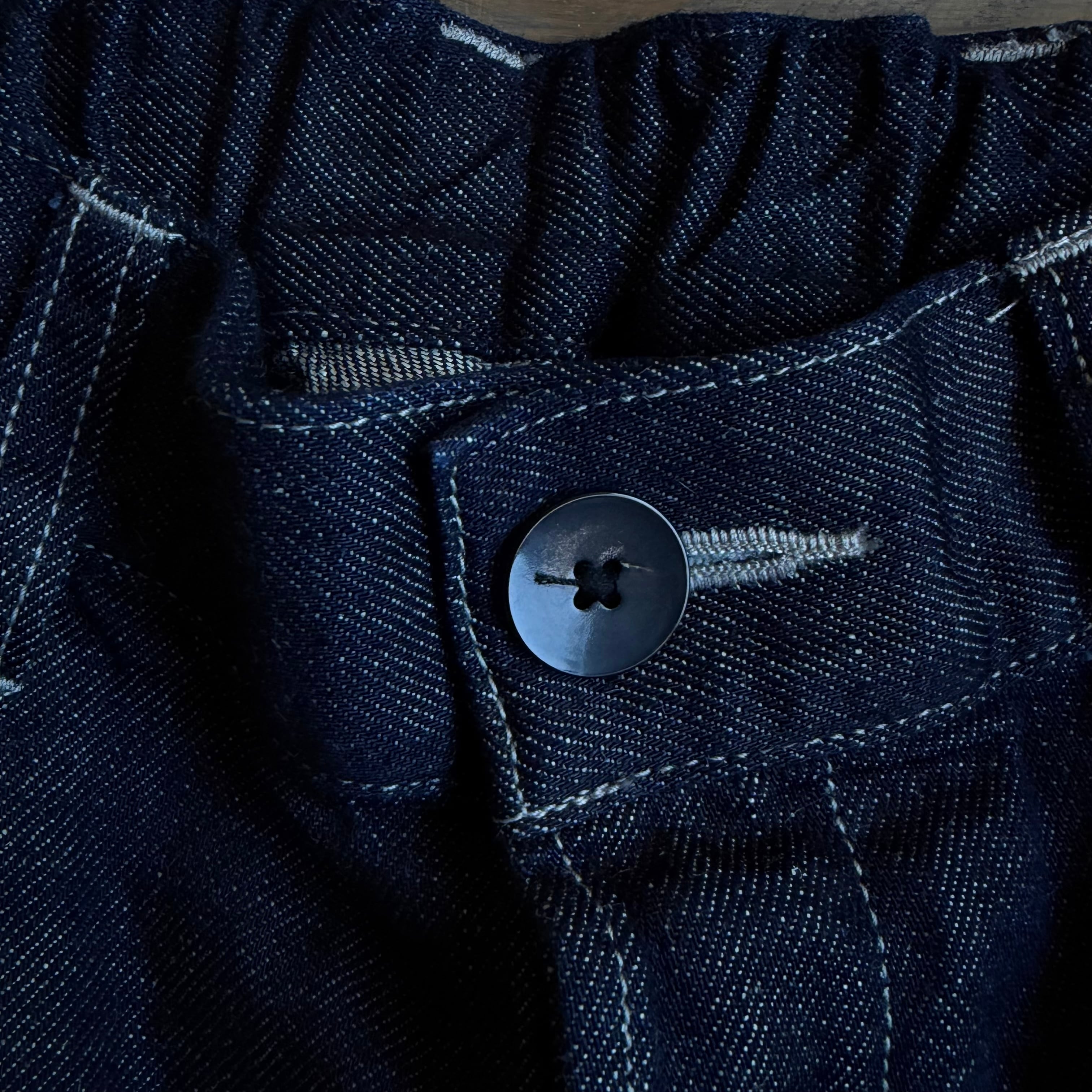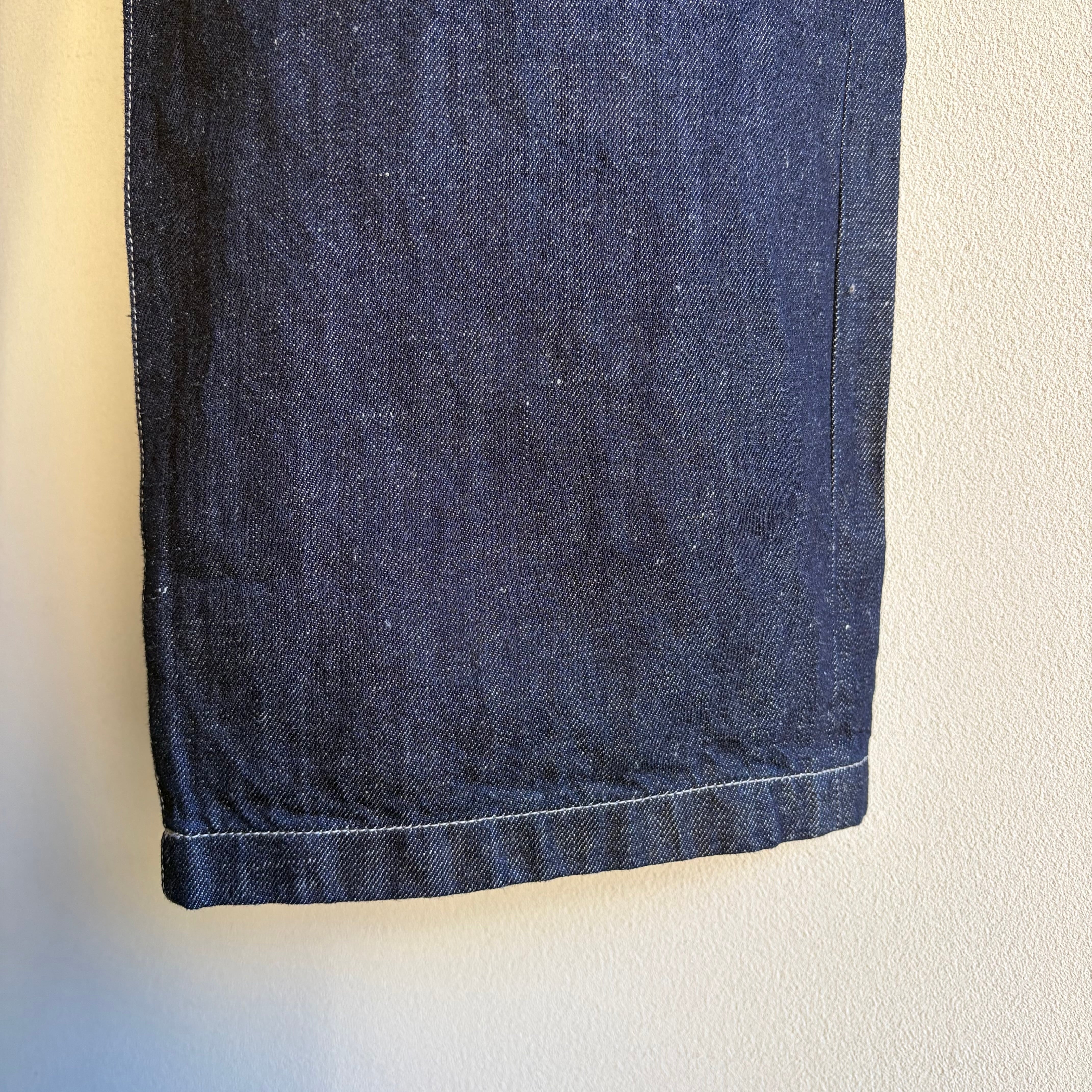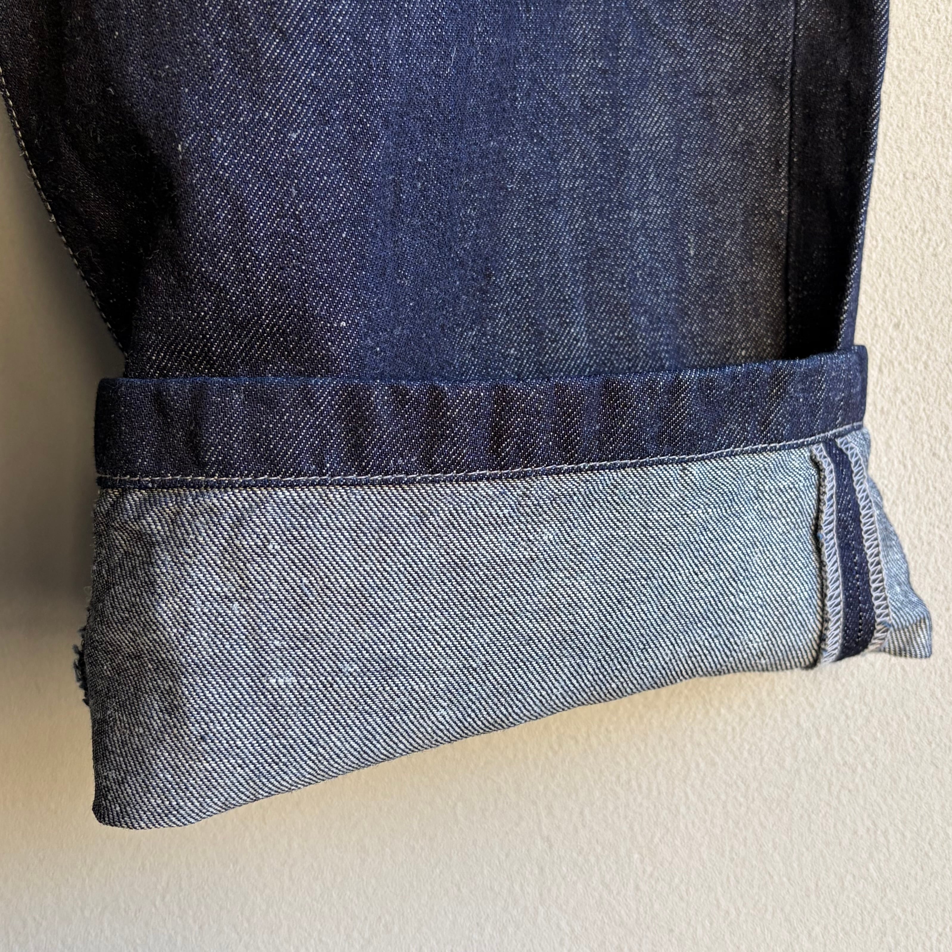 岡山県井原市で織り上げたオリジナルのデニム生地です。経糸にはオーガニックコットンを使用し、ロープ染色によって表面のみをインディゴで染め、糸の芯を白く残しています。緯糸には大麻を用いており、穿き込むほどにインディゴの色が薄く変化し、大麻も強度を保ちながら綿のようにしなやかに変化していきます。長い時間をかけて風合いが深まっていく様子を楽しめる生地です。厚みは、暑い季節から寒い季節まで通して着用できるよう設計しています。着用と洗濯を重ねることで糸がほぐれ、柔軟性が増し、肌側の大麻糸が清涼感のある肌当たりをもたらします。