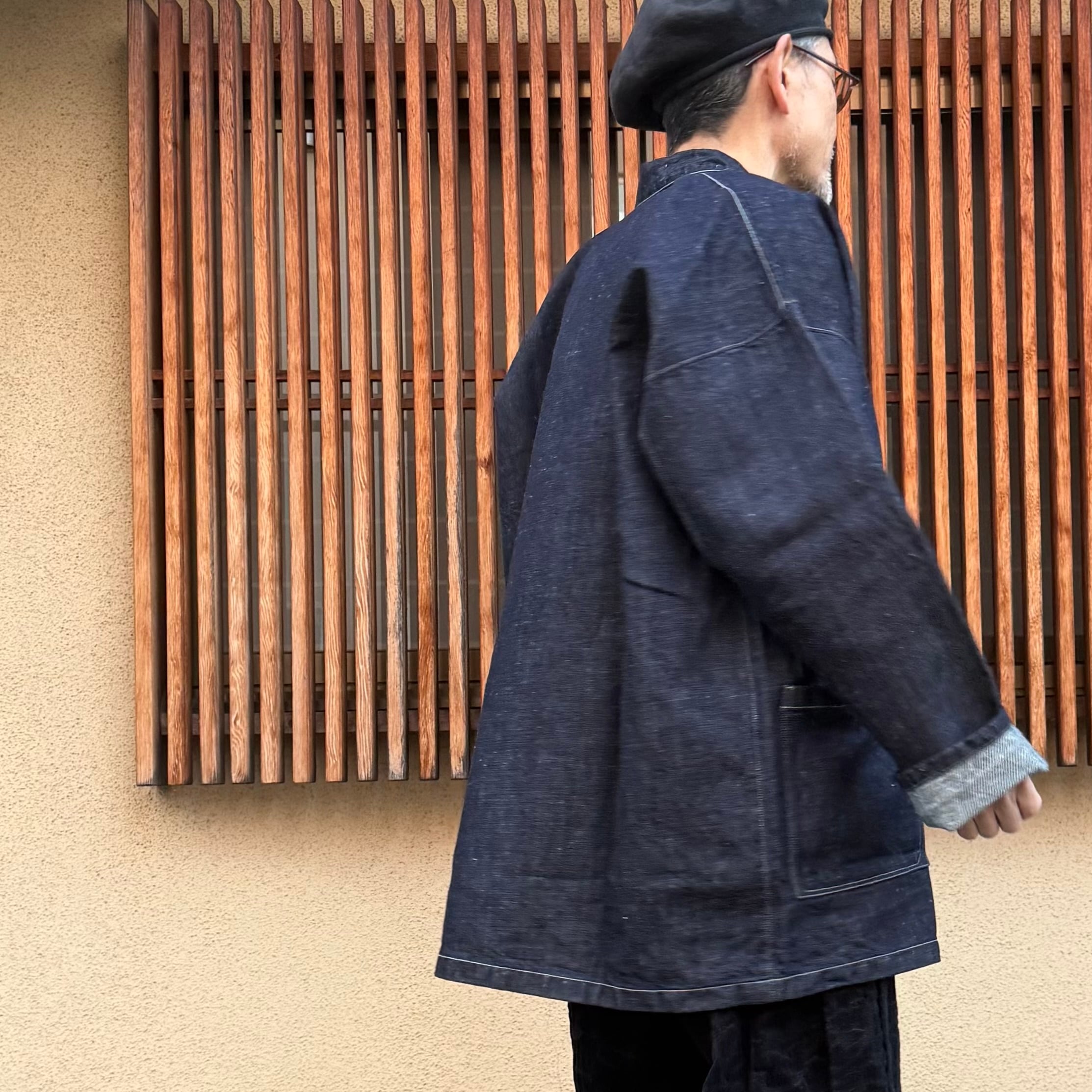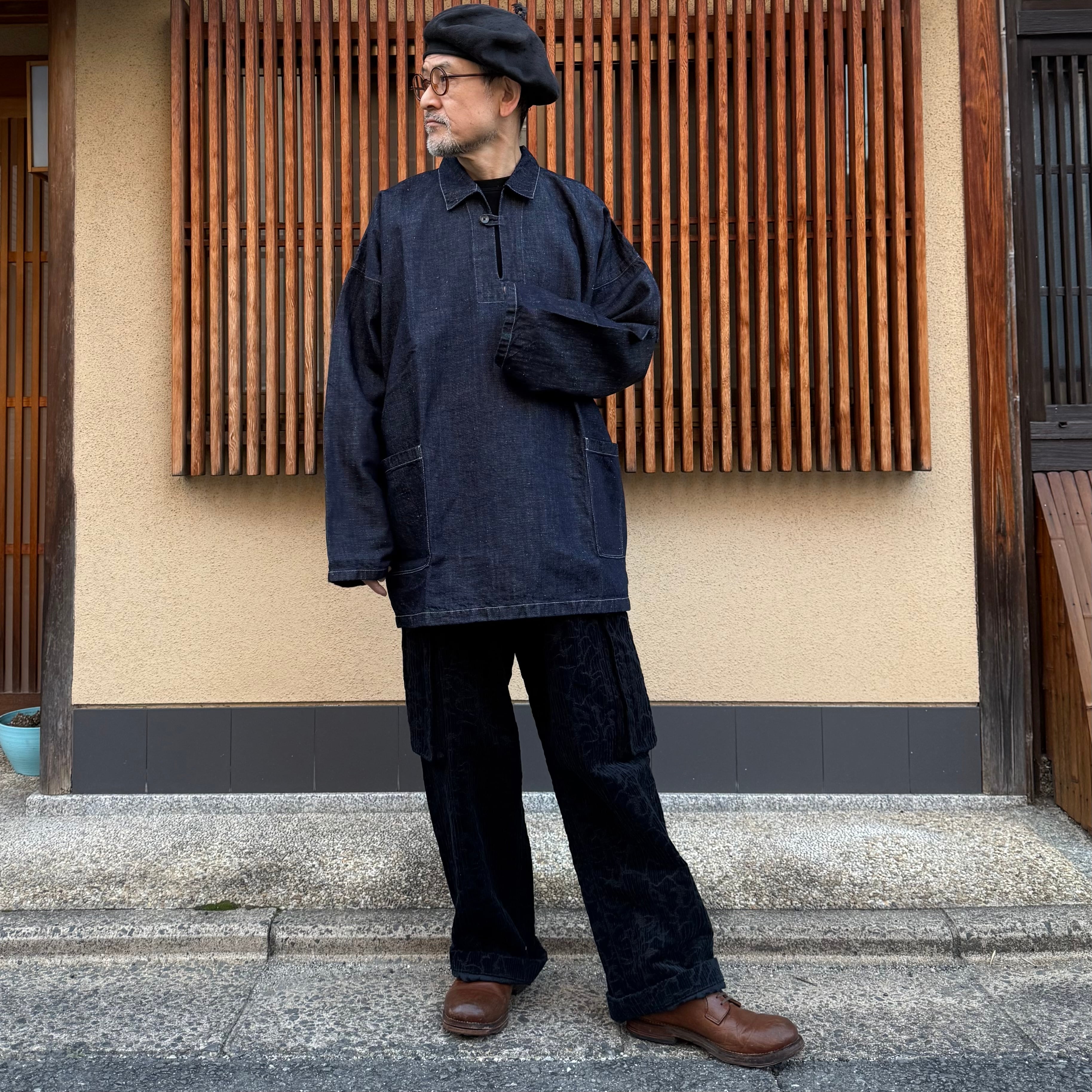 身幅を広く取り、しっかりとしたボリューム感のあるプルオーバーシャツです。ほぼすべてのパーツを直線的なパターンで構成しており、平面的な形が着物のように多様な体型に自然に馴染みます。日常の道具としての利便性を考慮し、ポケットを設けています。ポケットのステッチは角を落とすことで、内部に埃や糸くずが溜まりにくい仕様にしています。ボタンには水牛の角を使用しています。