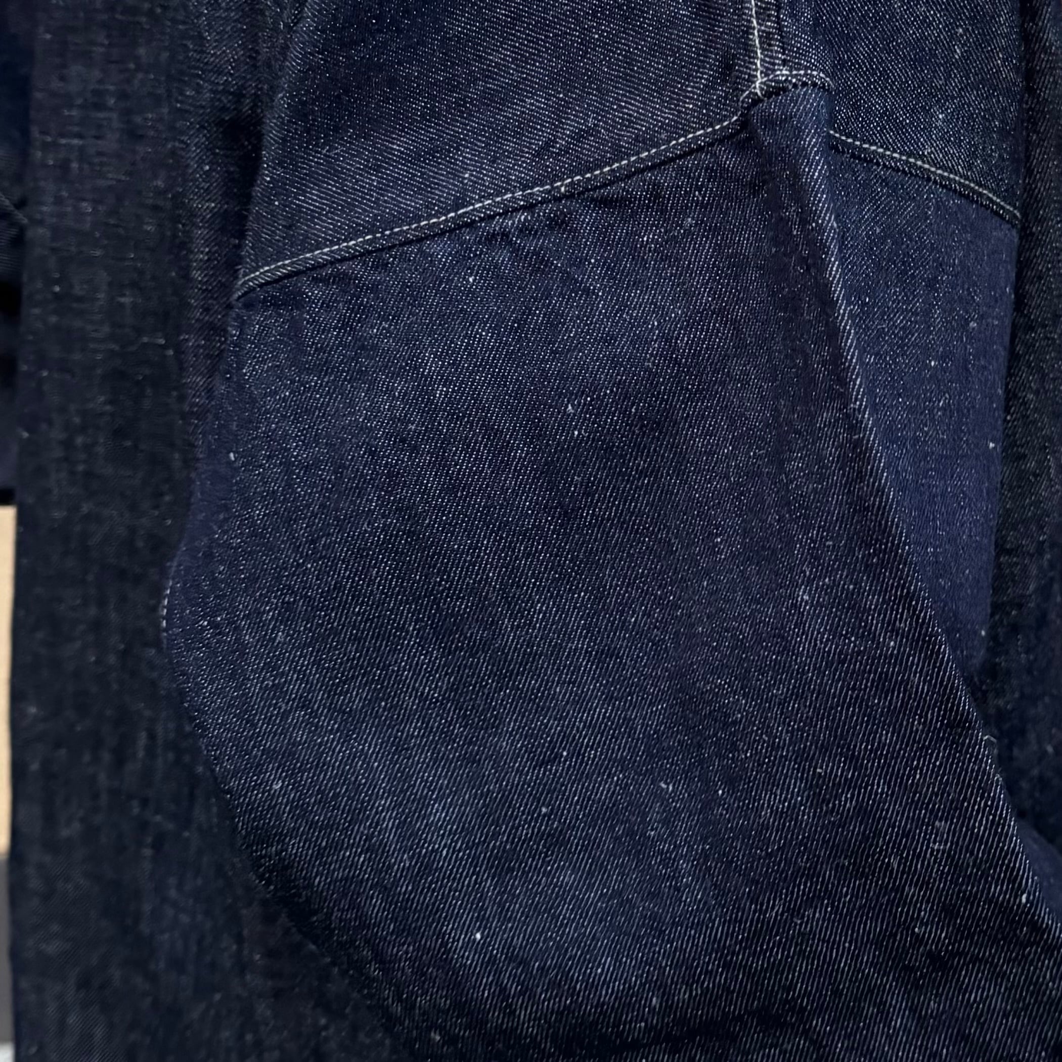 岡山県井原市で織り上げたオリジナルのデニム生地です。経糸にはオーガニックコットンを使用し、ロープ染色によって表面のみをインディゴで染め、糸の芯を白く残しています。緯糸には大麻を用いており、穿き込むほどにインディゴの色が薄く変化し、大麻も強度を保ちながら綿のようにしなやかに変化していきます。長い時間をかけて風合いが深まっていく様子を楽しめる生地です。厚みは、暑い季節から寒い季節まで通して着用できるよう設計しています。着用と洗濯を重ねることで糸がほぐれ、柔軟性が増し、肌側の大麻糸が清涼感のある肌当たりをもたらします。