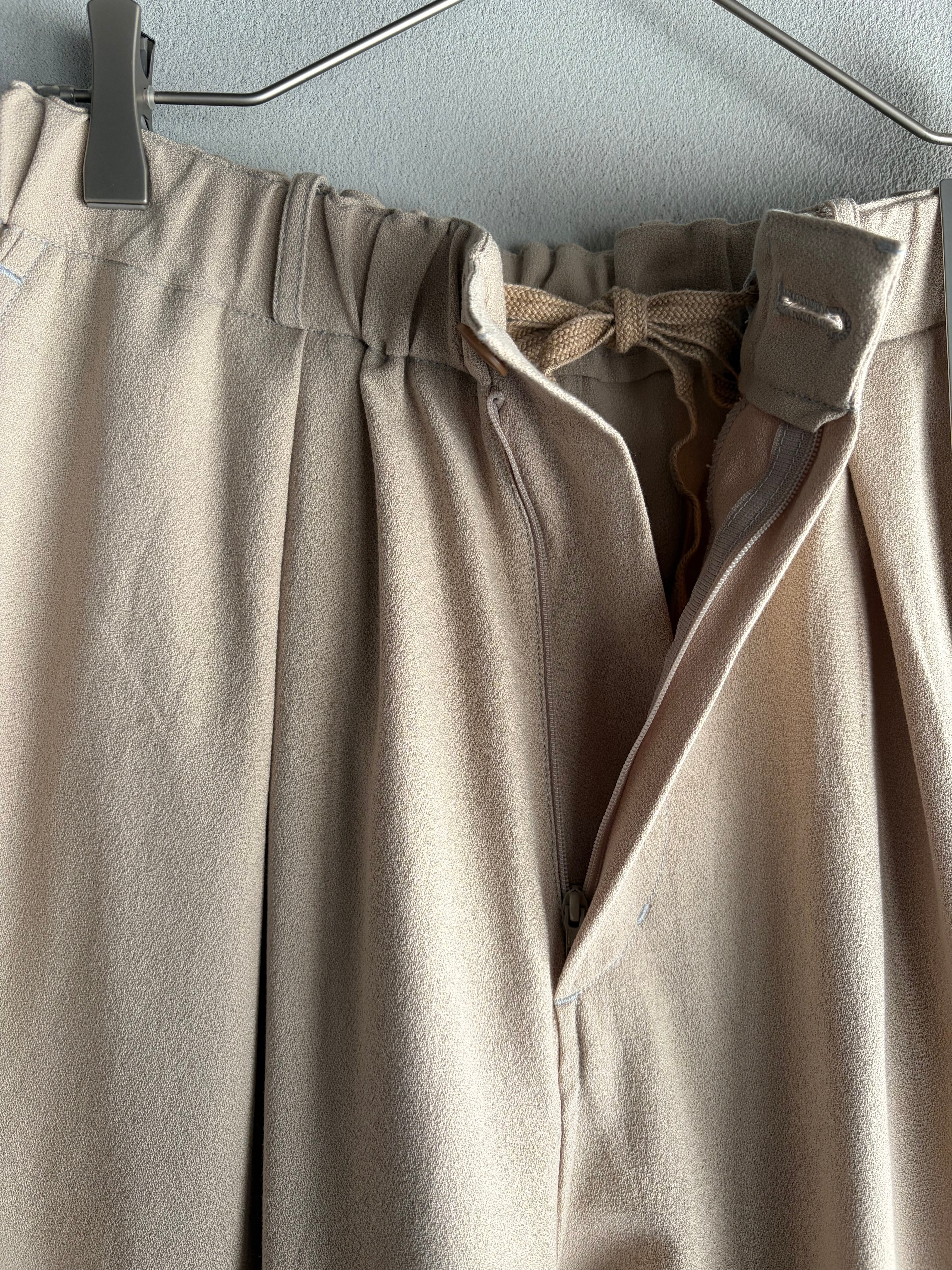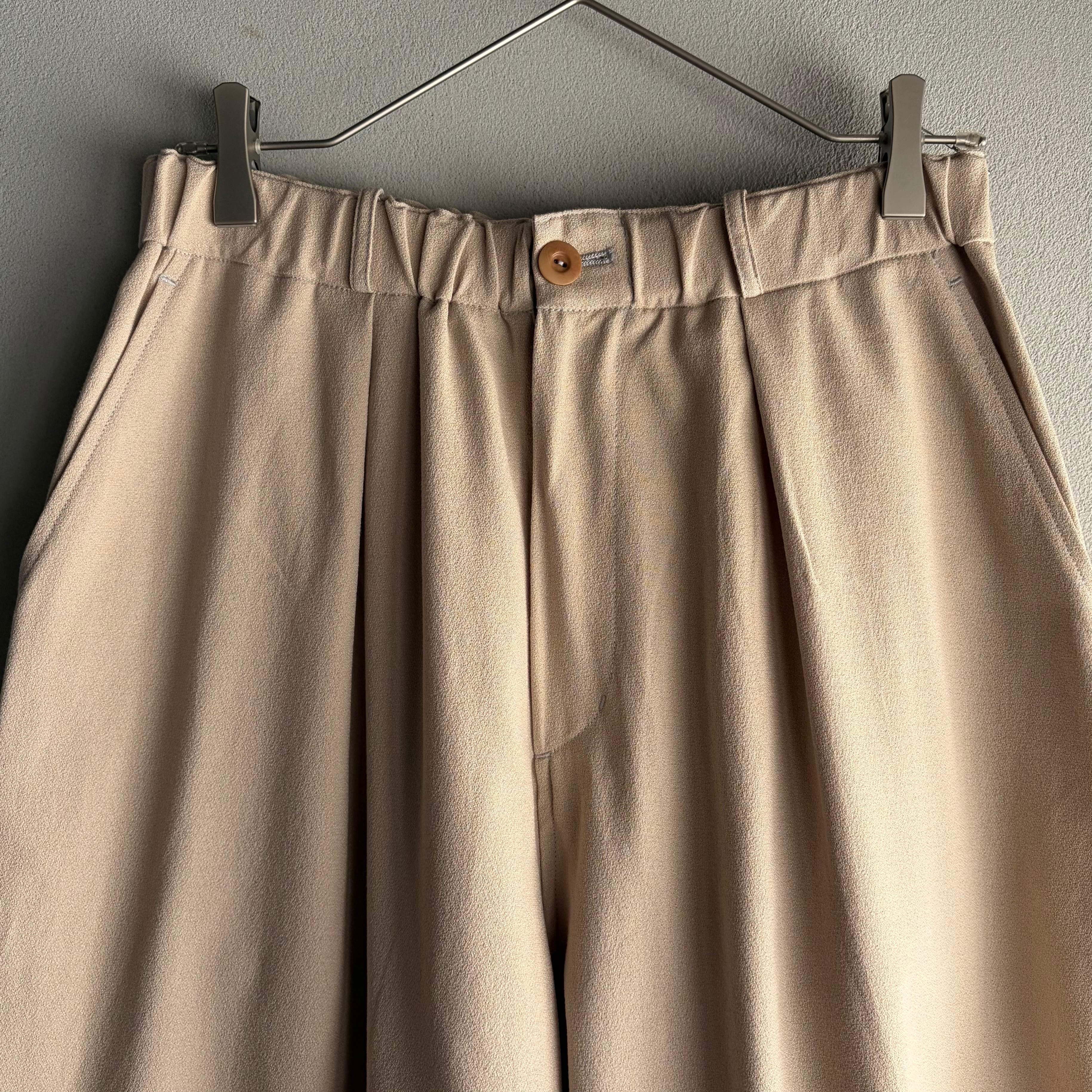 シルエットは、フロントに大きなタックを入れることで立体感とゆとりをプラス。