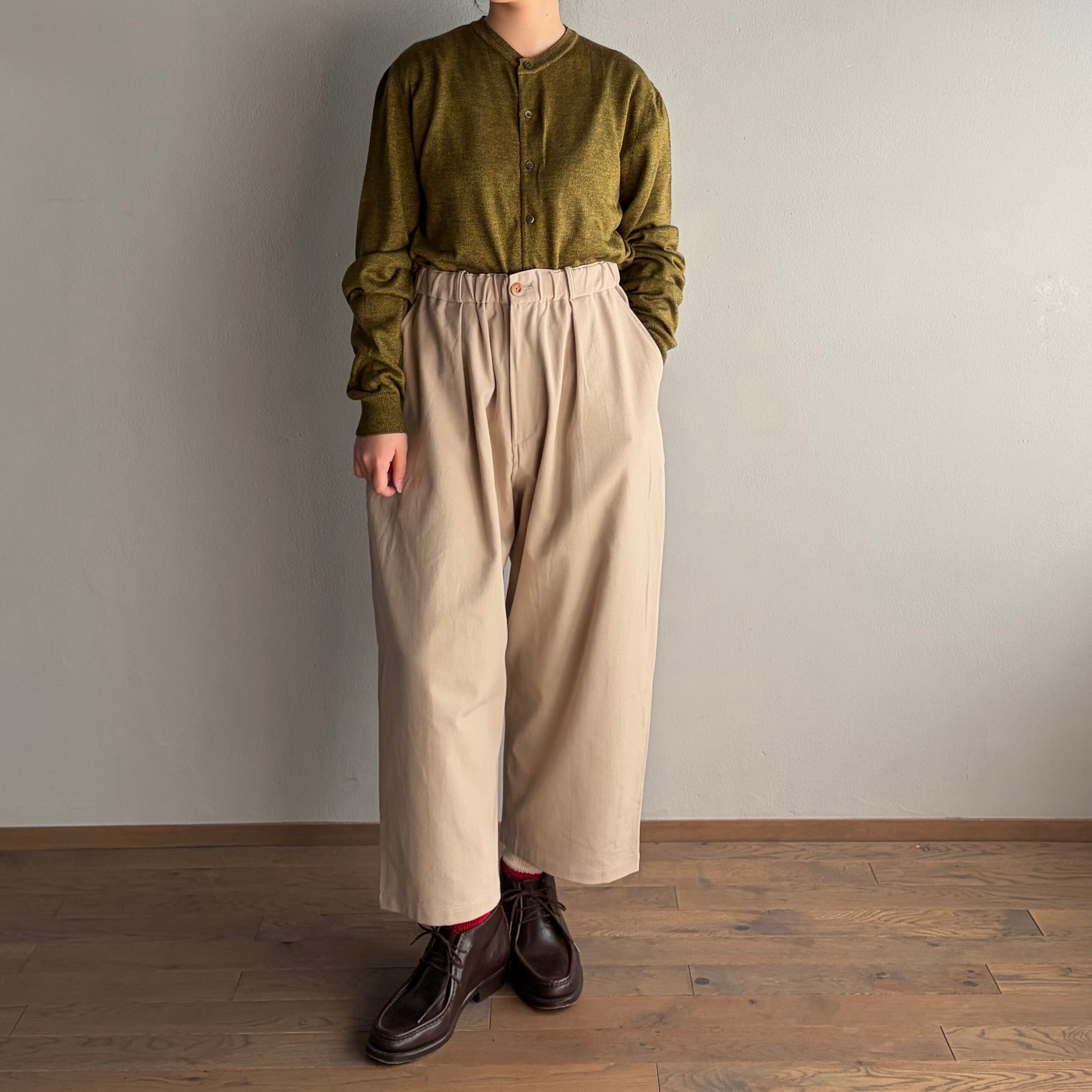 薄茶の色は、チノパンのようなイメージで、きちんとした雰囲気にもカジュアルにも幅広く合わせやすい色味です。