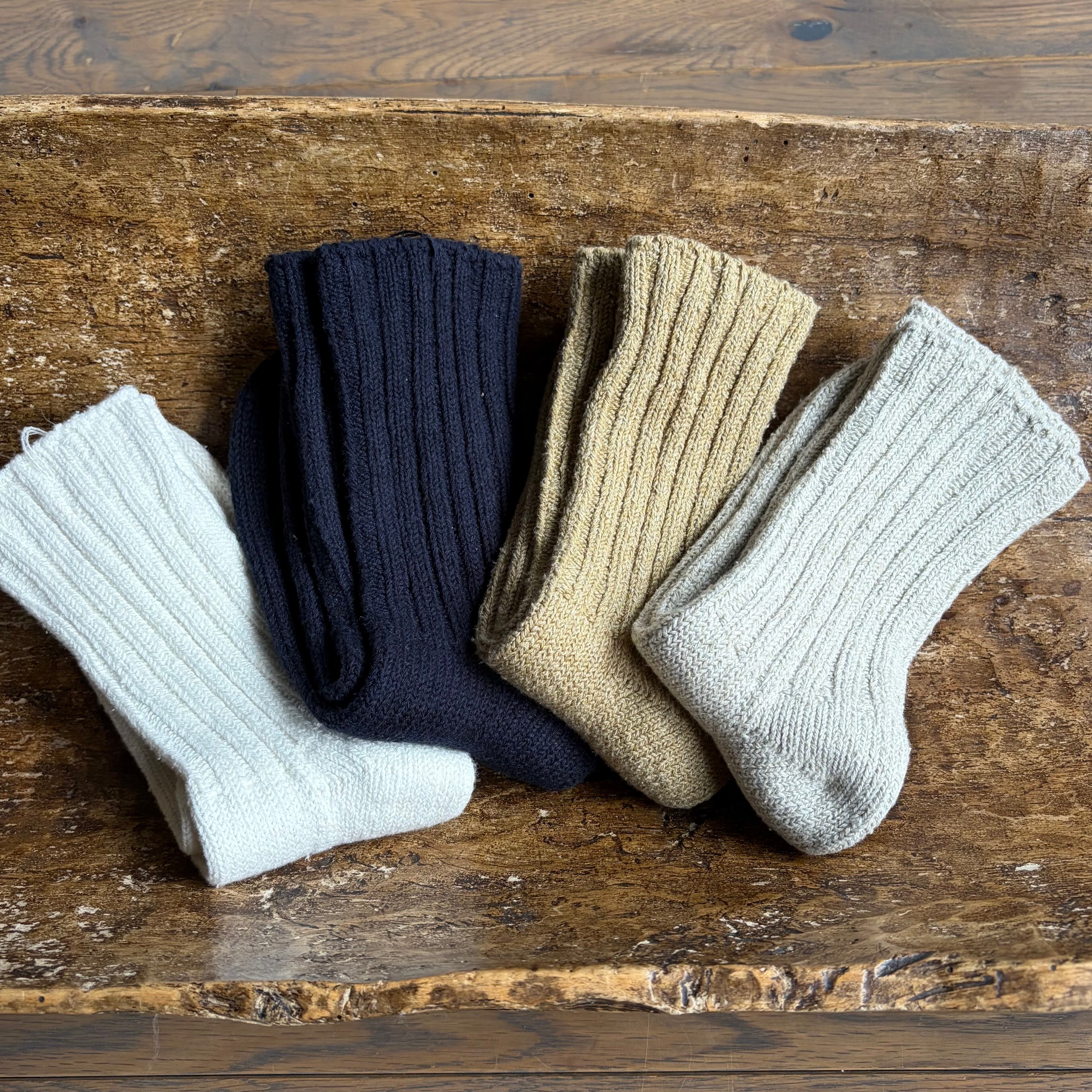 踵から履き口にかけて太めで深みのあるリブ編みで、靴からのぞいた足首辺りの雰囲気は上質感にあふれ、とても魅力的です。肉厚ですが、太めの糸でざっくりとした編み上げで通気性もよく、オールシーズン履いていただけます。プレゼントとしても人気があります。