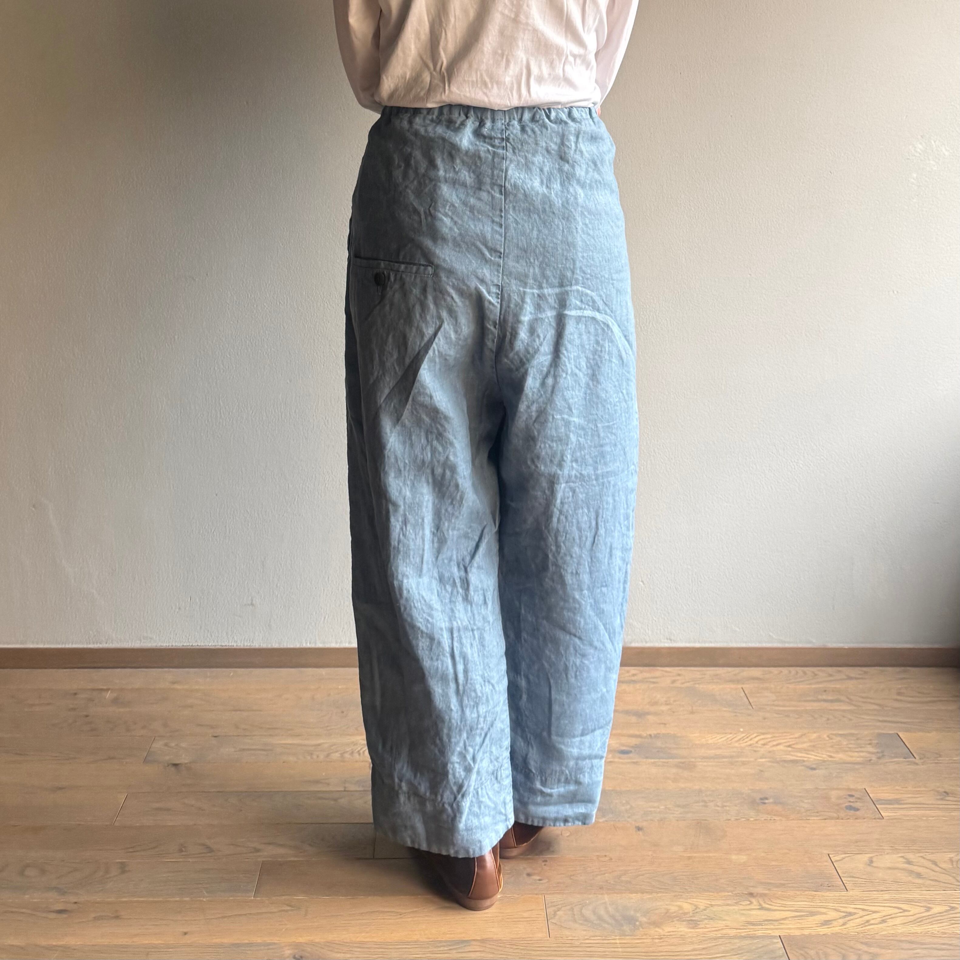 たっぷりとゆとりを持たせたウエストを紐でギュッと絞るスタイル。股上が深く、リラックスした穿き心地ながら、裾にかけての絶妙なラインが洗練されたシルエットを描きます。