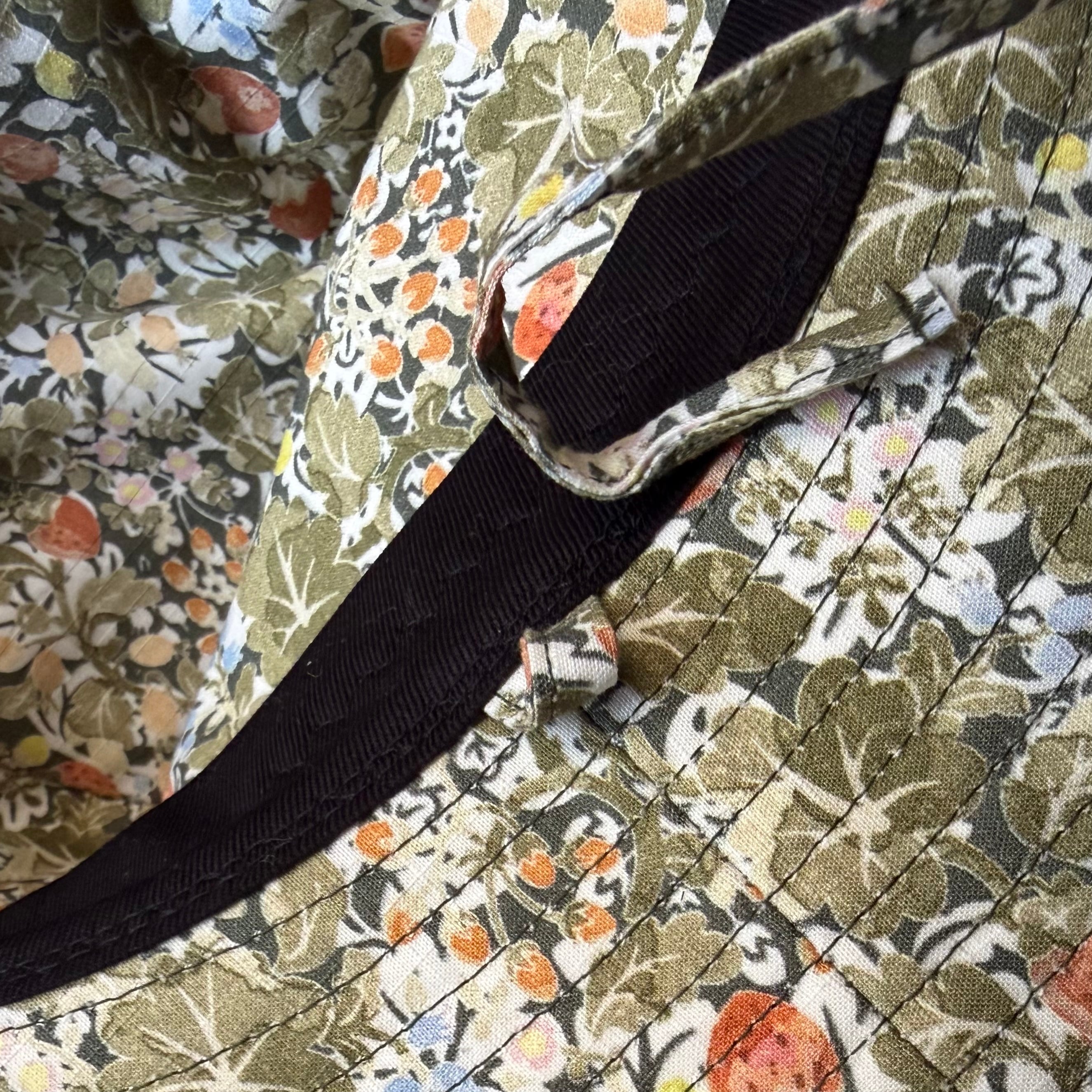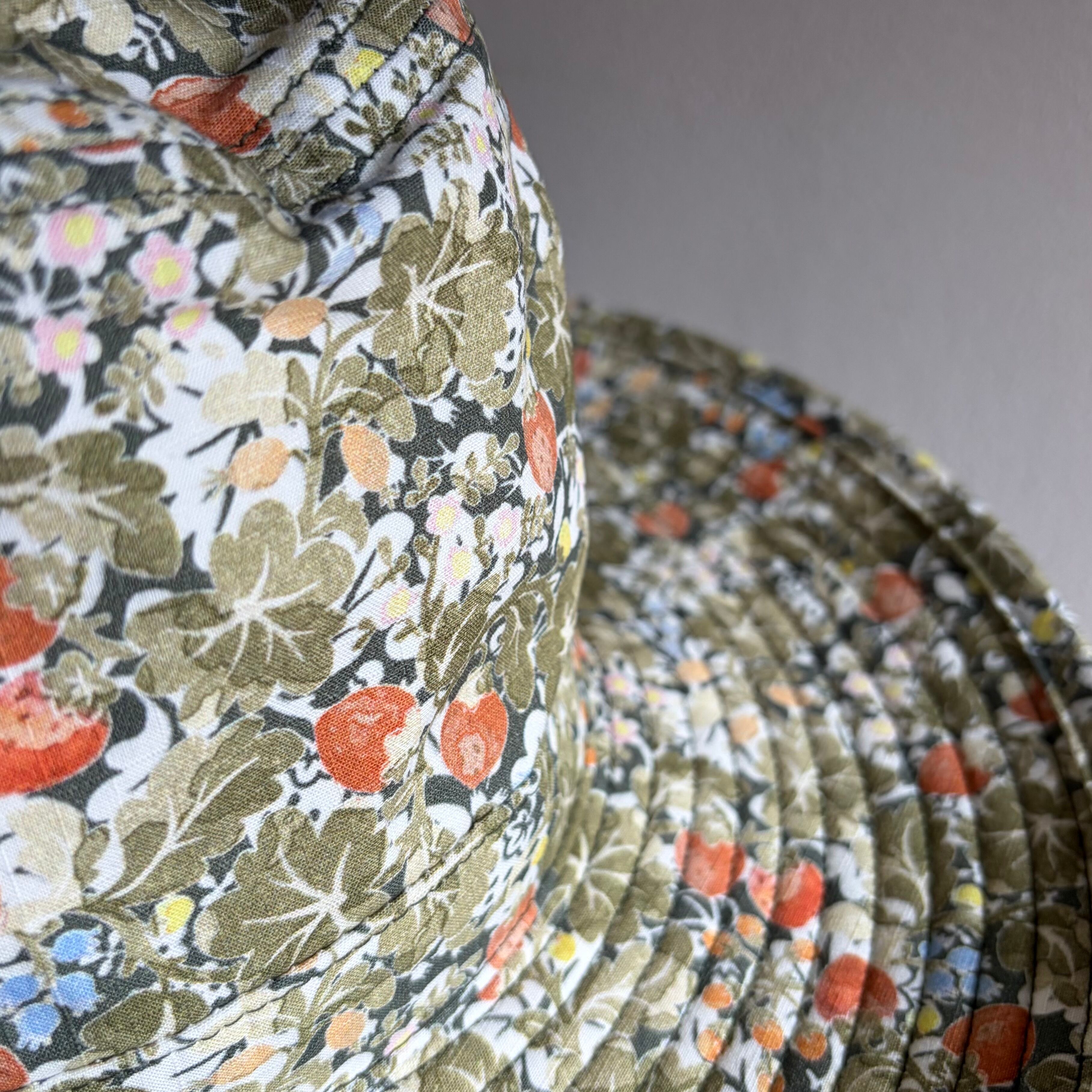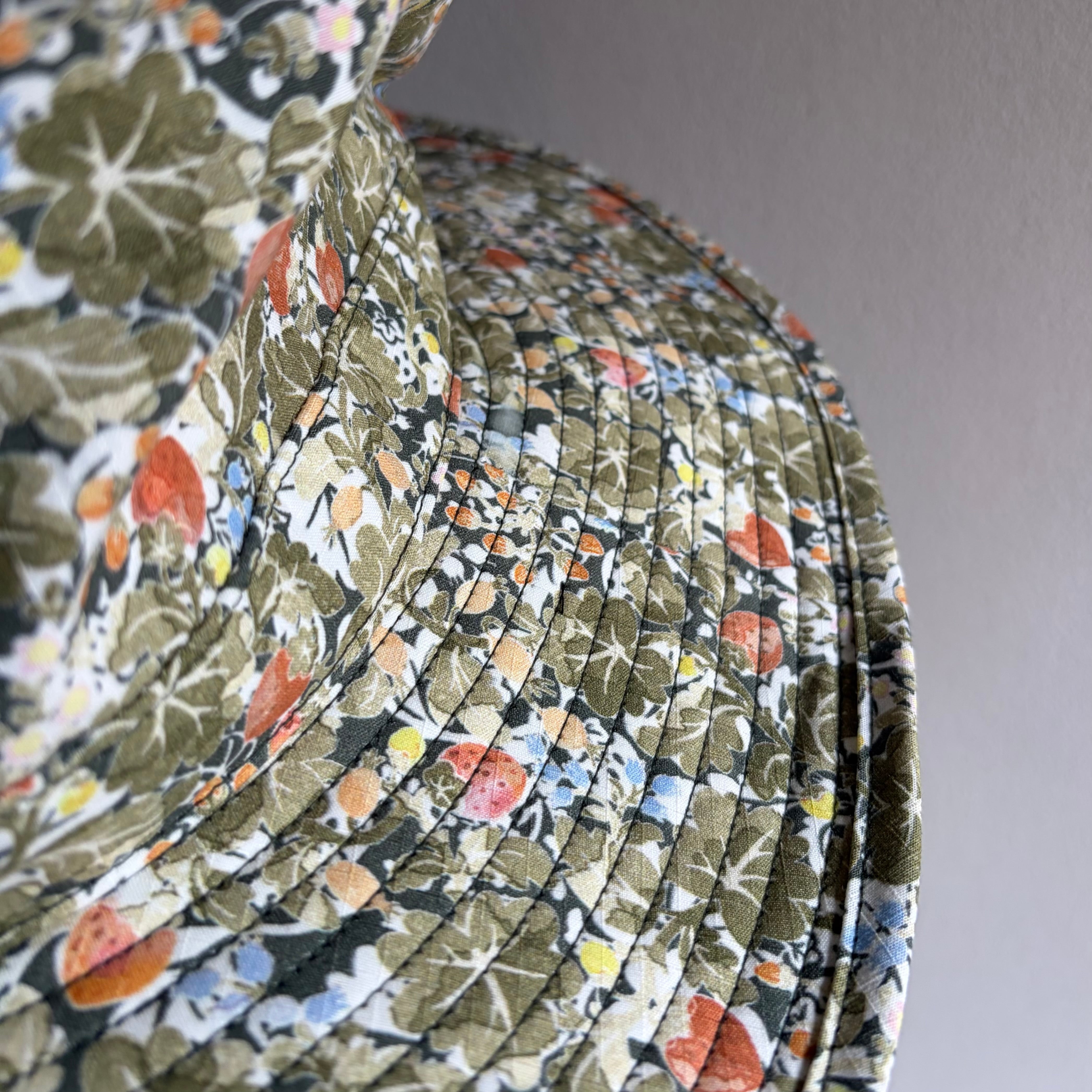 Sepiaの色は、少しトーンを落としたオリーブ色、もしくはカーキ色を基調に、野イチゴの赤や小花の水色、黄色などが上品に散りばめられた、なんとも大人びた雰囲気とかわいらしさが溶け合った魅力的なプリント柄です。