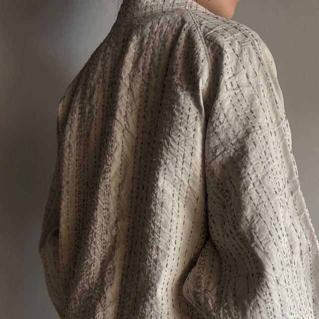 経糸にはオーガニックコットン、緯糸にはラミー(麻)と大麻を。そして、それらを繋ぎ合わせるように太番手のシルク糸で刺し子柄を描いています。表面は軽やかで光沢があり、肌に触れる裏面は涼やかで柔らかい。相反する要素が心地よく同居しています。