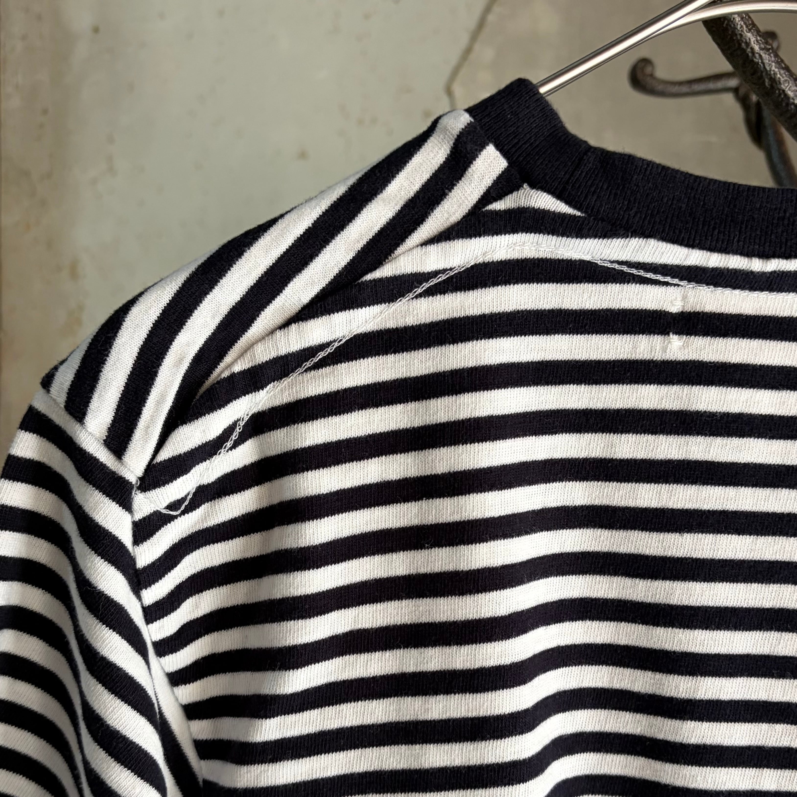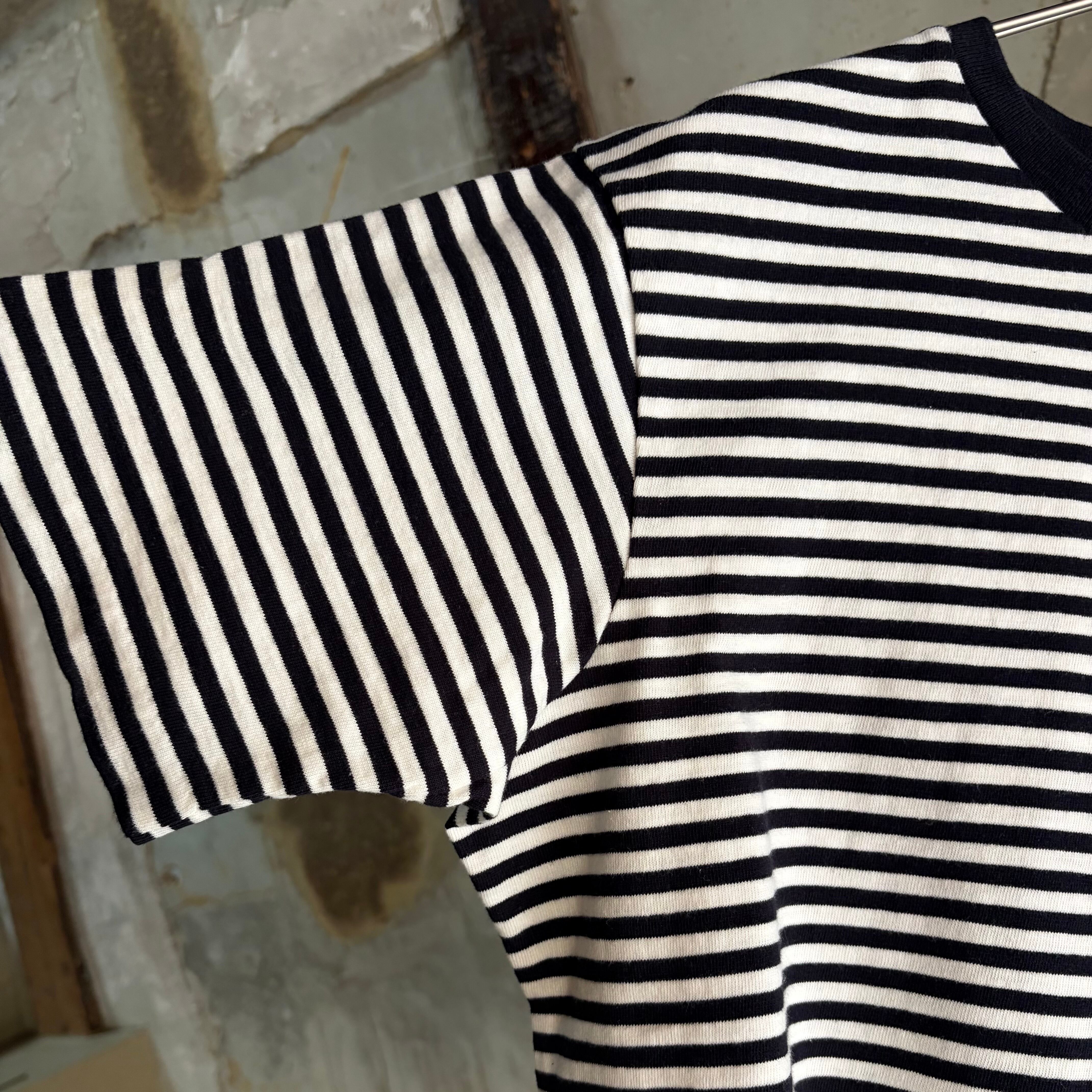 細めのボーダー柄は、洗練された印象で、ベーシックアイテムとしてワードローブに加えたい1着です。