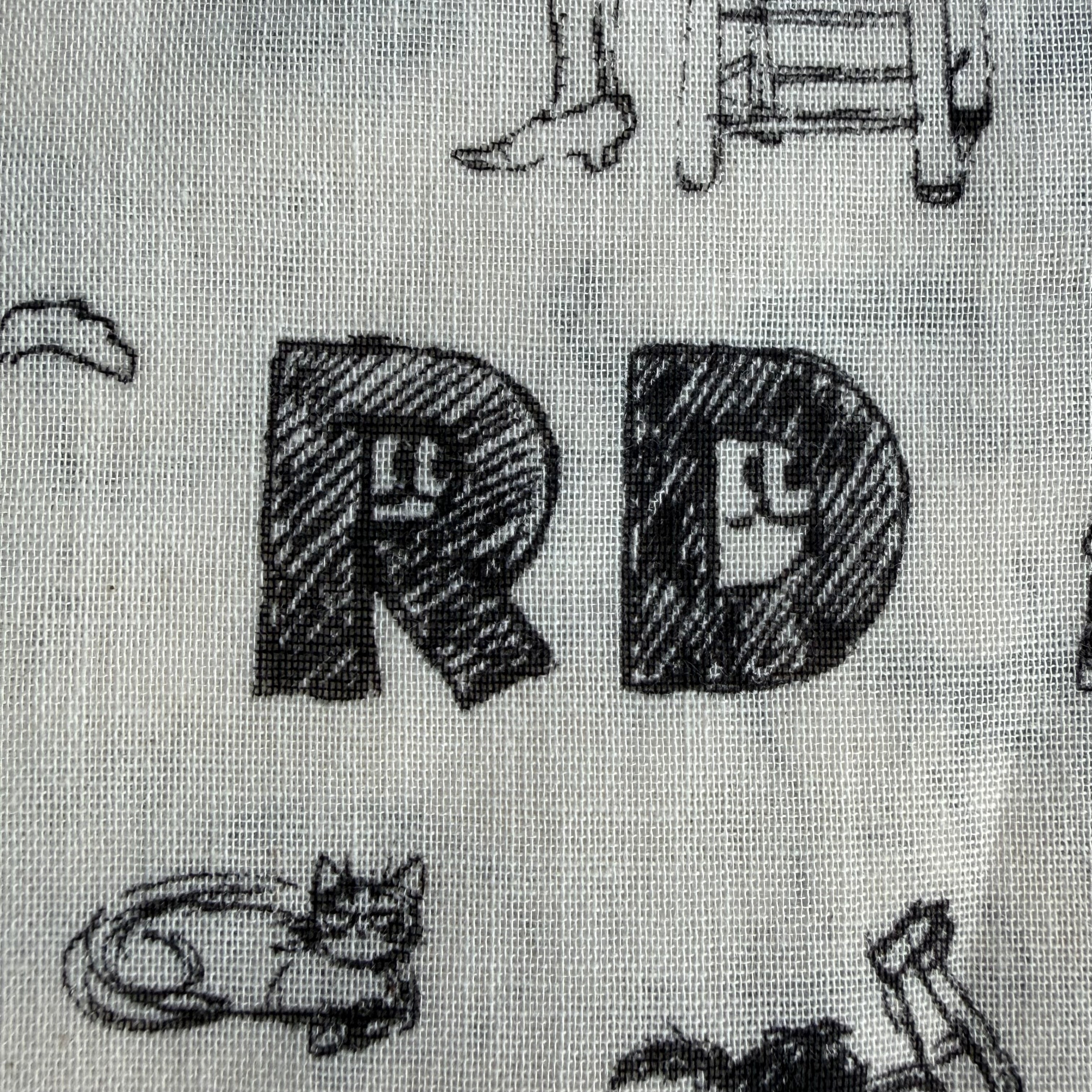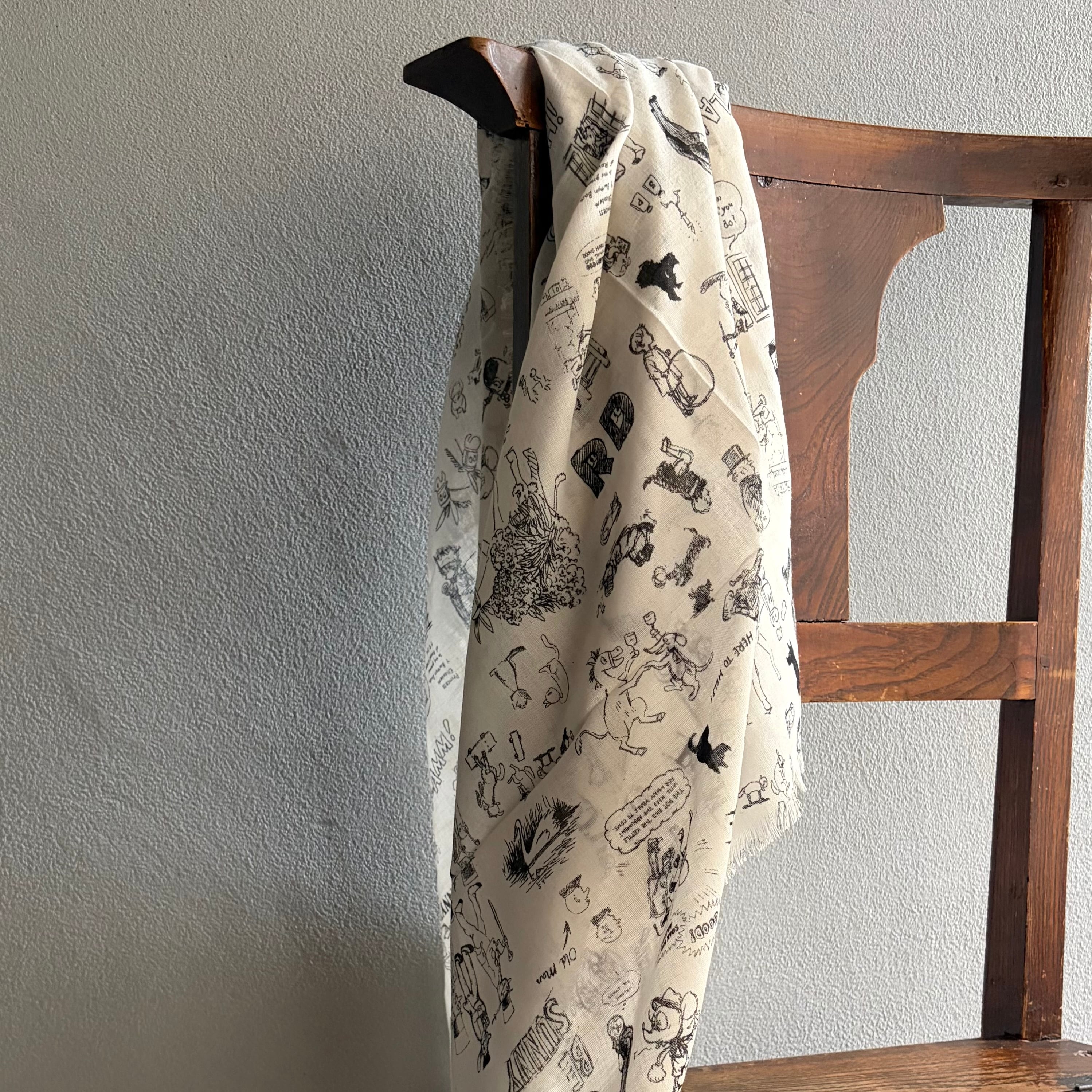 まるで海外の古いコミックや、アーティストのスケッチブックの1ページをそのまま切り取ったような、ストーリー性を感じる総柄プリント。王様や動物たちなど、どこかシュールで個性的なイラストも、モノトーンの線画なら子供っぽくならずシックに決まります。