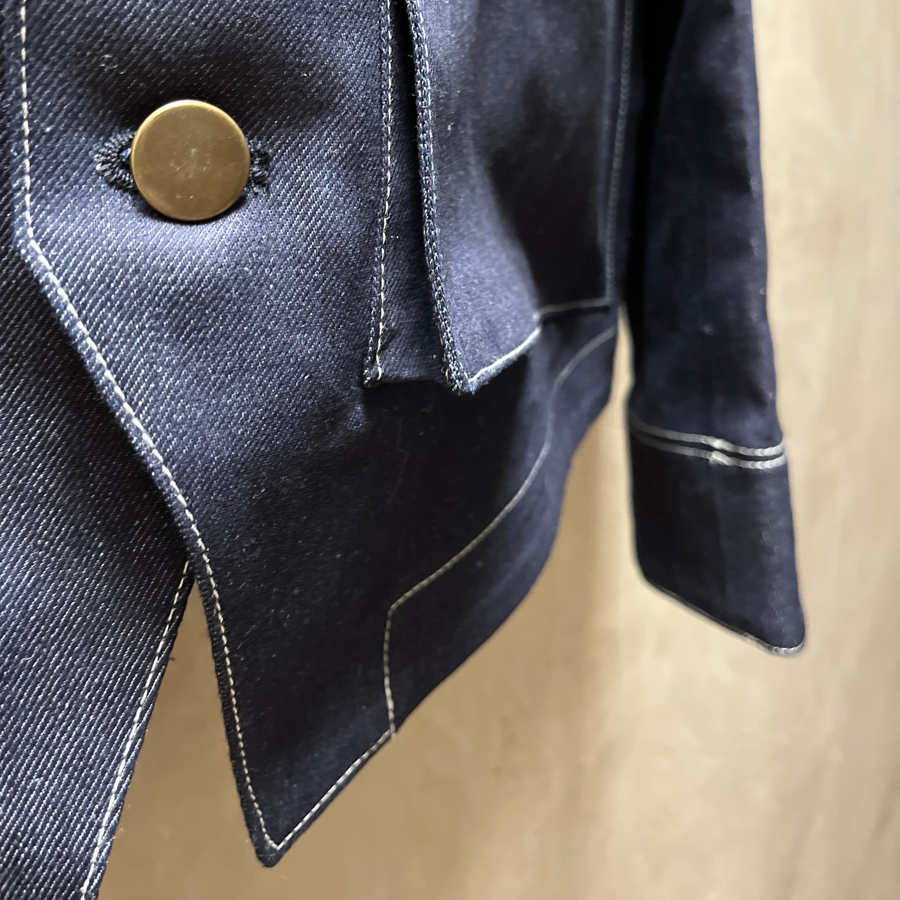 デニム生地に白いステッチがシャープな印象。