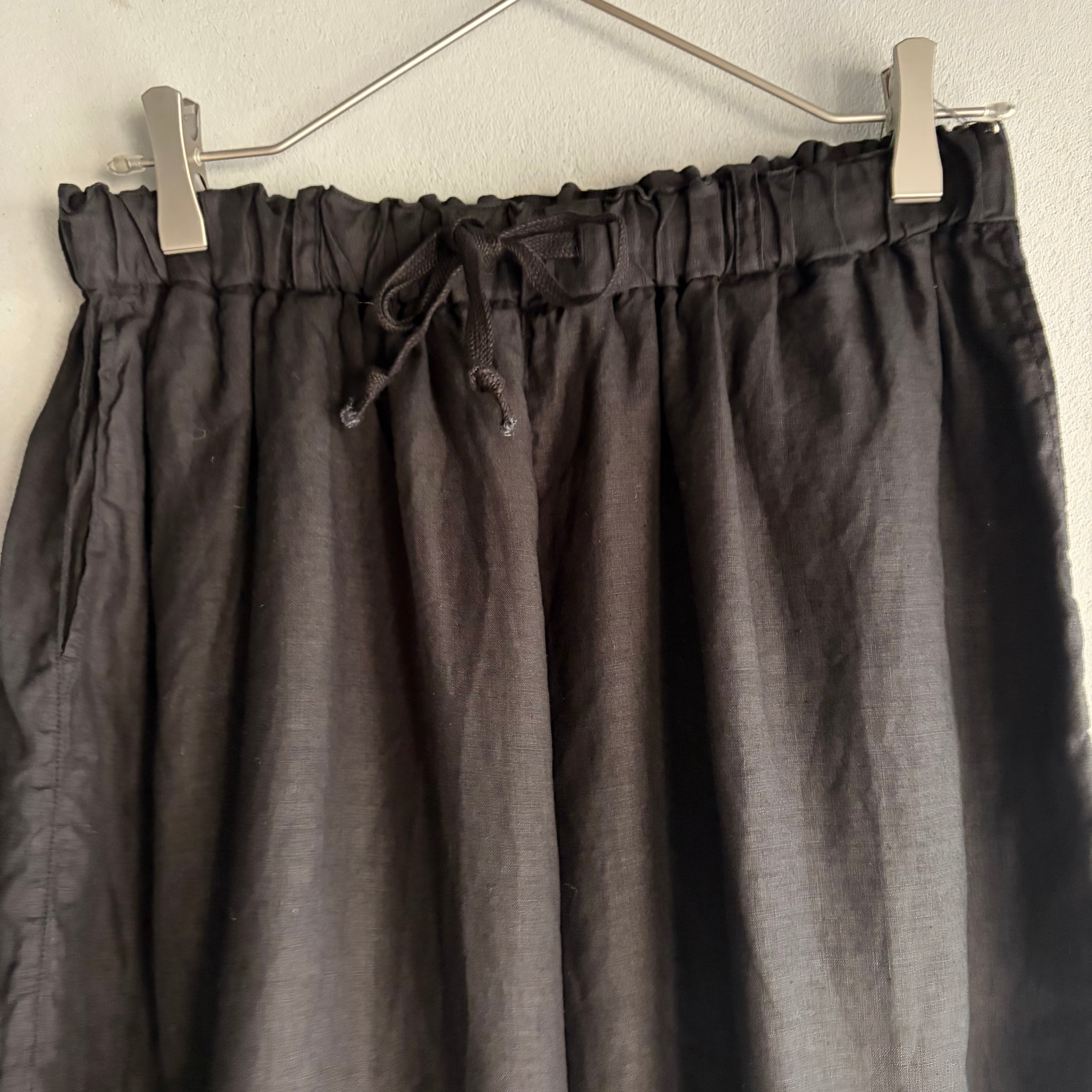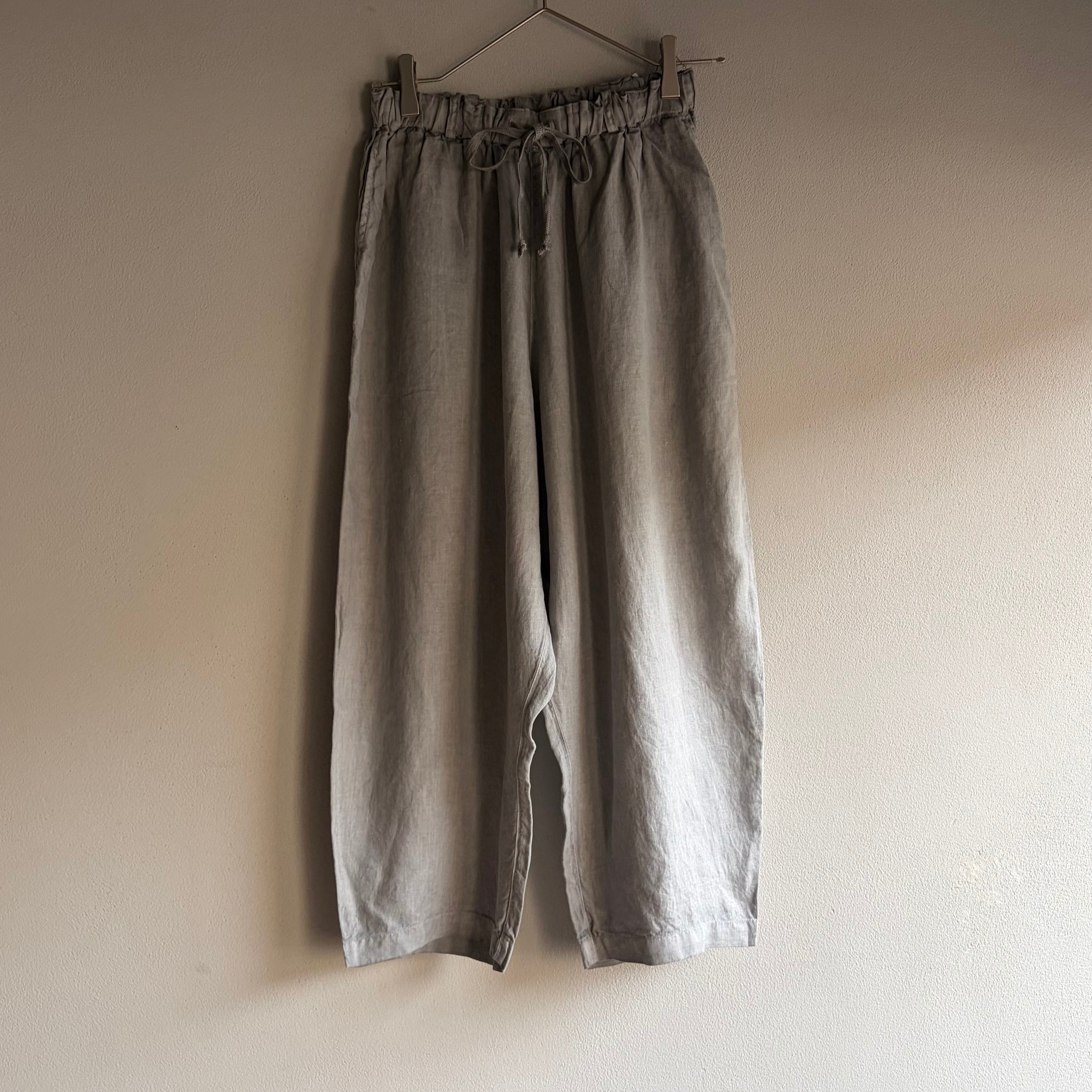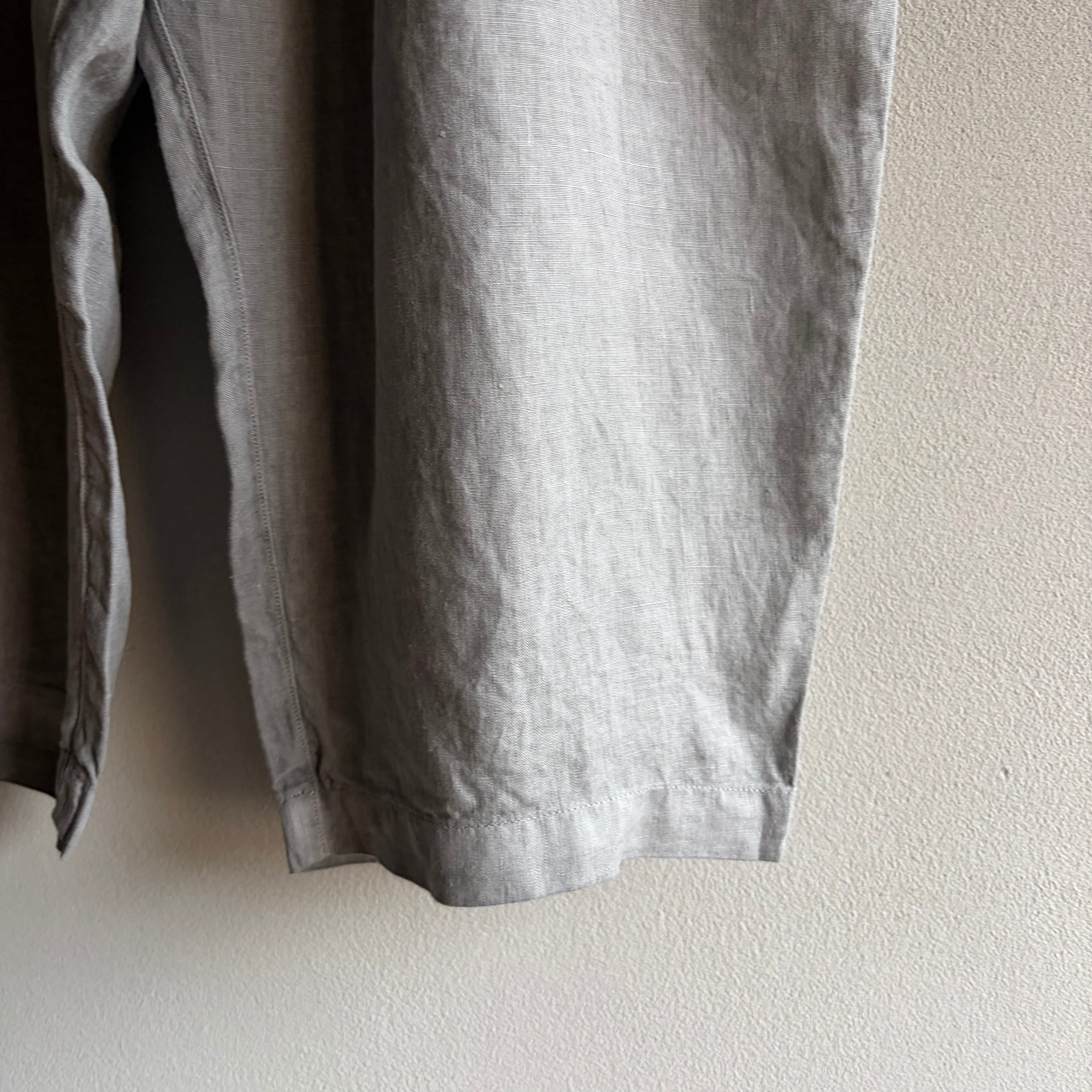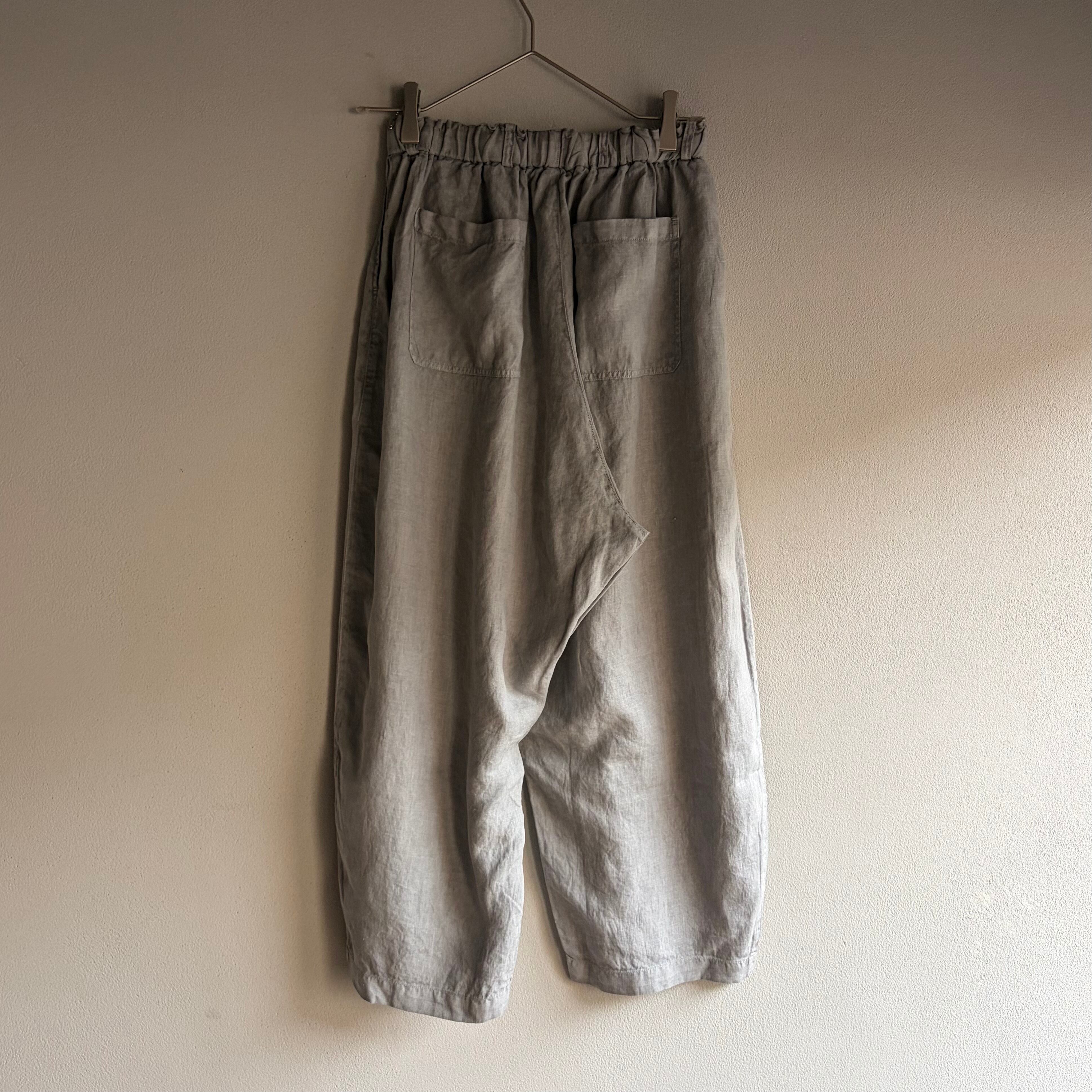 もんぺやたっつけをベースにしたパターンは、深い股上とゆとりのある設計で動きやすく、膝下からの強めのテーパードで軽快なシルエットのパンツです。
