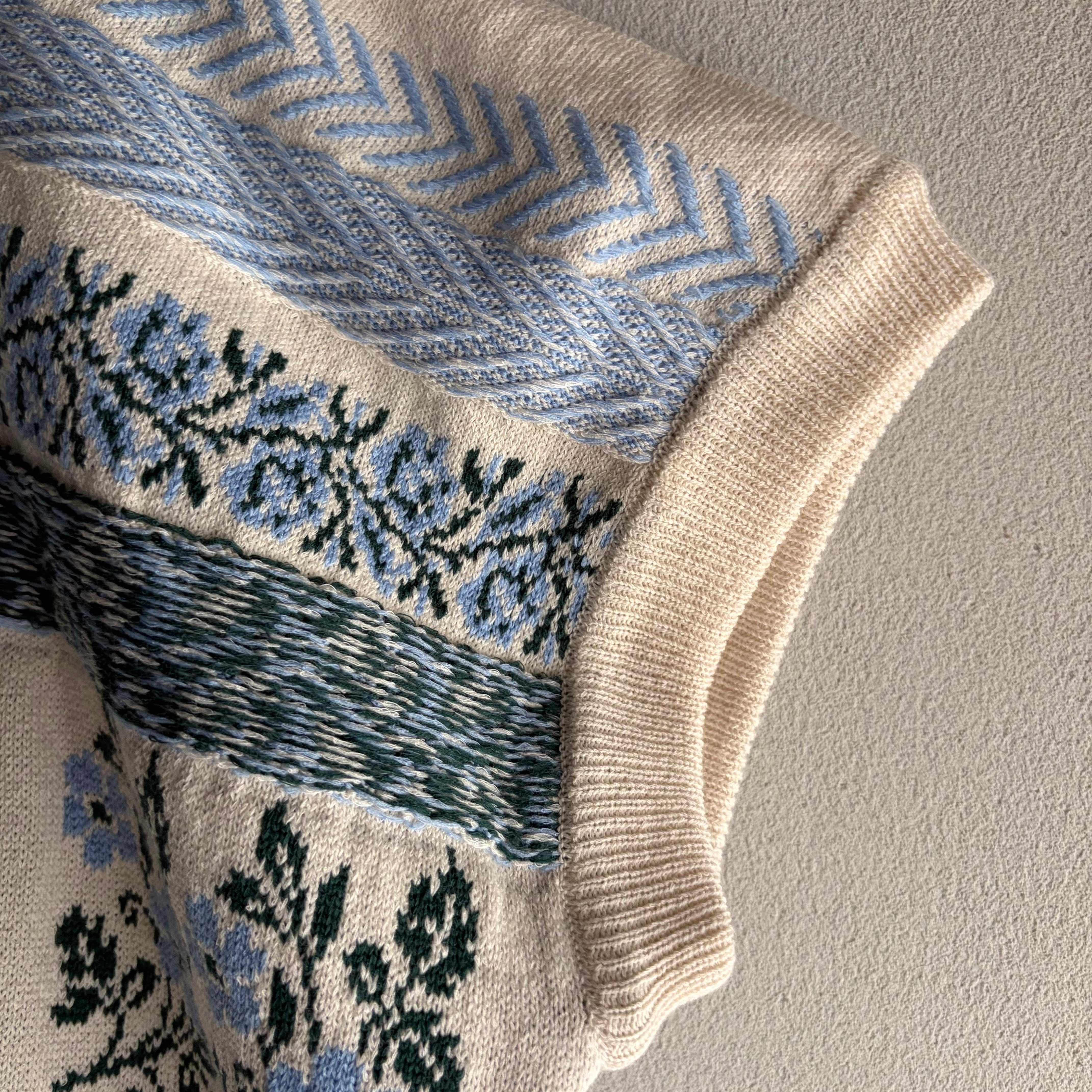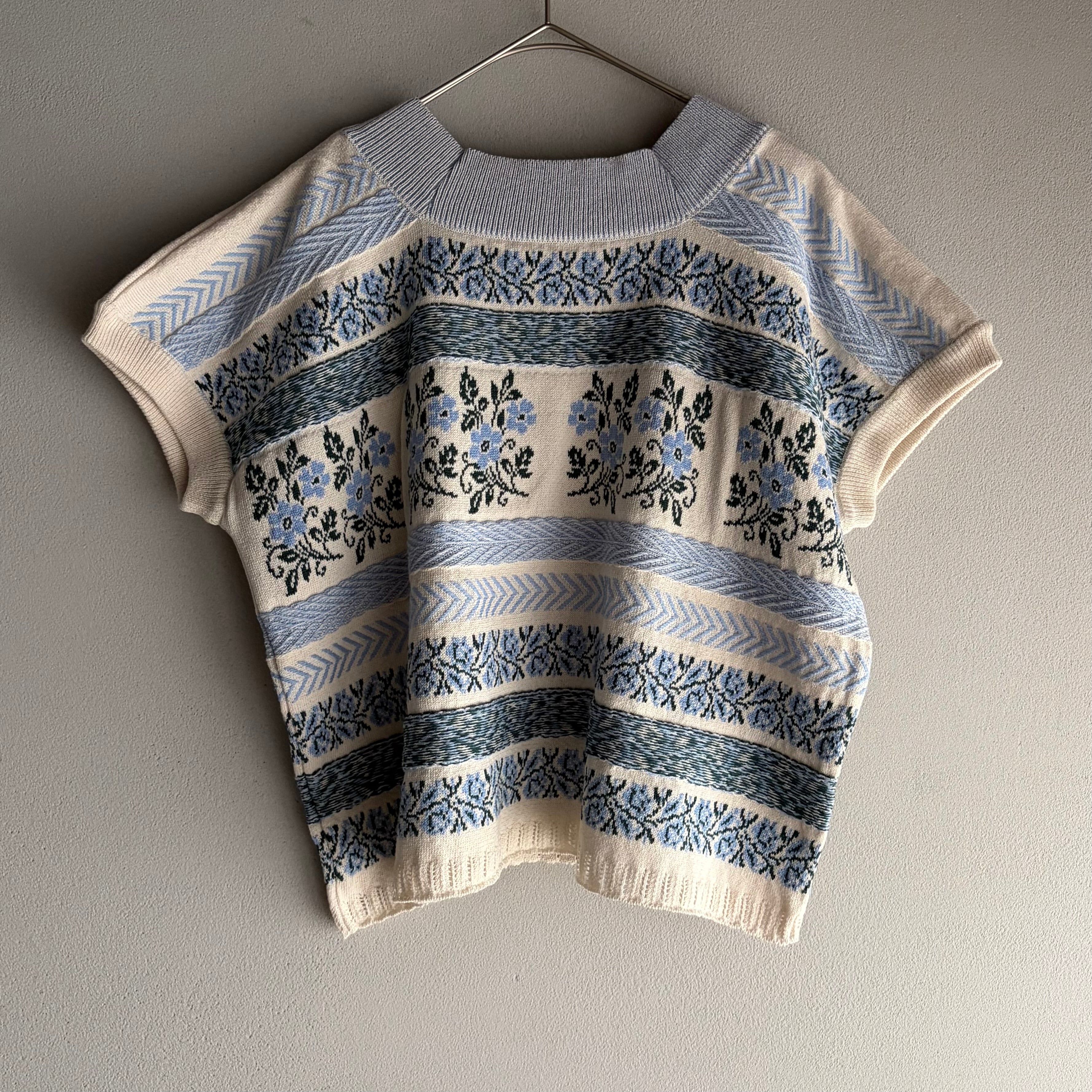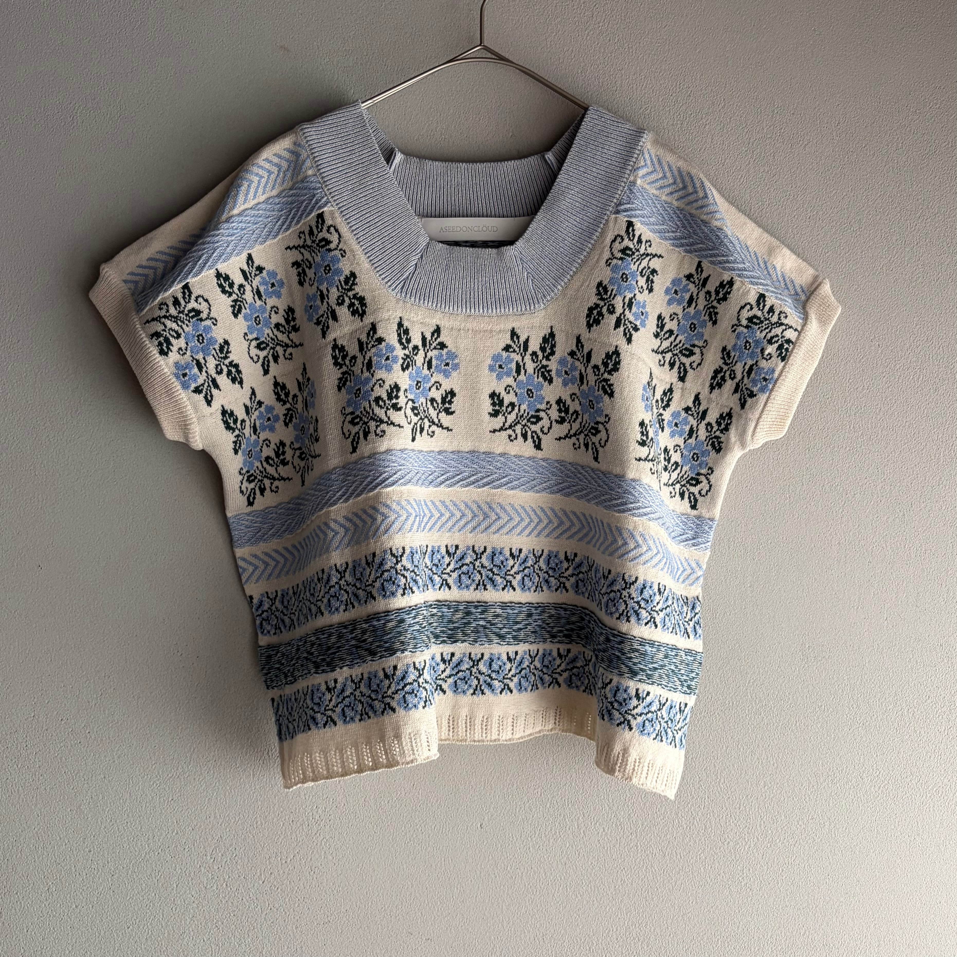オリジナルのフラワーモチーフをジャガードで丁寧に編み立てたニットブラウス。ナチュラルなOFF WHITEをベースに、淡いブルーとグリーンの配色が美しく浮かび上がり、どこか民族的で清涼感のある表情に仕上がっています。